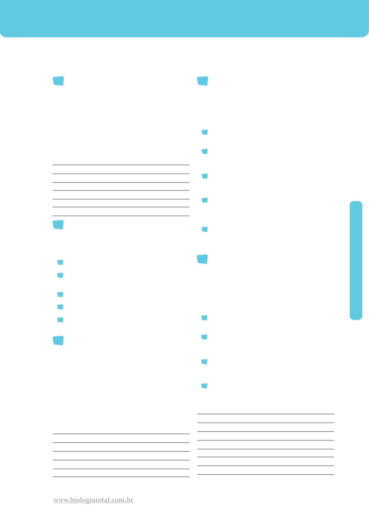 EX ER CÍ CI O S A PR O FU N D A D O S 33www.biologiatotal.com.br VITAMINAS 01 01 a 02 02 b 04 04 c 08 08 d 16 16 (UFPR 2014) Um problema do estilo de vida nas grandes cidades é que as pessoas, cada vez menos, tomam banhos de sol. Dentre fatores que podem decorrer desse problema está o aumento da predisposição à osteoporose, que é a descalcificação dos ossos, ou o raquitismo, em crianças. Qual a vitamina, cujo precursor é ativado por luz solar, envolvida nesses processos? Qual a função dessa vitamina na prevenção das doenças mencionadas acima? (UEM 2013) O termo lipídio designa alguns tipos de substâncias orgânicas cuja principal característica é a insolubilidade em água e a solubilidade em certos solventes orgânicos. Sobre esse assunto, é correto afirmar que a hidrólise de moléculas de lipídios produz ácidos graxos e glicerol. os lipídios exercem importante papel na estocagem de energia, na estrutura das membranas celulares e na ação hormonal. os fosfolipídios apresentam, além de ácido graxo e glicerol, um grupo fosfato. os lipídios são compostos orgânicos formados pela polimerização de ácidos carboxílicos de cadeias pequenas. os carotenoides são lipídios importantes para os animais, por participarem da formação da vitamina A. (UEM-PAS 2012) Uma das evidências da evolução biológica e da ancestralidade, comum aos seres vivos, é que todas as formas de vida possuem composição química semelhante. Considerando que na composição química das células encontramos dois grandes grupos de substâncias – inorgânicas e orgânicas –, assinale a(s) alternativa(s) correta(s). Carboidratos, proteínas e lipídios são exemplos de substâncias orgânicas encontradas nas células. A água e os sais minerais são exemplos de substâncias inorgânicas. Nos seres vivos, a água é a substância mais abundante, porém não pode ser considerada uma substância pura, uma vez que age como solvente de diversas outras substâncias presentes no organismo. Os fosfolipídios, um tipo especial de lipídios, são componentes das membranas celulares e, quimicamente, apresentam-se formados por um glicerídio combinado a um grupo fosfato. O metabolismo celular depende de uma série de reações químicas controladas por carboidratos e lipídios especializados, chamados enzimas. Essas substâncias são necessárias em grandes quantidades nas reações químicas do organismo, atuando como catalisadores. O ácido ascórbico, também conhecido como vitamina D, é importante para a síntese de colágeno, proteína essencial para a manutenção dos tecidos conjuntivos, como a cartilagem e a derme. (UFF 2008) A anemia falciforme é gerada a partir de uma mutação pontual no gene da cadeia β da hemoglobina, que se localiza no cromossomo 11. Nos indivíduos que apresentam esta doença, observa-se a troca de uma base nitrogenada no gene. Enquanto os indivíduos sadios apresentam um nucleotídeo T, nos indivíduos acometidos pela doença, este é substituído pelo nucleotídeo A. Que alteração ocorre na estrutura primária da hemoglobina sintetizada, a partir deste gene, em indivíduos com anemia falciforme? Que característica do código genético permite que um gene contendo uma mutação pontual por substituição possa, após a sua tradução, gerar a mesma proteína codificada pelo gene original (não-mutado)? Explique. Além da anemia falciforme, existem outros tipos de anemia como a anemia perniciosa, que é causada devido à carência de nutrientes. Identifique os nutrientes dos quais carecem os doentes com anemia perniciosa. Classicamente, sabe-se que indivíduos acometidos pela anemia falciforme podem ser refratários a uma doença parasitária causada por um protozoário. Identifique esta doença e sua principal forma de transmissão (UFG 2013) Em uma pesquisa, com 2.270 mulheres com idade entre 49 e 69 anos, realizada pela Federação Brasileira das Sociedades de Ginecologia e Obstetrícia, foi observado que 19% delas sofriam de osteoporose. Essa doença pode ser prevenida e tratada. Uma das medidas de profilaxia e tratamento é o uso de vitamina D. Disponível em: <http://revistaescola.abril.com.br/ensino-medio/ licao-chacoalhar-esqueleto-estudantes-431291.shtml>. Acesso em: 8 out. 2012. (Adaptado). Explique como se dá a ação da vitamina citada no texto na profilaxia da osteoporose. 93 94 96 97 95 34 EX ER CÍ CI O S A PR O FU N D A D O S (UFF 2006) A saúde de seres humanos, principalmente crianças, sofre danos quando ficam por um longo período na ausência de luz solar, podendo ser acometidos por uma avitaminose. Faz tempo, dei a um bebê doses de Mozart na mamadeira, Luiz Gonzaga como canções de ninar, Vivaldi e J.S. Bach, do maternal ao ensino médio. A boa alimentação musical deve começar na infância, ser completa, variada, incluindo degustação de produtos não perecíveis, para evitar avitaminose da alma. Dentre os direitos da criança deveria estar também a boa nutrição do espírito. (adaptado do texto “A novela de Bizet” escrito por Tereza Halliday e publicado no “Diário de Pernambuco”, 12 de junho de 2003). De que vitamina esses indivíduos ficariam carentes sob tais condições? Qual é o precursor de origem vegetal utilizado para a produção dessa vitamina, no corpo humano? Que alteração ou deformidade essa avitaminose pode causar a esses indivíduos? Por quê? (UFU 2006) Uma criança foi levada ao médico devido ao desenvolvimento físico deficiente em relação a seus colegas da mesma idade. Depois de examiná-la e analisar alguns exames, o médico indicou banhos de sol e a utilização de óleo de peixe em sua alimentação. Com base nessas informações, responda: Para qual patologia, que tenha por característica o desenvolvimento físico deficiente, tomar sol auxilia no tratamento? Qual vitamina está carente no organismo desta criança? Esta vitamina é lipossolúvel ou hidrossolúvel? Por que lhe foi indicado t