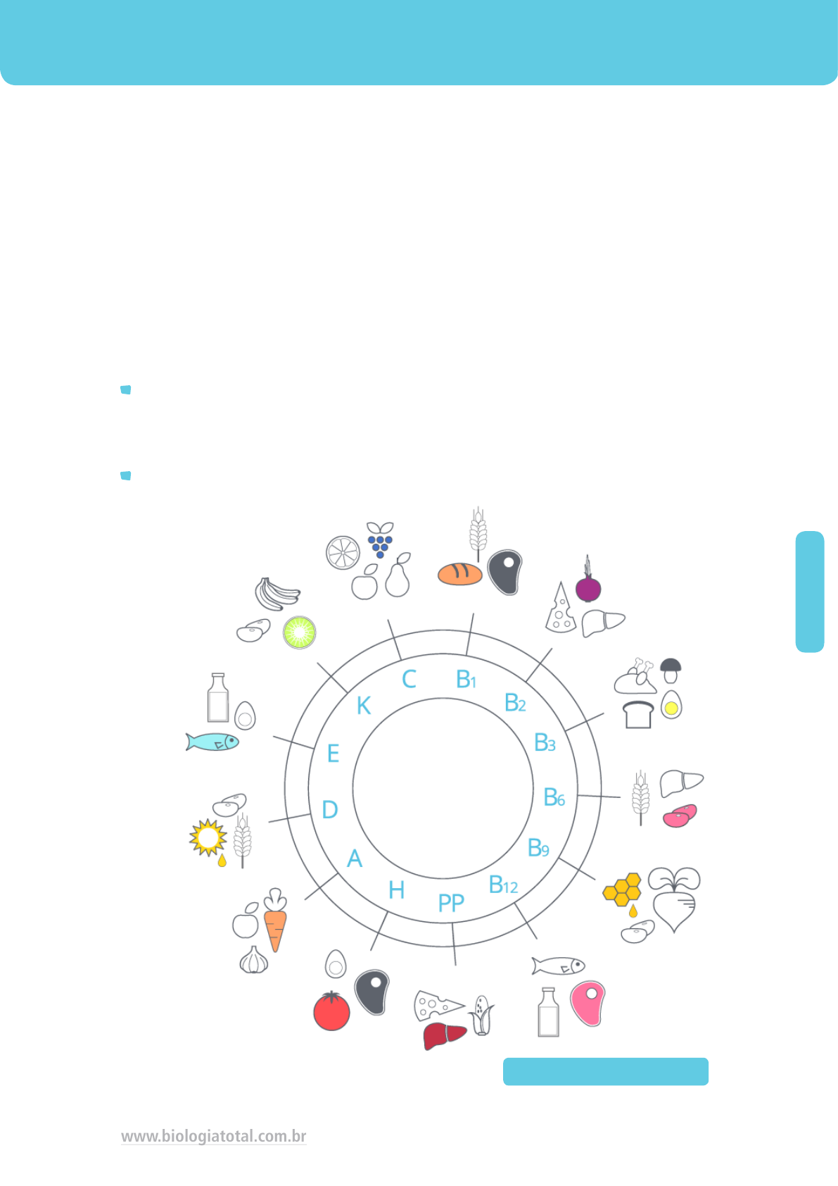 B IO Q U ÍM IC A 83www.biologiatotal.com.br VITAMINAS São substâncias orgânicas especiais que atuam em quantidades reduzidas, a nível celular, como desencadeadoras da atividade de muitas enzimas do metabolismo. São produzidas nas estruturas dos vegetais e de alguns seres unicelulares. Os animais devem obtê-las na alimentação sob a forma de provitaminas. AS VITAMINAS SÃO DIVIDIDAS EM: - Lipossolúveis: Solúveis apenas em lipídeos. Para serem absorvidas, é necessária a presença de lipídeos. São elas: A, D, E e K. - Hidrossolúveis: Solúveis em água. São elas: complexo B e C. O diagrama acima demonstra em que alimentos podem ser emconrtados diferentes vitaminas. A falta de determinada vitamina na dieta alimentar provoca um quadro conhecido como avitaminose, determinando alterações específicas no metabolismo humano. As vitaminas também tem papel muito importante na “limpeza” das células. Muitas têm papel de antioxidantes combatendo radicais livres, que são produtos da respiração celular. O aumento de radicais livres prejudica o DNA e é um dos responsáveis pelo envelhecimento celular. 84 B IO Q U ÍM IC A ABAIXO SEGUE UMA TABELA RELACIONANDO AS PRINCIPAIS VITAMINAS: Vitaminas Fontes Funções no Organismo Doenças LI PO SS O LÚ VE IS A (Re�nol) Fígado de aves, animais e cenoura. Combate a radicais livres; Formação dos ossos e pele; Funções da re�na. Hemeralopia; Xero�almia; Diminuição de glóbulos vermelhos; Formação de cálculos renais. D (Calciferol) Óleo de peixe, �gado, gema de ovos. Regulação do cálcio do sangue e dos ossos. Raqui�smo; Osteoporose. E (Tocoferol) Verduras, azeite e vegetais. An�oxidante que protege as células do organismo contra radicais livres. Dificuldades visuais; Alterações neurológicas. K (Filoquinona) Fígado e verduras. Atua na coagulação do sangue; Previne a osteoporose. Desnutrição; Má função do �gado; Problemas intes�nais. HI DR O SS O LÚ VE IS B1 (Tiamina) Cereais, carnes, verduras, levedo de cerveja. Atua no metabolismo energé�co dos açúcares. Beribéri. B2 (Riboflavina) Leites, carnes, verdura. Atua no metabolismo de enzimas; Proteção do sistema nervoso. Inflamações na língua; Anemias; Seborreia. PP ou B3 (Niacina) Ervilha, amendoim, fava, peixe, feijão, �gado. Manutenção da pele; Proteção do �gado; Regula a taxa de colesterol no sangue. Insônia; Dor de cabeça; Pelagra (derma�te, diarreia, depressão). B5 (Ácido Pantotênico) Fígado, cogumelos, milho, abacate, ovos, leite, vegetais. Metabolismo de proteínas, gorduras e açúcares. Fadigas; Cãimbras musculares. B8 (Bio�na) Carnes, legumes, verduras e bactérias Atua como coenzima em processos energe�cos da célula, na síntese de ácidos graxos e das bases nitrogenadas B9 (Ácido fólico) Frutas, cereais e vegetais verde Atua na síntese de DNA e RNA e da hemoglobina Anemia, redução do crescimento e problemas congênitos no feto Distúrbios neuromusculares e inaflamações na pele. B6 (Piridoxina) Carnes, frutas, verduras e cereais. Crescimento; Proteção celular; Metabolismo de gorduras e proteínas; Produção de hormônios. Seborreia; Anemia; Distúrbios de crescimento. B12 (Cianocobalamina) Fígado, carnes. Formação de hemácias; Mul�plicação celular. Anemia perniciosa. C (Ácido Ascórbico) Laranja, limão, abacaxi, kiwi, acerola, morango, brócolis, melão, manga. Fortalecimento do sistema imunológico; Combate a radicais livres; Aumento da absorção de ferro pelo intes�no. Escorbuto. B IO Q U ÍM IC A 85www.biologiatotal.com.br novo linknovo link https://bit.ly/2Ef9HY9 https://bit.ly/2Ef9HY9 86 EX ER CÍ CI O S (UPE-SSA 1 2016) O raquitismo é uma doença, que afeta o desenvolvimento dos ossos da criança, tornando-os frágeis e maleáveis, o que pode levar a deformidades ósseas. Está entre as doenças mais comuns nos países em desenvolvimento. É CORRETO afirmar que essa doença é causada principalmente pela deficiência da vitamina B1, encontrada em carnes, legumes e cereais integrais. C, encontrada em diversas frutas, especialmente as cítricas. A, encontrada no leite e derivados e nas carnes vermelhas. E, encontrada em vegetais, e pela baixa produção da flora intestinal. D, encontrada em laticínios, gema de ovo e vegetais, como também pela exposição insuficiente à luz solar. (CFTMG 2016) Nossa pele é rica em colecalciferol, o qual também pode ser obtido do fígado de peixe e da gema de ovo, por exemplo. Porém essa substância está inerte e, quando os raios ultravioletas do sol atingem nosso corpo, ela se transforma em sua forma ativa: a vitamina D. Um médico recomendou a um idoso que tomasse banhos de sol regularmente. Disponível em: < http://super.abril.com.br>. (Adaptado). Acesso em: 09 set. 2015. Essa recomendação é importante especialmente para idosos porque essa vitamina reduz a(o) ocorrência de icterícias. risco de câncer de pele. enfraquecimento ósseo. taxa de envelhecimento. (IFSP 2016) As vitaminas formam um grupo de substâncias importantes nos processos dos metabolismos de um organismo. As necessidades diárias deverão ser supridas através de uma alimentação variada. A falta de vitaminas pode causar doenças chamadas avitaminoses e sua ingestão muito além das doses recomendadas pode ser prejudicial, ocorrendo as hipervitaminoses. A vitamina __________ é necessária para a manutenção da integridade da pele e dos epitélios, tanto o respiratório, como o intestinal e urinário e atua na síntese de pigmentos da retina. Sua deficiência pode causar pele escamosa e seca e problemas de visão, entre estas a cegueira noturna. a a a b b b c c cd e d d e EXERCÍCIOS (IFSC 2016) Leia o texto com atenção e assinale a alternativa CORRETA. A vitamina (X) é produzida pelo próprio organismo, com o auxílio da luz solar e interage com hormônios que regulam a quantidade de cálcio no organismo. Quando uma pessoa se expõe ao sol, os raios ultraviole