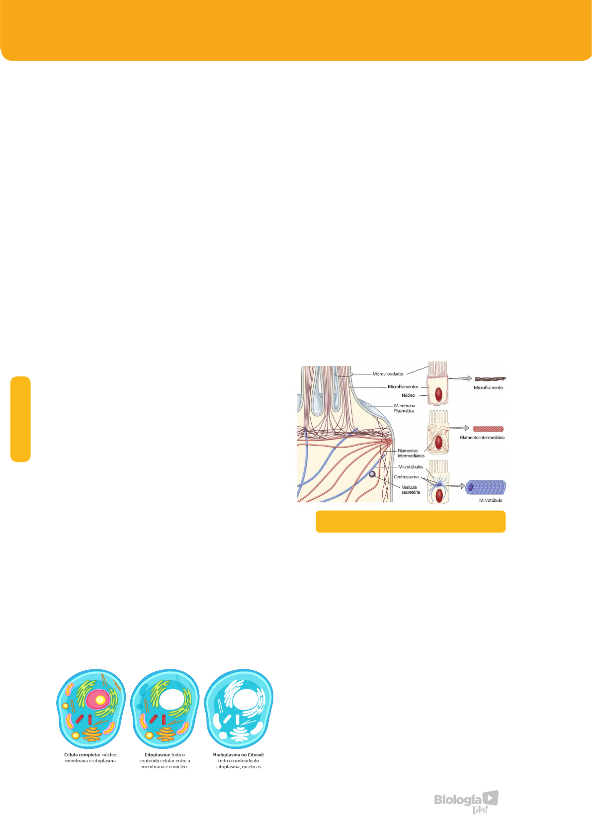 24 CI TO LO G IA CITOPLASMA Quando se descreve uma célula nos seus componentes fundamentais, falamos em membrana plasmática, citoplasma e núcleo. Já fizemos um estudo da membrana e suas particularidades. Vimos ainda, quando diferenciamos célula procarionte da célula eucarionte que, todas as células possuem citoplasma. Os citologistas costumam dividir o citoplasma em duas partes, para fins de estudo: o hialoplasma e as organelas. HIALOPLASMA Material gelatinoso que preenche o interior da célula. Quimicamente, o hialoplasma está formado por água e proteínas, principalmente, além das demais substâncias orgânicas e sais minerais já vistos anteriormente, como glicose, lipídeos, aminoácidos, etc. Podemos observar no hialoplasma uma região mais externa, o ectoplasma, geralmente mais denso, sendo denominado de gel. Observa-se também, uma região mais interna, o endoplasma, geralmente mais fluido, no estado de sol. A parte sol do hialoplasma realiza um movimento orientado, geralmente circular, ao redor do núcleo, chamado ciclose, facilmente observado em células vegetais. Outro tipo de movimento realizado pelo hialoplasma é o movimento ameboide, do qual resultam os pseudópodos, observados em glóbulos brancos e protozoários. Célula completa: núcleo, membrana e citoplasma. Citoplasma: todo o conteúdo celular entre a membrana e o núcleo. Hialoplasma ou Citosol: todo o conteúdo do citoplasma, exceto as organelas. ORGANELAS Sempre é bom lembrar que quando falamos em organelas celulares, referimos a uma célula eucarionte, já que as células procariontes possuem apenas os ribossomos, responsáveis pela síntese proteica. Já as células eucariontes apresentam diversas organelas responsáveis pelo metabolismo celular. 1. Citoesqueleto: constituído por microtúbulos e microfilamentos de proteínas contráteis, o citoesqueleto é responsável pelos movimentos do citoplasma, bem como ao batimento de cílios e flagelos e a migração dos cromossomos durante a divisão celular. 2. Ribossomos: são estruturas compostas por RNA e proteínas, distribuídas em duas subunidades sobrepostas. Os ribossomos podem se apresentar livres no citoplasma, isolados, presos à superfície do RE rugoso ou então presos uns aos outros por uma fita de RNA. Nesse caso, são chamados polissomos ou polirribossomos. É nos ribossomos que ocorre a síntese proteica. 3. Mitocôndrias: são organoides presentes em todas as células eucarióticas, animais e vegetais. As mitocôndrias, assim como os cloroplastos, possuem seu próprio DNA, alguns ribossomos e a capacidade de autoduplicação. As diferentes composições e conformações do citoesqueleto. Cada tipo de citoesqueleto acaba tendo uma função na célula. CI TO LO G IA 25www.biologiatotal.com.br 7. Aparelho de Golgi ou Golgiossomo: É um conjunto de sacos membranosos achatados que chamamos de cisternas e que ficam empilhados como pratos. Geralmente um complexo de Golgi possui entre 6 e 20 cisternas. Quando o aparelho de Golgi tem poucas cisternas (aproximadamente 5 cisternas), o que é muito comum nas células vegetais, ele recebe o nome de dictiossomo. Suas funções são muito variadas: armazenamento de substâncias: muitas das proteínas e demais substâncias sintetizadas na célula, migram até o aparelho de Golgi e são armazenados no interior de suas vesículas. organização do acrossomo nos espermatozoides: o acrossomo contém enzimas que têm a função de promover a perfuração do invólucro do óvulo por ocasião da fecundação. Situa-se na cabeça do espermatozoide. síntese de moléculas complexas: os monossacarídeos obtidos dos alimentos são transformados em polissacarídeos e esses combinam-se com determinadas proteínas dando origem a glicoproteínas. 4. Plastos: um tipo de organela característica das células vegetais. Eles podem conter pigmentos ou substâncias de reserva. Os plastos coloridos pela presença de pigmentos são chamados cromoplastos e, destes, os mais numerosos e importantes são os cloroplastos, nos quais ocorrem as reações da fotossíntese, pois possuem o pigmento verde clorofila. 5. Centríolos: têm a forma de bastonetes e ocupam, normalmente, uma posição próxima ao núcleo celular. Ao microscópio eletrônico cada centríolo aparece formado por nove trincas de microtúbulos de proteína, ligados entre si e dispostos de maneira a formar um cilindro. Em geral, há dois centríolos por célula, dispostos perpendicularmente. Os centríolos atuam na formação de cílios e flagelos e, durante a divisão celular, orientam os cromossomos e formam o fuso 6. Retículo endoplasmático: é uma complexa rede de canais e vesículas membranosas, formando um verdadeiro labirinto. Os retículos endoplasmáticos estão presentes em todas as células eucariontes. O RE é responsável pela circulação e armazenamento das substâncias dentro da célula. O RE pode ser dividido em: Retículo Endoplasmático Liso (REL) ou Agranular: Formado por uma rede de tubos cilíndricos e são desprovidos de ribossomos em sua superfície. Por conta disso, ele não participa da síntese de proteínas. O retículo endoplasmático liso é uma região de intensa síntese de lipídeos. É no aqui que são produzidos ácidos graxos, os fosfolipídeos da membrana plasmática, assim como os esteroides, como por exemplo, a testosterona. Retículo Endoplasmático Rugoso (RER) ou Granular: Também chamado de Ergastoplasma, é formado por uma rede de tubos achatados e possuem ribossomos aderidos à sua superfície. São responsáveis pela síntese de proteínas. Vesículas de Transferência Vindas do RER Face de Formação Face de Maturação Região Interna (Lúmen) Cisternas Vesículas Secretoras deixando a rede de maturação Aparelho de Golgi 8. Lisossomos: o termo lisossomo significa “corpo que quebra” (lise = quebra, soma = corpo). São pequenas vesículas que contêm enzimas digestivas de todos os tipos, cuja função é digerir ma