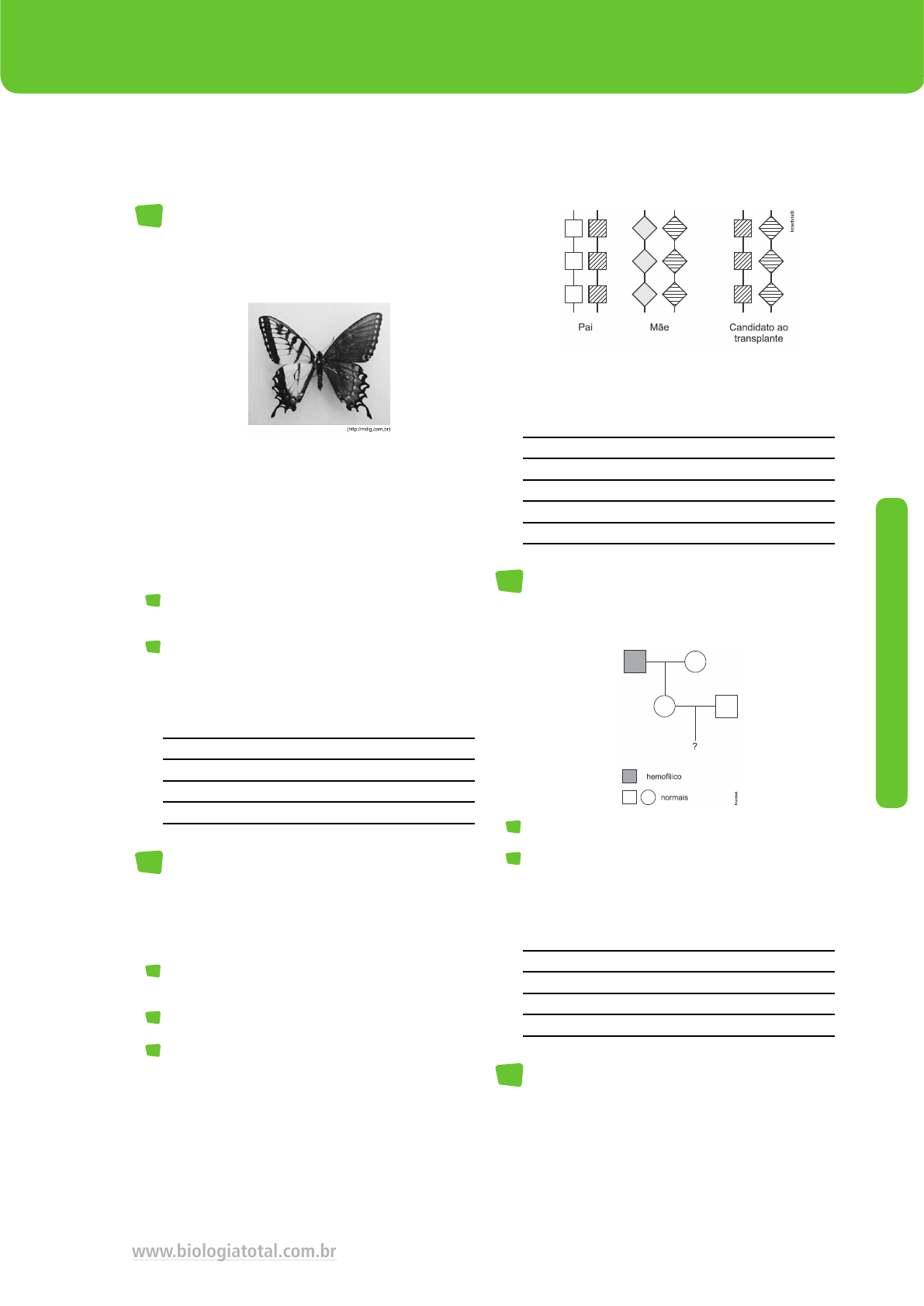 EX ER CÍ CI O S PA R O FU N D A D O S 19www.biologiatotal.com.br a a a b b b c 44 45 46 HERANÇA SEXUAL 47 (UNICID 2017) A fotografia mostra uma borboleta ginandromorfa bilateral, em que a metade esquerda de seu corpo apresenta constituição cromossômica de um macho e a metade direita apresenta constituição cromossômica de uma fêmea. Existem algumas explicações para a formação de animais ginandromorfos, como anomalias relacionadas à fecundação e às primeiras divisões mitóticas do zigoto. O animal da figura não apresenta nenhuma alteração cromossômica numérica em suas células e o sistema de determinação sexual das borboletas é o sistema ZW. Gônadas situadas no lado direito dessa borboleta produzirão quais células? Essas células portarão quais cromossomos sexuais? Considerando que tenha ocorrido alguma anomalia envolvendo os cromossomos sexuais nas primeiras divisões mitóticas desse animal, a característica ginandromorfa bilateral foi determinada anteriormente ou posteriormente à sua metamorfose? Justifique sua resposta. (FUVEST 2017) Um homem recebeu, quando recém- nascido, o diagnóstico de síndrome da imunodeficiência combinada grave, com herança recessiva ligada ao cromossomo X. Aos dois meses de idade, foi submetido a transplante de células-tronco obtidas de medula óssea e não apresenta mais os sintomas da doença. Existe possibilidade de esse homem transmitir o alelo mutante, que causa a doença, para as crianças que vier a ter? Justifique sua resposta. Como o transplante de células-tronco de medula óssea pôde levar à cura da doença? A identidade quanto aos antígenos do sistema HLA (Human Leukocyte Antigen) é avaliada para que se determine a compatibilidade entre um doador e um receptor de medula óssea. Esses antígenos são determinados por um conjunto de genes ligados (haplótipo) localizados no cromossomo 6. São representados, a seguir, o genótipo de um candidato a transplante de medula óssea e os genótipos de seus genitores, quanto a esse haplótipo. Esse candidato ao transplante pode ter maior identidade de haplótipos com um irmão do que com seus genitores? Justifique sua resposta. (UNIFIMES 2016) A hemofilia é uma anomalia ligada ao sexo, condicionada por um alelo recessivo h localizado no cromossomo X. A figura ilustra um heredograma em que um dos homens é hemofílico. Qual é o genótipo da filha desse homem hemofílico? Qual é a probabilidade de ela gerar um menino hemofílico? Em uma população, a probabilidade de que sejam encontradas mulheres hemofílicas é menor do que a probabilidade de que sejam encontrados homens hemofílicos. Explique essa afirmativa, contemplando os dois sexos. (FAC. SANTA MARCELINA 2016) Raquel está gestando um casal de gêmeos. O pai dos bebês é seu primo, filho da irmã da mãe de Raquel. O único irmão de Raquel morreu ainda jovem, portador da Distrofia de Duchenne, uma doença genética recessiva, degenerativa e incapacitante, ligada ao sexo. 20 EX ER CÍ CI O S A PR O FU N D A D O S 50 51 52 01 02 04 08 16 49 Qual a probabilidade de o menino vir a desenvolver a doença? Qual a probabilidade de a menina vir a desenvolver a doença? Se Raquel estivesse grávida de outro rapaz, não aparentado a ela e em cuja família não houvesse histórico da doença, a probabilidade de os gêmeos virem a desenvolver a doença estaria diminuída? Justifique sua resposta. (UNESP 2016) Em moscas de frutas Drosophila melanogaster, o sexo é determinado segundo o sistema XY. A cor dos olhos nessa espécie é determinada por alelos localizados no cromossomo X. O alelo dominante B confere cor vermelha aos olhos da mosca e o alelo recessivo b, cor branca. O cruzamento de uma fêmea de olhos vermelhos com um macho de olhos vermelhos resultou em uma geração constituída por 75% de indivíduos de olhos vermelhos e 25% de olhos brancos. Determine o genótipo da fêmea deste cruzamento e o sexo dos descendentes de olhos brancos. Em outro cruzamento, uma fêmea de olhos brancos foi fecundada por um macho de olhos vermelhos. Dos descendentes obtidos, foi realizado o cruzamento de uma fêmea com um macho, que deu origem a uma população de 100 indivíduos. Qual a porcentagem de machos de olhos brancos e a porcentagem de fêmeas de olhos brancos esperadas nessa população? (EBMSP 2016) Um casal de homens brasileiros acabou de chegar do exterior, onde iniciaram um processo de gravidez por substituição – barriga de aluguel – e disseram que não pagaram pelos óvulos. Eles tiveram a ideia de como juntar características genéticas das duas famílias, utilizando o óvulo da irmã de um deles e os espermatozoides do outro. Suponha que os heredogramas a seguir representem a expressão de uma característica que tem herança recessiva ligada ao sexo nas famílias desses dois homens, II – 2 e II – 3, e que II – 1 é a tia doadora do óvulo. Com base nessas informações e nos conhecimentos da genética, indique: a probabilidade de esse bebê expressar a característica, justificando sua resposta. os possíveis genótipos dessa criança se ela apresentar essa característica. (UEM 2015) Sobre as variações da expressão gênica, é correto afirmar que: Em ervilhas o mesmo gene que condiciona a cor da casca da semente também determina a cor da flor e a presença de manchas roxas nas estípulas foliares, ou seja, um caso de pleiotropia. A expressividade de um gene pode ser definida como o fenótipo que ele expressa. Em certos casos, o mesmo tipo de alelo expressa-se de maneira diferente nos seus diversos portadores. Fala-se, então, em expressividade gênica variável. A expressividade gênica variável, a penetrância gênica e a pleiotropia, são exemplos de variações da expressão gênica. A hemofilia e o daltonismo são causados por uma combinação de fatores genéticos, dentre eles a penetrância e a expressividade gênicas. Na espécie humana, a polidactilia (presença de dedo extranumerário) 
