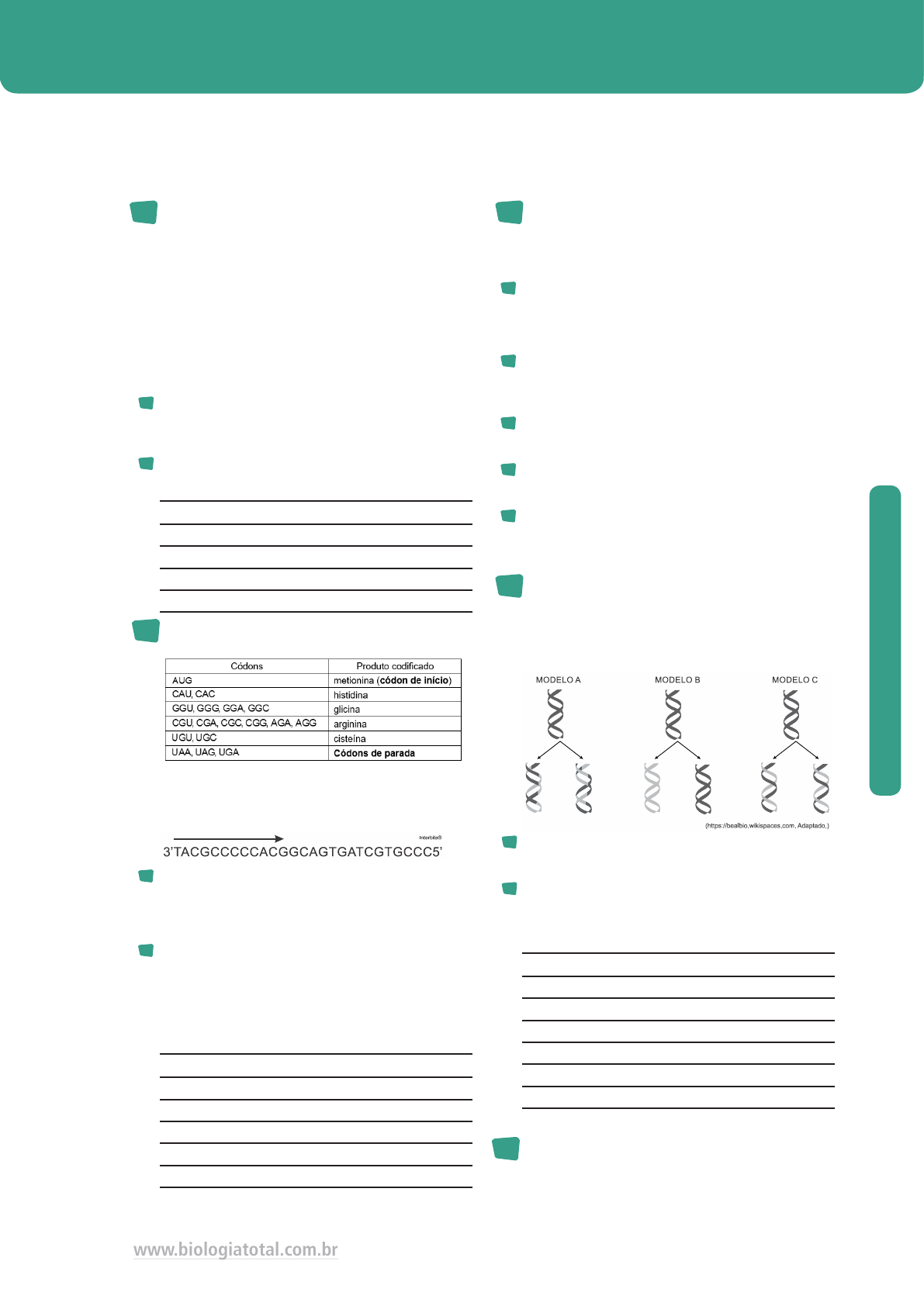 EX ER CÍ CI O S A PR O FU N D A D O S 17www.biologiatotal.com.br SINTESE PROTEICA a a a 01 b b b 02 04 08 16 45 46 47 48 49 (Ufpr 2017) Uma cultura de bactérias idênticas, todas contendo apenas uma molécula de DNA, é colocada em um meio de cultura no qual os nucleotídeos são marcados radioativamente. Elas são mantidas nesse meio por dois ciclos de divisão celular; ou seja, cada bactéria terá originado quatro bactérias- filhas. Depois, são mantidas por mais um ciclo de divisão em um meio com nucleotídeo não radioativo. Cada molécula de DNA é formada por duas cadeias polinucleotídicas enroladas helicoidalmente. A partir de uma bactéria dessa colônia, quantas cadeias polinucleotídicas conterão marcação radioativa e quantas cadeias não conterão marcação radioativa ao final dos três ciclos? Explique o motivo de sua resposta no item anterior. (Unisa - Medicina 2017) Analise a tabela, que contém uma parte do código genético. Considere um segmento de DNA com a seguinte sequência de bases nitrogenadas, em que a seta indica o sentido da transcrição: Suponha que um ribossomo traduziu o RNA mensageiro sintetizado a partir desse segmento de DNA, quantos aminoácidos são codificados por este ribossomo? Cite o nome do último aminoácido que fará parte da molécula transcrita. Caso ocorra uma mutação e a décima quinta base nitrogenada seja substituída pela base timina (T), qual será o anticódon do RNA transportador que se emparelha com o códon codificado após a mutação? De acordo com a propriedade do código genético, explique por que essa mutação pode ser considerada silenciosa. (Uepg 2016) James Watson e Francis Crick resolveram a estrutura do DNA em 1953, rendendo-lhes inclusive um prêmio Nobel. Em relação às características desta molécula, assinale o que for correto. Uma mutação em uma única base nitrogenada não é capaz de prejudicar a estrutura de uma proteína e levar a manifestação de uma doença. Já as mutações cromossômicas, por exemplo, trissomia do 21, são extremamente graves. A replicação do DNA é dita semiconservativa, sendo que cada uma das fitas é utilizada como molde para a síntese de uma fita complementar, polimerizada pela enzima DNA polimerase. O DNA é uma molécula constituída por nucleotídeos organizados em fita única, os quais se unem por ligações denominadas pontes de hidrogênio. O DNA é constituído por vários nucleotídeos em sequência, os quais são formados por um grupo fosfato, uma base nitrogenada e uma pentose, a desoxirribose. Uma sequência de DNA, denominada gene, pode ser transcrita em moléculas de RNA pela enzima RNA polimerase, processo denominado de transcrição. (Unicid - Medicina 2016) Após a descoberta da estrutura da molécula de DNA, surgiram três modelos para explicar como ocorre sua duplicação. A figura ilustra três possíveis modelos de duplicação da molécula de DNA. Dos modelos apresentados, qual deles representa a duplicação da molécula de DNA proposto por Watson e Crick? Justifique sua resposta. Em que fase do ciclo celular mitótico ocorre a duplicação da molécula de DNA? Por que a célula precisa realizar esse processo? Ufu 2016) Observe a tabela a seguir. 18 EX ER CÍ CI O S A PR O FU N D A D O S 51 50 a a a c b b b 52 Abreviatura dos aminoácidos: Phe=fenilalanina; His=histidina; Leu=leucina; Gin=glutamina; Ile=isoleucina; Asn=aspargina; Met=metionina; Lys=lisina; Val=valina; Asp=ácido aspártico; Ser=serina; Glu=ácido glutâmico; Pro=prolina; Cys=cisteína; Thr=treonina; Trp=triptofano; Ala=alanina; Arg=arginina; Tyr=tirosina; Gly=glicina. *A abreviatura Pare corresponde aos códons de parada. Considere a seguinte sequência de bases nitrogenadas do DNA: TAG GCT AAT GCT CGT ATT A partir das informações apresentadas, responda: Qual será a sequência de bases nitrogenadas na duplicação do DNA? A transcrição gênica formará quantos códons e quais são eles? A tradução sintetizará quais aminoácidos? (Usf 2016) Uma equipe de investigadores da Universidade de Aveiro (UA) quebrou uma das regras sagradas da biologia: o código genético não é imutável. Estes investigadores descobriram que o fungo patogênico Candida albicans utiliza um código genético diferente do dos outros seres vivos e conseguiram compreender como é que este fungo o alterou e, agora, conseguiram realizar a primeira alteração artificial em laboratório. A investigação dos doutorandos Ana Rita Bezerra e João Simões, sob coordenação de Manuel Santos, professor do Departamento de Biologia da UA e investigador do Centro de Estudos do Ambiente e do Mar (CESAM), decorreu ao longo dos últimos quatro anos e foi agora publicada na «Proceedings of the National Academy of Sciences» (PNAS). Disponível em: <http://www.cienciahoje.pt/index. php?oid=57972&op=a> Acesso em: 02/10/2015, às 10h02min. Com base no texto, responda ao que se pede. O código genético define as regras químicas que os seres vivos utilizam na tradução da informação dos seus genes. Uma vez alterado o código genético, o resultado da tradução também é modificado. Qual a importância de cada códon? Qual o produto modificado resultante da tradução? Imagine que o produto da tradução do código genético foi sintetizado no pâncreas e deve ser utilizado em outro lugar do organismo. Uma vez que a biossíntese foi acompanhada nas células com a marcação de isótopos radiativos das unidades constituintes (monômeros) do referido produto, qual a sequência de estruturas citoplasmáticas você espera encontrar nas unidades marcadas, respectivamente? (Uerj 2015) Considere uma molécula de DNA sem qualquer mutação e que apresente 16% de bases nitrogenadas de citosina. Determine os percentuais de guanina e de timina encontrados nessa molécula, justificando suas respostas. (Unifesp 2015) Alguns antibióticos são particularmente usados em doenças causadas por bactérias. A tetraciclina é um de