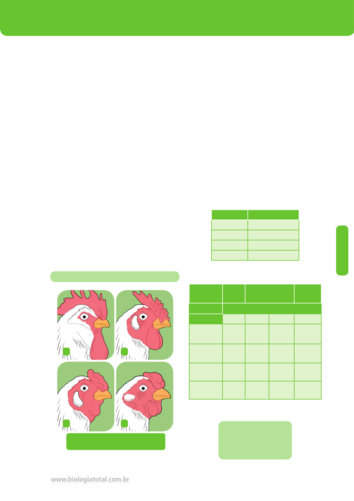 G EN ÉT IC A 65www.biologiatotal.com.br INTERAÇÕES GÊNICAS Forma da crista em galináceos, um exemplo de in- teração não epistática: 1) Crista simples; 2) Crista Rosa; 3) Crista ervilha 4) Crista noz INTERAÇÃO NÃO EPISTÁTICA OU GENES COMPLEMENTARES Muitos genes não agem sozinhos na determinação de um caráter, mas interagem com outros genes não-alelos. Nesses casos, fala-se em interação gênica. Ela ocorre quando um caráter é condicionado pela ação conjunta de dois ou mais pares de genes não alelos, com segregação independente. Nas diversas raças de galinhas encontramos quatro tipos de crista: rosa, ervilha, noz e simples. Cruzando um galo de crista rosa com uma galinha de crista ervilha produz-se uma F1 com crista noz. Se as aves de crista noz são acasaladas, obtém-se uma F2 com os quatro tipos de crista, na seguinte proporção: 9/16 noz : 3/16 rosa : 3/16 ervilha : 1/16 simples 1 2 3 4 Na determinação do tipo de crista interagem dois pares de alelos: Rr e Ee. A crista rosa é determinada pela interação de pelo menos um gene R com dois recessivos p. A crista ervilha é resultante de dois r recessivos interagindo com pelo menos um E dominante. A crista noz é causada pela combinação de pelo menos dois genes dominantes, um R e um E. A interação dos recessivos (rree) produz a crista simples. Assim, temos: Genótipos Fenótipo R_E_ noz rrE_ ervilha R_ee rosa rree simples O cruzamento ficaria assim: P1 RRee (Rosa) x rrEE (ervilha) F1 RrEe (noz) (gametas)) RE Re rE re RE RREE (Noz) RREe (Noz) RrEE (Noz) RrEe (Noz) Re RREe (Noz) RRee (Rosa) RrEe (Noz) Rree (Rosa) rE RrEE (Noz) RrEe (Noz) rrEE (Ervilha) rrEe (ervilha) re RrEe (Noz) Rree (Rosa) rrEe (ervilha) rree (Simples) Teremos em F2: 9/16 – crista noz (R_E_) 3/16 – crista ervilha (rrE_) 3/16 – crista rosa (R_ee) 1/16 – crista simples (rree) 66 G EN ÉT IC A Geração F2 de um cruzamento entre ratos pretos EPISTASIA (INIBIÇÃO) Este é um tipo de interação gênica, na qual um gene, denominado epistático, impede a manifestação de outro gene, não-alelo, chamado de hipostático. O efeito da epistasia é semelhante àquele da dominância, exceto pelo fato de que a última se verifica entre dois alelos, enquanto a epistasia ocorre entre não-alelos. A epistasia pode ser exercida por um gene dominante ou por um gene recessivo. a) Epistasia Dominante – tomemos como exemplo a cor da moranga. Temos frutos brancos, amarelos e verdes. O gene V condiciona o caráter amarelo, seu alelo v produz verde. O gene E é epistático em relação aos genes V e v, de modo que basta a presença do gene E para o fruto ser branco. Assim, temos: Genótipos Fenótipo E_V ou E_vv Fruto Branco eeV_ Fruto Amarelo eevv Fruto Verde b) Epistasia Recessiva – neste caso, o gene que impede a manifestação e outro é um gene recessivo. Em ratos, a coloração pode ser aguti, preta e albina. O gene P condiciona a pelagem preta enquanto seu alelo p condiciona a pelagem aguti (cinzento). O gene C permite a manifestação do gene P, enquanto seu alelo c é epistático, impedindo a manifestação da cor, formando ratos albinos. Observe o quadro: Genótipos Fenótipo C_P_ Negro C_pp Aguti ou Cinzento ccP_ , ccpp Albino Vamos então exemplificar: De um cruzamento entre um casal de ratos cinzentos duplo-heterozigotos (CaPp), teríamos como resultado: Observe que chegamos à seguinte proporção: 9 pretos : 3 aguti : 4 brancos C_P_ C_pp ccP_ Existem casos de epistasia resultantes da ação de dois genes dominantes (Epistasia duplo-dominante) ou de dois genes recessivos (Epistasia duplo-recessiva). HERANÇA QUANTITATIVA (POLIGÊNICA) Neste caso, dois ou mais pares de genes atuam sobre o mesmo caráter, apresentando efeitos cumulativos e determinando diversas intensidades fenotípicas. Tal herança também é conhecida por herança multifatorial ou poligênica ou polimeria. Os genes envolvidos são designados cumulativos, aditivos, polímeros ou poligenes. G EN ÉT IC A 67www.biologiatotal.com.br ANOTAÇÕES A polimeria é o tipo de herança que intervém em caracteres que variam quantitativamente, como peso, altura, intensidade de coloração e outros. Tais caracteres, cuja variação é quantitativa, são designados métricos. Como exemplo podemos citar a cor da pele humana. Assim, a quantidade de melanina na pele é condicionada por dois pares de genes: Aa e Bb. A presença de cada gene aditivo no genótipo aumenta a expressão fenotípica. A tabela abaixo apresenta os genótipos e fenótipos. Genótipos Fenótipo aabb Branco Aabb - aaBb Mulato-claro Aabb - aaBB - AaBb Mulato médio AABb - AaBB Mulato-escuro AABB Negro Desta forma, temos as seguintes fórmulas: N° de classes fenotípicas = n° de pares de genes + 1 Fenótipo intermediário = (máximo + mínimo) / 2 Logo, a distribuição das classes fenotípicas segue o padrão da curva de distribuição de frequência de Gauss: PLEIOTROPIA Quando um único alelo possui mais de um efeito fenotípico distinguível, dizemos que o alelo é pleitrópico. Um exemplo de pleitropia envolve os alelos responsáveis pelos padrões de coloração de gatos siameses (corpo claro e extremidades escuras). O mesmo alelo é também responsável pelo olho cruzado característico de gatos siameses. Apesar desses efeitos parecerem não-relacionados, ambos resultam da mesma proteína sob a influência do alelo. Curva de distribuição fenotípica de um cruzamento entre heterozigotos 68 EX ER CÍ CI O S Um homem recebeu, quando recém-nascido, o diagnóstico de síndrome da imunodeficiência combinada grave, com herança recessiva ligada ao cromossomo X. Aos dois meses de idade, foi submetido a transplante de células-tronco obtidas de medula óssea e não apresenta mais os sintomas da doença. Existe possibilidade de esse homem transmitir o alelo mutante, que causa a doença, para as crianças que vier a ter? Justifique sua resposta. Como o transplante de células-tronco de medula óssea pôde levar 