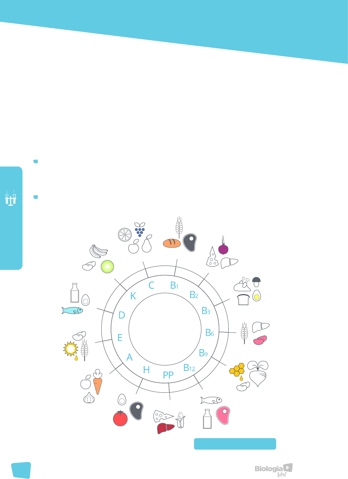 58 BIO QU ÍM IC A VITAMINAS São substâncias orgânicas especiais que atuam em quantidades reduzidas, a nível celular, como desencadeadoras da atividade de muitas enzimas do metabolismo. São produzidas nas estruturas dos vegetais e de alguns seres unicelulares. Os animais devem obtê-las na alimentação sob a forma de provitaminas. AS VITAMINAS SÃO DIVIDIDAS EM: - Lipossolúveis: Solúveis apenas em lipídeos. Para serem absorvidas, é necessária a presença de lipídeos. São elas: A, D, E e K. - Hidrossolúveis: Solúveis em água. São elas: complexo B e C. O diagrama acima demonstra em que alimentos podem ser emconrtados diferentes vitaminas. A falta de determinada vitamina na dieta alimentar provoca um quadro conhecido como avitaminose, determinando alterações específicas no metabolismo humano. As vitaminas também tem papel muito importante na “limpeza” das células. Muitas têm papel de antioxidantes combatendo radicais livres, que são produtos da respiração celular. O aumento de radicais livres prejudica o DNA e é um dos responsáveis pelo envelhecimento celular. 59www.biologiatotal.com.br BIO QU ÍM IC A ABAIXO SEGUE UMA TABELA RELACIONANDO AS PRINCIPAIS VITAMINAS: Vitaminas Fontes Funções no Organismo Doenças LI PO SS O LÚ VE IS A (Re�nol) Fígado de aves, animais e cenoura. Combate a radicais livres; Formação dos ossos e pele; Funções da re�na. Hemeralopia; Xero�almia; Diminuição de glóbulos vermelhos; Formação de cálculos renais. D (Calciferol) Óleo de peixe, �gado, gema de ovos. Regulação do cálcio do sangue e dos ossos. Raqui�smo; Osteoporose. E (Tocoferol) Verduras, azeite e vegetais. An�oxidante que protege as células do organismo contra radicais livres. Dificuldades visuais; Alterações neurológicas. K (Filoquinona) Fígado e verduras. Atua na coagulação do sangue; Previne a osteoporose. Desnutrição; Má função do �gado; Problemas intes�nais. HI DR O SS O LÚ VE IS B1 (Tiamina) Cereais, carnes, verduras, levedo de cerveja. Atua no metabolismo energé�co dos açúcares. Beribéri. B2 (Riboflavina) Leites, carnes, verdura. Atua no metabolismo de enzimas; Proteção do sistema nervoso. Inflamações na língua; Anemias; Seborreia. PP ou B3 (Niacina) Ervilha, amendoim, fava, peixe, feijão, �gado. Manutenção da pele; Proteção do �gado; Regula a taxa de colesterol no sangue. Insônia; Dor de cabeça; Pelagra (derma�te, diarreia, depressão). B5 (Ácido Pantotênico) Fígado, cogumelos, milho, abacate, ovos, leite, vegetais. Metabolismo de proteínas, gorduras e açúcares. Fadigas; Cãimbras musculares. B8 (Bio�na) Carnes, legumes, verduras e bactérias Atua como coenzima em processos energe�cos da célula, na síntese de ácidos graxos e das bases nitrogenadas B9 (Ácido fólico) Frutas, cereais e vegetais verde Atua na síntese de DNA e RNA e da hemoglobina Anemia, redução do crescimento e problemas congênitos no feto Distúrbios neuromusculares e inaflamações na pele. B6 (Piridoxina) Carnes, frutas, verduras e cereais. Crescimento; Proteção celular; Metabolismo de gorduras e proteínas; Produção de hormônios. Seborreia; Anemia; Distúrbios de crescimento. B12 (Cianocobalamina) Fígado, carnes. Formação de hemácias; Mul�plicação celular. Anemia perniciosa. C (Ácido Ascórbico) Laranja, limão, abacaxi, kiwi, acerola, morango, brócolis, melão, manga. Fortalecimento do sistema imunológico; Combate a radicais livres; Aumento da absorção de ferro pelo intes�no. Escorbuto. 60 EX ER CÍ CI OS (UPE-SSA 1 2016) O raquitismo é uma doença, que afeta o desenvolvimento dos ossos da criança, tornando-os frágeis e maleáveis, o que pode levar a deformidades ósseas. Está entre as doenças mais comuns nos países em desenvolvimento. É CORRETO afirmar que essa doença é causada principalmente pela deficiência da vitamina B1, encontrada em carnes, legumes e cereais integrais. C, encontrada em diversas frutas, especialmente as cítricas. A, encontrada no leite e derivados e nas carnes vermelhas. E, encontrada em vegetais, e pela baixa produção da flora intestinal. D, encontrada em laticínios, gema de ovo e vegetais, como também pela exposição insuficiente à luz solar. (CFTMG 2016) Nossa pele é rica em colecalciferol, o qual também pode ser obtido do fígado de peixe e da gema de ovo, por exemplo. Porém essa substância está inerte e, quando os raios ultravioletas do sol atingem nosso corpo, ela se transforma em sua forma ativa: a vitamina D. Um médico recomendou a um idoso que tomasse banhos de sol regularmente. Disponível em: < http://super.abril.com.br>. (Adaptado). Acesso em: 09 set. 2015. Essa recomendação é importante especialmente para idosos porque essa vitamina reduz a(o) ocorrência de icterícias. risco de câncer de pele. enfraquecimento ósseo. taxa de envelhecimento. (IFSP 2016) As vitaminas formam um grupo de substâncias importantes nos processos dos metabolismos de um organismo. As necessidades diárias deverão ser supridas através de uma alimentação variada. A falta de vitaminas pode causar doenças chamadas avitaminoses e sua ingestão muito além das doses recomendadas pode ser prejudicial, ocorrendo as hipervitaminoses. A vitamina __________ é necessária para a manutenção da integridade da pele e dos epitélios, tanto o respiratório, como o intestinal e urinário e atua na síntese de pigmentos da retina. Sua deficiência pode causar pele escamosa e seca e problemas de visão, entre estas a cegueira noturna. a a a b b b c c c d e d d e EXERCÍCIOS (IFSC 2016) Leia o texto com atenção e assinale a alternativa CORRETA. A vitamina (X) é produzida pelo próprio organismo, com o auxílio da luz solar e interage com hormônios que regulam a quantidade de cálcio no organismo. Quando uma pessoa se expõe ao sol, os raios ultravioletas são absorvidos e atuam com o colesterol, transformando-o num precursor da vitamina (X). Pode ser encontrada e