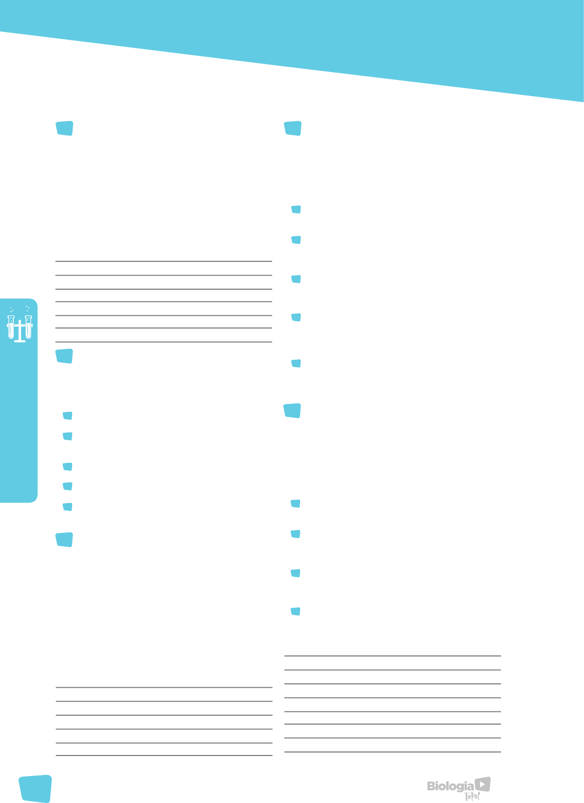 76 EX ER CÍ CI OS A PR OF UN DA DO S VITAMINAS 01 01 A 02 02 B 04 04 C 08 08 D 16 16 (UFPR 2014) Um problema do estilo de vida nas grandes cidades é que as pessoas, cada vez menos, tomam banhos de sol. Dentre fatores que podem decorrer desse problema está o aumento da predisposição à osteoporose, que é a descalcificação dos ossos, ou o raquitismo, em crianças. Qual a vitamina, cujo precursor é ativado por luz solar, envolvida nesses processos? Qual a função dessa vitamina na prevenção das doenças mencionadas acima? (UEM 2013) O termo lipídio designa alguns tipos de substâncias orgânicas cuja principal característica é a insolubilidade em água e a solubilidade em certos solventes orgânicos. Sobre esse assunto, é correto afirmar que a hidrólise de moléculas de lipídios produz ácidos graxos e glicerol. os lipídios exercem importante papel na estocagem de energia, na estrutura das membranas celulares e na ação hormonal. os fosfolipídios apresentam, além de ácido graxo e glicerol, um grupo fosfato. os lipídios são compostos orgânicos formados pela polimerização de ácidos carboxílicos de cadeias pequenas. os carotenoides são lipídios importantes para os animais, por participarem da formação da vitamina A. (UEM-PAS 2012) Uma das evidências da evolução biológica e da ancestralidade, comum aos seres vivos, é que todas as formas de vida possuem composição química semelhante. Considerando que na composição química das células encontramos dois grandes grupos de substâncias – inorgânicas e orgânicas –, assinale a(s) alternativa(s) correta(s). Carboidratos, proteínas e lipídios são exemplos de substâncias orgânicas encontradas nas células. A água e os sais minerais são exemplos de substâncias inorgânicas. Nos seres vivos, a água é a substância mais abundante, porém não pode ser considerada uma substância pura, uma vez que age como solvente de diversas outras substâncias presentes no organismo. Os fosfolipídios, um tipo especial de lipídios, são componentes das membranas celulares e, quimicamente, apresentam-se formados por um glicerídio combinado a um grupo fosfato. O metabolismo celular depende de uma série de reações químicas controladas por carboidratos e lipídios especializados, chamados enzimas. Essas substâncias são necessárias em grandes quantidades nas reações químicas do organismo, atuando como catalisadores. O ácido ascórbico, também conhecido como vitamina D, é importante para a síntese de colágeno, proteína essencial para a manutenção dos tecidos conjuntivos, como a cartilagem e a derme. (UFF 2008) A anemia falciforme é gerada a partir de uma mutação pontual no gene da cadeia β da hemoglobina, que se localiza no cromossomo 11. Nos indivíduos que apresentam esta doença, observa-se a troca de uma base nitrogenada no gene. Enquanto os indivíduos sadios apresentam um nucleotídeo T, nos indivíduos acometidos pela doença, este é substituído pelo nucleotídeo A. Que alteração ocorre na estrutura primária da hemoglobina sintetizada, a partir deste gene, em indivíduos com anemia falciforme? Que característica do código genético permite que um gene contendo uma mutação pontual por substituição possa, após a sua tradução, gerar a mesma proteína codificada pelo gene original (não-mutado)? Explique. Além da anemia falciforme, existem outros tipos de anemia como a anemia perniciosa, que é causada devido à carência de nutrientes. Identifique os nutrientes dos quais carecem os doentes com anemia perniciosa. Classicamente, sabe-se que indivíduos acometidos pela anemia falciforme podem ser refratários a uma doença parasitária causada por um protozoário. Identifique esta doença e sua principal forma de transmissão (UFG 2013) Em uma pesquisa, com 2.270 mulheres com idade entre 49 e 69 anos, realizada pela Federação Brasileira das Sociedades de Ginecologia e Obstetrícia, foi observado que 19% delas sofriam de osteoporose. Essa doença pode ser prevenida e tratada. Uma das medidas de profilaxia e tratamento é o uso de vitamina D. Disponível em: <http://revistaescola.abril.com.br/ensino-medio/ licao-chacoalhar-esqueleto-estudantes-431291.shtml>. Acesso em: 8 out. 2012. (Adaptado). Explique como se dá a ação da vitamina citada no texto na profilaxia da osteoporose. 77 78 80 81 79 77 EX ER CÍ CI OS A PR OF UN DA DO S www.biologiatotal.com.br (UFF 2006) A saúde de seres humanos, principalmente crianças, sofre danos quando ficam por um longo período na ausência de luz solar, podendo ser acometidos por uma avitaminose. Faz tempo, dei a um bebê doses de Mozart na mamadeira, Luiz Gonzaga como canções de ninar, Vivaldi e J.S. Bach, do maternal ao ensino médio. A boa alimentação musical deve começar na infância, ser completa, variada, incluindo degustação de produtos não perecíveis, para evitar avitaminose da alma. Dentre os direitos da criança deveria estar também a boa nutrição do espírito. (adaptado do texto “A novela de Bizet” escrito por Tereza Halliday e publicado no “Diário de Pernambuco”, 12 de junho de 2003). De que vitamina esses indivíduos ficariam carentes sob tais condições? Qual é o precursor de origem vegetal utilizado para a produção dessa vitamina, no corpo humano? Que alteração ou deformidade essa avitaminose pode causar a esses indivíduos? Por quê? (UFU 2006) Uma criança foi levada ao médico devido ao desenvolvimento físico deficiente em relação a seus colegas da mesma idade. Depois de examiná-la e analisar alguns exames, o médico indicou banhos de sol e a utilização de óleo de peixe em sua alimentação. Com base nessas informações, responda: Para qual patologia, que tenha por característica o desenvolvimento físico deficiente, tomar sol auxilia no tratamento? Qual vitamina está carente no organismo desta criança? Esta vitamina é lipossolúvel ou hidrossolúvel? Por que lhe foi indicado tomar so