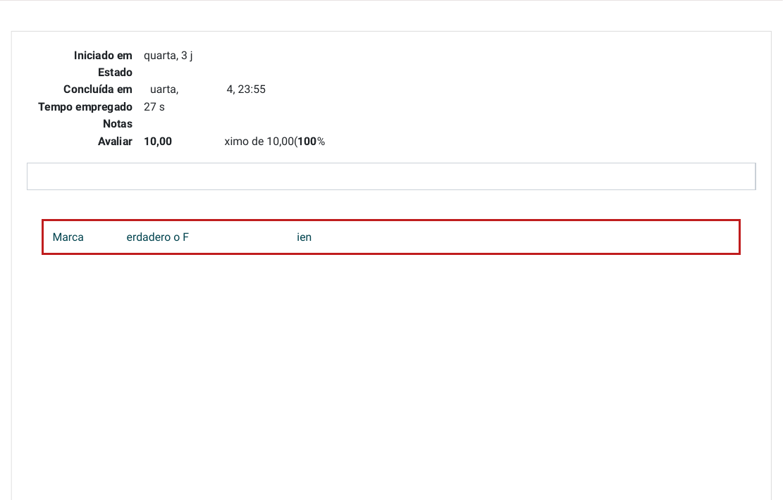 Iniciado em quarta, 3 jan 2024, 23:54 Estado Finalizada Concluída em quarta, 3 jan 2024, 23:55 Tempo empregado 27 segundos Notas 4,00/4,00 Avaliar 10,00 de um máximo de 10,00(100%) Informação Marca V para verdadero o F para falso en las siguientes afirmaciones sobre el carnaval uruguayo, de acuerdo con el contenido estudiado: Questão 1 Correto Atingiu 1,00 de 1,00 Los negros centroamericanos tienen una gran importancia en la caracterización del carnaval uruguayo. Escolha uma opção: a. V b. F A resposta correta é: F Questão 2 Correto Atingiu 1,00 de 1,00 El origen de las murgas es africano. Escolha uma opção: a. V b. F A resposta correta é: F Questão 3 Correto Atingiu 1,00 de 1,00 El candombe es el ritmo del carnaval uruguayo que se ejecuta con tres tambores de tamaños distintos. Escolha uma opção: a. F b. V A resposta correta é: V Mudar para o tema padrão Questão 4 Correto Atingiu 1,00 de 1,00 Para el desfile del cadombe es importante que se usem los carros alegóricos. Escolha uma opção: a. V b. F A resposta correta é: F ← 1.14 El carnaval Uruguayo Seguir para... 1.16 Teste seus conhecimentos: Retomando → https://moodle.ifrs.edu.br/theme/switchdevice.php?url=https%3A%2F%2Fmoodle.ifrs.edu.br%2Fmod%2Fquiz%2Freview.php%3Fattempt%3D14705775%26amp%3Bcmid%3D388570&device=default&sesskey=mezP7MLwON https://moodle.ifrs.edu.br/mod/page/view.php?id=388569&forceview=1 https://moodle.ifrs.edu.br/mod/quiz/view.php?id=388571&forceview=1