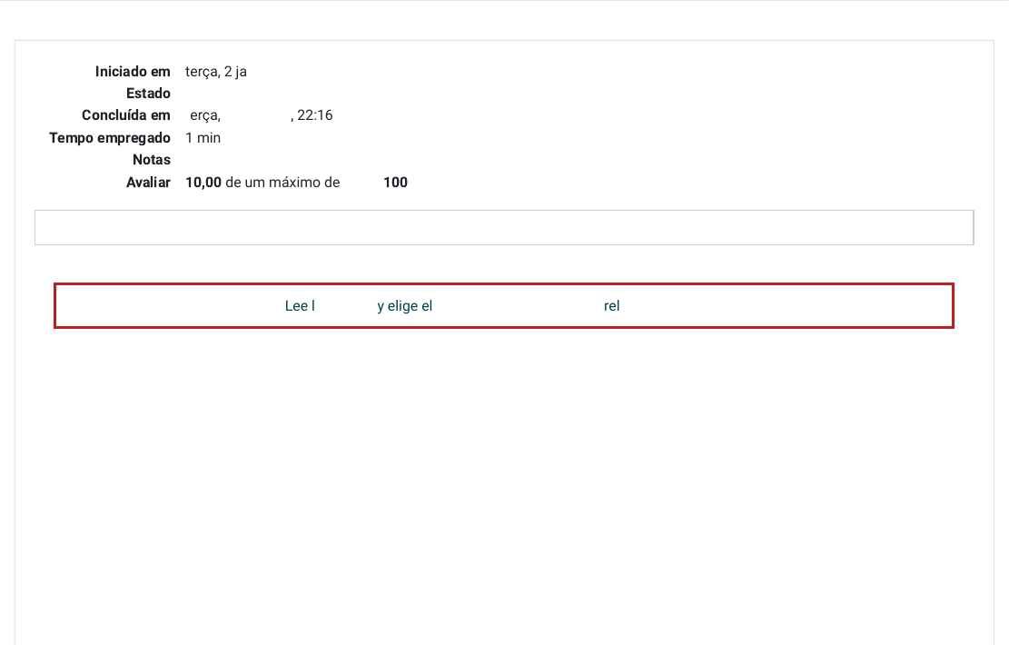 Iniciado em terça, 2 jan 2024, 22:15 Estado Finalizada Concluída em terça, 2 jan 2024, 22:16 Tempo empregado 1 minuto 2 segundos Notas 8,00/8,00 Avaliar 10,00 de um máximo de 10,00(100%) Informação Lee las frases y elige el pronombre adecuado que rellene los huecos. Questão 1 Correto Atingiu 1,00 de 1,00 ¿____________ es tu país latinoamericano preferido? Escolha uma opção: a. Que b. Dónde c. Cuál d. Cual e. Qué Questão 2 Correto Atingiu 1,00 de 1,00 ¿____________ fue Eva Perón? Escolha uma opção: a. Quien Questão 3 Correto Atingiu 1,00 de 1,00 b. Qué c. Quién d. Cuando e. Cuándo ¡____________ rico! Escolha uma opção: a. Cuál b. Qué c. Cómo d. Que e. Como Questão 4 Correto Atingiu 1,00 de 1,00 ¿____________ está mi cuaderno? Escolha uma opção: a. Dónde b. Donde c. Qué d. Que e. Como Questão 5 Correto Atingiu 1,00 de 1,00 ¿____________ años tienes? Escolha uma opção: a. Cuantas Questão 6 Correto Atingiu 1,00 de 1,00 b. Cuanto c. Cuantos d. Cuántos e. Cuánto ¿Quería saber ____________ fue la fiesta? Escolha uma opção: a. como b. qué c. cómo d. cuando e. donde Questão 7 Correto Atingiu 1,00 de 1,00 ¿____________ vestido vas a comprar? Escolha uma opção: a. Que b. Cual c. Cuál d. Cuánto e. Qué Questão 8 Correto Atingiu 1,00 de 1,00 ¡____________ frío! Escolha uma opção: a. Qué Mudar para o tema padrão b. Como c. Que d. Cual e. Cuál ← 2.9 Los pronombres interrogativos y exclamativos Seguir para... 2.11 Los numerales cardinales → https://moodle.ifrs.edu.br/theme/switchdevice.php?url=https%3A%2F%2Fmoodle.ifrs.edu.br%2Fmod%2Fquiz%2Freview.php%3Fattempt%3D14689439%26amp%3Bcmid%3D388498&device=default&sesskey=pMmOjht3v9 https://moodle.ifrs.edu.br/mod/page/view.php?id=388497&forceview=1 https://moodle.ifrs.edu.br/mod/page/view.php?id=388499&forceview=1