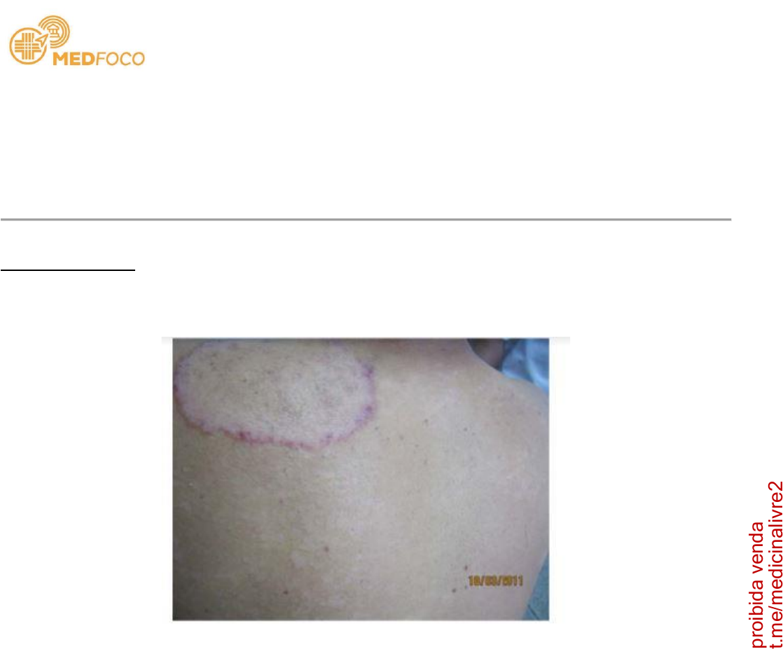 Clínica Médica 01 - Homem, 40 anos, relata o aparecimento de lesão no dorso, há cerca de duas semanas, muito pruriginosa (Figura). Qual a conduta mais adequada? A) Solicitar baciloscopia. B) Solicitar raspado da lesão com KOH. C) Prescrever rifampicina, dapsona e clofazimina. D) Prescrever fluconazol oral. 02 - Mulher, 58 anos, diabética tipo 2 há 8 anos, comparece a consulta para atendimento de rotina. Relata que está assintomática, mas seus níveis glicêmicos estão ficando acima dos alvos propostos. Está em uso de metformina 2 g/dia, gliclazida 90 mg/dia e losartana 100 mg/dia. Exame físico: peso = 82 Kg, estatura = 165 cm, IMC: 30,12 Kg/m², PA: 130 x 80 mmHg. Exames laboratoriais: glicemia: 142 mg/dL; sódio: 140 mEq/L; potássio: 4 mEq/L; HbA1c: 8,4%; TFG (CKD EPI): 56 mL/min; albuminúria 240 mg/g. Qual medicação deve ser acrescentada à terapêutica atual? A) Insulina. B) Inibidores de DPP4. C) Tiazolidinediona. D) Inibidores de SGLT2. 03 - Mulher, 52 anos, refere surgimento de adenomegalias cervicais e inguinais, febre, sudorese noturna e perda ponderal há 5 meses. Há 2 meses, relata também edema periorbitário e urina espumosa. Exames laboratoriais: albumina sérica 1,2 g/dL, creatinina 1,1 mg/dL. Exame de urina sem hematúria, mas com proteinúria de 4,8 gramas em 24 horas. Realizada biópsia ganglionar que detectou células de Reed-Sternberg. Qual será o provável achado histopatológico na biópsia renal? A) Glomerulonefrite rapidamente progressiva. B) Nefropatia membranoproliferativa. C) Glomerulopatia por lesões mínimas. D) Nefropatia membranosa. 2023 USP - RP t.m e/ m ed ic in al iv re 2 pr oi bi da v en da MEDFOCO 2023 USP - RP 04 - Paciente, 68 anos, em acompanhamento no ambulatório por quadro de cirrose hepática Child A, pelo vírus C. Foi tratado com sofosbuvir e velpatasvir por 12 semanas, com resposta virológica sustentada. Endoscopia digestiva alta realizada recentemente evidenciou varizes esofágicas de pequeno calibre, sem sinais vermelhos. Nunca apresentou hemorragia digestiva alta. Exame físico: normal. Qual a melhor conduta para esse paciente? A) Solicitar HCV-RNA a cada seis meses. B) Solicitar ultrassom de abdome a cada seis meses. C) Solicitar endoscopia digestiva alta a cada doze meses. D) Alta ambulatorial e retorno caso sintomático. 05 - Homem, 68 anos, hipertenso e coronariopata, refere dispneia que piora aos esforços. Exame físico: FC = 80 bpm, PA = 130 x 80 mmHg, sopro holossistólico localizado no quinto espaço intercostal, na linha hemiclavicular, com irradiação para axila que aumenta com a manobra de handgrip. Qual é a principal hipótese diagnóstica? A) Estenose aórtica. B) Insuficiência Mitral. C) Insuficiência aórtica. D) Estenose mitral. 06 - Mulher, 32 anos, queixa-se de amenorreia, ganho de peso e humor deprimido nos últimos 6 meses. Exame físico: PA = 150 x 86 mmHg; FC = 82 bpm; IMC: 31 kg/m²; presença de pletora facial, várias equimoses na pele, estrias violáceas no abdome e obesidade dorsocervical. Exames laboratoriais: cortisol livre urinário (valor normal: < 50 μg/24h) = 240 μg/24h. Cortisol sérico após teste de 1 mg de dexametasona: 6,1 μg/dL (normal: < 1,8). Qual é próximo exame a ser solicitado para o diagnóstico? A) Dosagem de ACTH. B) Solicitar TC de abdome. C) Teste de supressão com 8 mg de dexametasona. D) Solicitar RM de sela túrcica. 07 - Homem, 20 anos, apresenta lesões hiperpigmentadas pelo corpo, pruriginosas, de caráter recidivante, desde a infância. Exame físico: apresentado na imagem. Qual é a condição médica mais associada ao diagnóstico deste paciente? A) Diabetes mellitus. B) Hepatite C. C) Doença celíaca. D) Asma. t.m e/ m ed ic in al iv re 2 pr oi bi da v en da MEDFOCO 2023 USP - RP 08 - Homem, 20 anos, apresenta história de sangramento desde o nascimento, incluindo hematomas musculares e hemartroses espontâneas, que começaram no primeiro ano de vida. Exame físico: sem alterações. Exames laboratoriais: plaquetas: 298.000/uL, TP (tempo de protrombina): 1,9 (VR < 1,3), TTPa (relação): 1,82 (VR < 1,26), Tempo de trombina (relação): 1,7 (VR < 1,2). Qual é o diagnóstico mais provável? A) Deficiência de fator VII. B) Hemofilia A. C) Afibrinogenemia. D) Doença de Von Willebrand. 09 - Mulher, 64 anos, hipertensa, busca atendimento na emergência com queixa de dor torácica retroesternal em queimação, acompanhada de dispneia. Sintomas começaram há 50 minutos. Exame físico: crepitações finas bibasais, PA = 160 x 90 mmHg, FC = 90 bpm. Foram obtidos valores de troponina T ultrassensível na admissão e após 1 hora, cujos valores foram 55 e 1.262 ng/l, respectivamente (limite superior da normalidade = 14 ng/l). A) Arteriografia e revascularização dentro de 2h. B) Arteriografia e revascularização em até 72h. C) Arteriografia e revascularização dentro de 24h. D) Estratégia conservadora. 10 - Homem, 62 anos, hipertenso e portador de insuficiência cardíaca de fração de ejeção reduzida, em uso de enalapril, carvedilol, atorvastastina e espironolactona, foi admitido na UPA com fraqueza e mal-estar. Ao exame, levemente confuso, FC = 74 bpm, PA = 150/82 mmHg, eupneico, sem estase jugular. Realizado o eletrocardiograma abaixo. Qual das medidas abaixo está inicialmente melhor indicada? A) Gluconato de cálcio. B) Furosemida. C) AAS + clopidogrel. D) Marcapasso transcutâneo. t.m e/ m ed ic in al iv re 2 pr oi bi da v en da MEDFOCO 2023 USP - RP 11 - Mulher, 28 anos, há dois dias com quadro de prostração, fadiga, náuseas e icterícia. Hoje procurou o atendimento por desconforto moderado no quadrante superior direito. Sorologias: HBsAg (+), anti-HBc IgM (+) e IgG (-), HBeAg (+) e anti-HBsAg (-). Tem anti-HAV IgM(-) e IgG(+) e anti-HCV (-). Ao exame físico: regular estado geral, orientada, ictérica, hidratada. Abdome flácido, dor moderada em hipocôndrio direito, sinal de Murphy negativo e sem ascite. Os exames de laboratório mostram: 