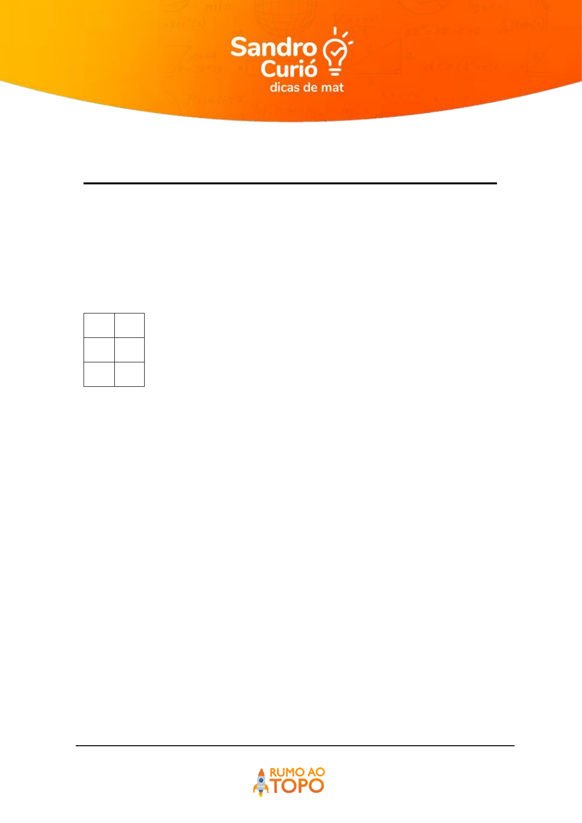 Página 1 de 15 QUESTÃO 01 =============================================== A equivalência entre as escalas de temperatura geralmente é obtida por meio de uma função polinomial do 1º grau, ou seja, uma função da forma y = a x + b. Um grupo de estudantes do curso de Química do IFPE desenvolveu uma nova unidade de medida para temperaturas: o grau Otavius. A correspondência entre a escala Otavius (O) e a escala Celsius (C) é a seguinte: O C 6 18 60 36 Sabendo que a temperatura de ebulição da água ao nível do mar (pressão atmosférica igual a 1 atm) é 100 C, então, na unidade Otavius, a água ferverá a 🅐 112. 🅑 192. 🅒 252. 🅓 72. 🅔 273. Página 2 de 15 QUESTÃO 02 =============================================== Em um município foi realizado um levantamento relativo ao número de médicos, obtendo-se os dados: Tendo em vista a crescente demanda por atendimento médico na rede de saúde pública, pretende-se promover a expansão, a longo prazo, do número de médicos desse município, seguindo o comportamento de crescimento linear no período observado no quadro. Qual a previsão do número de médicos nesse município para o ano 2040? 🅐 387 🅑 424 🅒 437 🅓 574 🅔 711 Ano Médicos 1980 137 1985 162 1995 212 2010 287 Página 3 de 15 QUESTÃO 03 =============================================== Na intenção de ampliar suas fatias de mercado, as operadoras de telefonia apresentam diferentes planos e promoções. Uma operadora oferece três diferentes planos baseados na quantidade de minutos utilizados mensalmente, apresentados no gráfico. Um casal foi à loja dessa operadora para comprar dois celulares, um para a esposa e outro para o marido. Ela utiliza o telefone, em média, 30 minutos por mês, enquanto ele, em média, utiliza 90 minutos por mês. Com base nas informações do gráfico, qual é o plano de menor custo mensal para cada um deles? 🅐 O plano A para ambos. 🅑 O plano B para ambos. 🅒 O plano C para ambos. 🅓 O plano B para a esposa e o plano C para o marido. 🅔 O plano C para a esposa e o plano B para o marido. Página 3 de 15 QUESTÃO 04 =============================================== Os veículos para transporte de passageiros em determinado município têm vida útil que varia entre 4 e 6 anos, dependendo do tipo de veículo. Nos gráficos está representada a desvalorização de quatro desses veículos ao longo dos anos, a partir de sua compra na fábrica. Página 4 de 15 Com base nos gráficos, o veículo que mais desvalorizou por ano foi: 🅐 I 🅑 II 🅒 III 🅓 IV QUESTÃO 05 =============================================== O gráfico a seguir é de uma função polinomial do 1º grau e descreve a velocidade v de um móvel em função do tempo t : Assim, no instante t = 10 horas o móvel está a uma velocidade de 55 km h, por exemplo. Sabe-se que é possível determinar a distância que o móvel percorre calculando a área limitada entre o eixo horizontal t e a semirreta que representa a velocidade em função do tempo. Desta forma, a área hachurada no gráfico fornece a distância, em km, percorrida pelo móvel do instante 6 a 10 horas. É correto afirmar que a distância percorrida pelo móvel, em km, do instante 3 a 9 horas é de 🅐 318 🅑 306 🅒 256 🅓 212 Página 5 de 15 QUESTÃO 06 =============================================== No centro de uma cidade, há três estacionamentos que cobram da seguinte maneira: Estacionamento A Estacionamento B Estacionamento C R$ 5,00 pela primeira hora R$ 3,00 por cada hora subsequente R$ 4,00 por hora R$ 6,00 pela primeira hora R$ 2,00 por cada hora subsequente Será mais vantajoso, financeiramente, parar 🅐 no estacionamento A, desde que o automóvel fique estacionado por quatro horas 🅑 no estacionamento B, desde que o automóvel fique estacionado por três horas. 🅒 em qualquer um, desde que o automóvel fique estacionado por uma hora 🅓 em qualquer um, desde que o automóvel fique estacionado por duas horas. 🅔 no estacionamento C, desde que o automóvel fique estacionado por uma hora. Página 6 de 15 QUESTÃO 07 =============================================== Dois dos materiais mais utilizados para fazer pistas de rodagem de veículos são o concreto e o asfalto. Uma pista nova de concreto reflete mais os raios solares do que uma pista nova de asfalto; porém, com os anos de uso, ambas tendem a refletir a mesma porcentagem de raios solares, conforme mostram os segmentos de retas nos gráficos. Mantidas as relações lineares expressas nos gráficos ao longo dos anos de uso, duas pistas novas, uma de concreto e outra de asfalto, atingirão pela primeira vez a mesma porcentagem de reflexão dos raios solares após 🅐 8,225 anos. 🅑 9,375 anos. 🅒 10,025 anos. 🅓 10,175 anos. 🅔 9,625 anos. Página 8 de 15 QUESTÃO 08 =============================================== Os consumidores X, Y e Z desejam trocar seus planos de internet móvel na tentativa de obterem um serviço de melhor qualidade. Após pesquisarem, escolheram uma operadora que oferece cinco planos para diferentes perfis, conforme apresentado no quadro. Dado: 1GB = 1.024 MB Em cada plano, o consumidor paga um valor fixo (preço mensal da assinatura) pela franquia contratada e um valor variável, que depende da quantidade de MB utilizado além da franquia. Considere que a velocidade máxima de acesso seja a mesma, independentemente do plano, que os consumos mensais de X, Y e Z são de 190 MB, 450 MB e 890 MB, respectivamente, e que cada um deles escolherá apenas um plano. Com base nos dados do quadro, as escolhas dos planos com menores custos para os consumidores X, Y e Z, respectivamente, são a) A, C e C. b) A, B e D. c) B, B e D. d) B, C e C. e) B, C e D. Plano Franquia Preço mensal de assinatura Preço por MB excedente A B C D E Página 9 de 15 QUESTÃO 09 =============================================== Um reservatório é abastecido com água por uma torneira e um ralo faz a dren