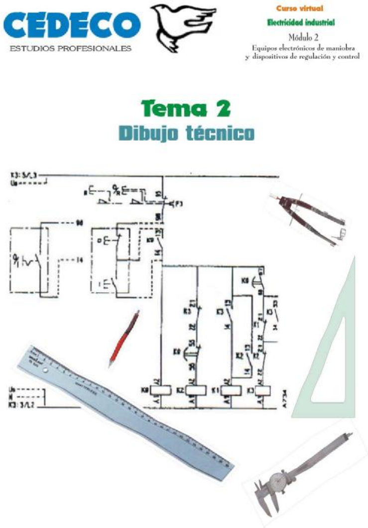 Tema 2 Dibujo técnico Indice 1. Manejo de la escuadra y el cartabón . . . . . . . . . . . . . . . . . . . . . . . . . . . . . . . . . . . . . . . . . . . . . . 1 2. Trazar líneas paralelas . . . . . . . . . . . . . . . . . . . . . . . . . . . . . . . . . . . . . . . . . . . . . . . . . . . . . . . . 1 3. Trazar perpendiculares entre sí . . . . . . . . . . . . . . . . . . . . . . . . . . . . . . . . . . . . . . . . . . . . . . . . . . 2 4. Posición correcta del cartabón . . . . . . . . . . . . . . . . . . . . . . . . . . . . . . . . . . . . . . . . . . . . . . . . . . . 3 5. Desplazamientos en el trazado de perpendiculares . . . . . . . . . . . . . . . . . . . . . . . . . . . . . . . . . . 5 6. Ángulos . . . . . . . . . . . . . . . . . . . . . . . . . . . . . . . . . . . . . . . . . . . . . . . . . . . . . . . . . . . . . . . . . . . . 6 7. Plano . . . . . . . . . . . . . . . . . . . . . . . . . . . . . . . . . . . . . . . . . . . . . . . . . . . . . . . . . . . . . . . . . . . . . . 7 8. Interpretación de planos . . . . . . . . . . . . . . . . . . . . . . . . . . . . . . . . . . . . . . . . . . . . . . . . . . . . . . . 7 9. Representación de un objeto a cuatro vistas . . . . . . . . . . . . . . . . . . . . . . . . . . . . . . . . . . . . . . . . 9 10. Ejemplo de planos de una sola vista (objetos redondos) . . . . . . . . . . . . . . . . . . . . . . . . . . . . . . 11 11. Formatos de hojas . . . . . . . . . . . . . . . . . . . . . . . . . . . . . . . . . . . . . . . . . . . . . . . . . . . . . . . . . . . 12 12. Formatos para dibujos . . . . . . . . . . . . . . . . . . . . . . . . . . . . . . . . . . . . . . . . . . . . . . . . . . . . . . . . 13 Curso Virtual: Electricidad industrial Módulo 2. Tema 2. Dibujo técnico Página 1 de 14 Tema 2 Dibujo técnico 1. MANEJO DE LA ESCUADRA Y EL CARTABÓN La escuadra que se emplea en dibujo, es de PVC transparente y de bordes rectos sin chaflanes y sin graduación de distancias, Tiene un ángulo recto y los otros dos ángulos iguales de 45 º, los lados de los catetos del triángulo por tanto, son iguales. El cartabón debe ser de las mismas características que la escuadra, con un ángulo recto y los otros dos lados del triángulo, uno es doble del otro de largo, por tanto sus ángulos son de 30º y 60 º La regla graduada, en milímetros, se emplea como auxiliar para delimitar las distancias, la regla graduada puede tener chaflán, pero no es una necesidad imperiosa 2. TRAZAR LÍNEAS PARALELAS En el trazado se emplea el cartabón por el lado más largo como base, desplazando la escuadra sobre uno de los lados se pueden trazar lineas paralelas como se indica en la figura 1 Observe la figura 1 y realice ejercicios de trazado de líneas paralelas, asentando el cartabón sobre el papel y haciendo presión con la mano para evitar que se mueva, con la otra mano asiente la escuadra y desplace la escuadra a derecha y a izquierda, luego trace varias líneas, aproximadamente a un centímetro cada una, sin medir, a ojo, se trata simplemente, de que no se mueva el cartabón mientras se desplaza la escuadra. Si no aprieta lo suficiente se moverá, y si aprieta demasiado se cansará. Debe de graduar sus fuerzas. Cuando haya trazado diez o doce paralelas, quite escuadra y cartabón levantando ambas piezas del papel. Luego vuelva a colocar de nuevo escuadra y cartabón para seguir trazando líneas paralelas, observe su dibujo y compruebe si las líneas siguen siendo paralelas, mida con la regla las distancia entre las dos líneas extremas arriba y abajo y vea si miden iguales o si son líneas convergentes. Curso Virtual: Electricidad industrial Módulo 2. Tema 2. Dibujo técnico Página 2 de 14 Figura 1 TRAZADO DE PARALELAS VERTICALES 3. TRAZAR PERPENDICULARES ENTRE SÍ Para trazar perpendiculares en cualquier postura, se utilizan los 45 grados de la escuadra. Primero se trazan líneas paralelas como se hizo en la figura 1, pero esta vez utilizando la hipotenusa del triángulo. Se obtienen paralelas inclinadas que forman con la base 45º (figura 2). Seguidamente se da la vuelta a la escuadra y se obtiene los otros 45 grados, en sentido contrario (figuras 3). Entre los dos trazos habrá 90º Figura 2 TRAZADOS DE PARALELAS A 45º Curso Virtual: Electricidad industrial Módulo 2. Tema 2. Dibujo técnico Página 3 de 14 Figura 3 TRAZADO DE PERPENDICULARES ENTRE SÍ 4. POSICIÓN CORRECTA DEL CARTABÓN En las figuras 1, 2 y 3, el cartabón se ha colocado horizontalmente, sin embargo, no es la posición más conveniente, puesto que se ha visto que dando vueltas a la escuadra se pueden obtener perpendiculares, se debe de aprovechar esta ventaja en el trazado situando las posiciones de ambos instrumentos como se muestra en la figura 4 Esta es la mejor posición para sacarle el máximo provecho la escuadra, con la hipotenusa horizontal y el cartabón inclinado con el lado más largo sirviendo de base para el desplazamiento de la escuadras Compruebe de nuevo la figura 4, y observe que el ángulo menor, el de 30º, se coloca hacia arriba, con ello la parte más ancha queda hacia abajo y se puede sujetar mejor el cartabón para que no se mueva mientras se desplaza la escuadra. Curso Virtual: Electricidad industrial Módulo 2. Tema 2. Dibujo técnico Página 4 de 14 Cuando se trazan líneas paralelas, se hacen primero los trazos superiores y luego se va desplazando y pintando, con ello sé evitar pasar por encima de lo trazado y no hacer borrones, al mismo tiempo que se evita ensuciar los útiles. El cartabón no se levanta nunca de su posición, solamente se desplaza y cuado se tenga que desplazar, se hace fijando la escuadra y deslizando el cartabón sobre la escuadra, hasta la postura necesaria. Practique trazar horizontales como se muestra en la figura 4 desde lo más alto que pueda hasta lo más bajo que le permita el papel y desplace el cartabón utilizando la escuadra. Ojo, si lleva el desplazamiento mas allá de la mitad de lo que midan los catetos de la es