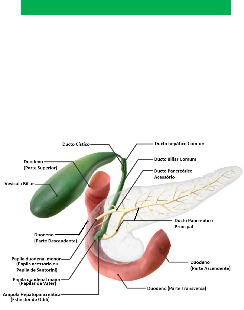 Revisão: Morfofisiologia Pâncreas · Introdução Definição: O pâncreas é uma glândula mista retroperitoneal localizada atrás do estômago, sendo denominado como uma “glândula mista” pois possui uma parte exócrina - responsável pela produção de enzimas digestivas e uma parte endócrina - responsável pela produção de hormônios (como insulina e glucagon). · Anatomia do Pâncreas · Histologia do Pâncreas A) Pâncreas Exócrino ->Mais de 95% da massa pancreática corresponde a células exócrinas, agrupadas em lóbulos (ácinos). ->Os ácinos sintetizam enzimas digestivas, em sua forma inativa, tais como amilases, proteases, lipases e nucleases. Essas enzimas são secretadas nos ductos pancreáticos (ducto pancreático principal e acessório) e são transportadas até o duodeno, onde são ativadas. ->As células dos ductos pancreáticos produzem mucina e fluidos ricos em bicarbonato (substância alcalina), úteis na neutralização do conteúdo ácido estomacal que está chegando no duodeno. Funções do Pâncreas Exócrino: I) Produção de enzimas digestivas: as células acinares do pâncreas produzem enzimas digestivas, como amilase pancreática, lipase e tripsina que são liberadas no intestino delgado através do ducto pancreático. II) Produção de bicarbonato: as células do ducto do pâncreas produzem bicarbonato (substância alcalina) e mucina, liberando essas substâncias no duodeno através do ducto pancreático, neutralizando o conteúdo ácido que está vindo do estômago para o duodeno B) Pâncreas Endócrino ->As funções endócrinas do fígado são desempenhadas por aglomerados de células denominadas de Ilhotas de Langerhans. Essas ilhotas constituem cerca de 2% da massa total do pâncreas ->As duas principais células das ilhotas de Langerhans são as células α – as quais produzem glucagon – e as células β – as quais produzem insulina. Funções do Pâncreas Endócrino: I) Regulação da liberação de bile: O pâncreas secreta o hormônio secretina, o qual estimula a liberação de bile pela vesícula biliar. Além disso, as células PP produzem o hormônio polipeptídeo pancreático, este que inibe a liberação de bile e das enzimas pancreáticas II) Produção de Insulina e Glucagon: Esses dois hormônios regulam a quantidade de açúcar no sangue III) Regulação da liberação de insulina e glucagon: As células delta produzem o hormônio somatostatina, que regula a liberação de insulina e glucagon e inibe a secreção de outros hormônios digestivos. Pancreatite Aguda · Introdução Definição de Pancreatite Aguda: Pancreatite Aguda é uma inflamação súbita do pâncreas, podendo se expressar de forma leve ou grave e, em casos extremos, levar ao óbito. · Patogêneses e Etiologias · Mecanismos Fisiopatológicos da Pancreatite 1°) Lesão Pancreática por Obstrução Ductal (1) – Alguns fatores podem causar uma contrapressão nas células acinares e nas células do ducto pancreático – como uma obstrução dos ductos pancreáticos (2) – Na obstrução dos ductos pancreáticos, as substâncias liberadas por essas células exócrinas do pâncreas irão se acumular na porção do pâncreas precedida pelo bloqueio, de modo que a pressão dentro dos ductos pancreáticos vai aumentar (3) – Com isso, vai ocorrer um aumento da pressão intraductal e gerar um acúmulo de um fluido rico em enzimas nos ductos pancreáticos (a maioria zimogênios, mas a lipase já é secretada como uma enzima ativa, fator esse que causa uma esteatonecrose) (4) – Dessa forma, o acúmulo desses zimogênios + lipase ativa nos ductos pancreáticos vai gerar uma reação inflamatória no local, de maneira a gerar edema intersticial por meio de um extravasamento microvascular. Com isso, o edema compromete o fluxo sanguíneo local do pâncreas, gerando isquemia às células acinares (5) – A isquemia às células acinares ocasiona danos e necrose nessas células, de forma que essas células danificadas/mortas irão liberar zimogênios + conteúdo dos lisossomos, implicando na ativação desses zimogênios em proteases ativas, as quais irão amplificar o dano pancreática e gerar a pancreatite. OBS.: A ativação da tripsina é um evento gerador crítico da pancreatite aguda, pois a tripsina pode ativar outros tripsinogênios em tripsinas e ativar outros zimogênios em proteases ativas, os quais irão contribuir no processo de dano pancreático. 2°) Lesão Pancreática por Dano Direto às Células Acinares (1) – O dano direto as células acinares pode levar a liberação de zimogênios e de lisossomos em um mesmo lugar, de modo que o lisossomo vai ativar esses zimogênios em proteases ativas, gerando danos ao pâncreas e levando a pancreatite (processo ocasionado por: álcool, drogas, traumas, isquemia, vírus) 3°) Transporte Intracelular Defeituoso (1) – Em células acinares normais, os zimogênios e as enzimas lisossomais são transportadas em vacúolos enzimáticos distintos, depois da síntese no reticulo endoplasmático. (2) – Entretanto, em um processo anormal – ainda pouco esclarecido – os zimogênios e as enzimas lisossomais são “englobadas” e transportadas em um mesmo vacúolo lisossomal, de forma que esses zimogênios são ativos em proteases pelas enzimas dos lisossomos, implicando em dano pancreático e na pancreatite · Etiologias da Pancreatite Aguda ->Os mecanismos pelo qual a pancreatite aguda é gerada ainda não foram totalmente elucidados. Entretanto, sabe-se que 80 a 90% das pancreatites agudas são causadas por cálculos biliares e álcool. ->A principal causa de pancreatite são cálculos biliares (agrupando até 60% dos casos) e a segunda principal causa é o consumo de álcool A) Cálculos Biliares ->Responsável por cerca de 60% dos casos de pancreatite aguda, sendo a causa mais comum de pancreatite aguda Fisiopatologia: (1) – Um cálculo biliar - oriundo da vesícula biliar – se instala na ampola hepatop