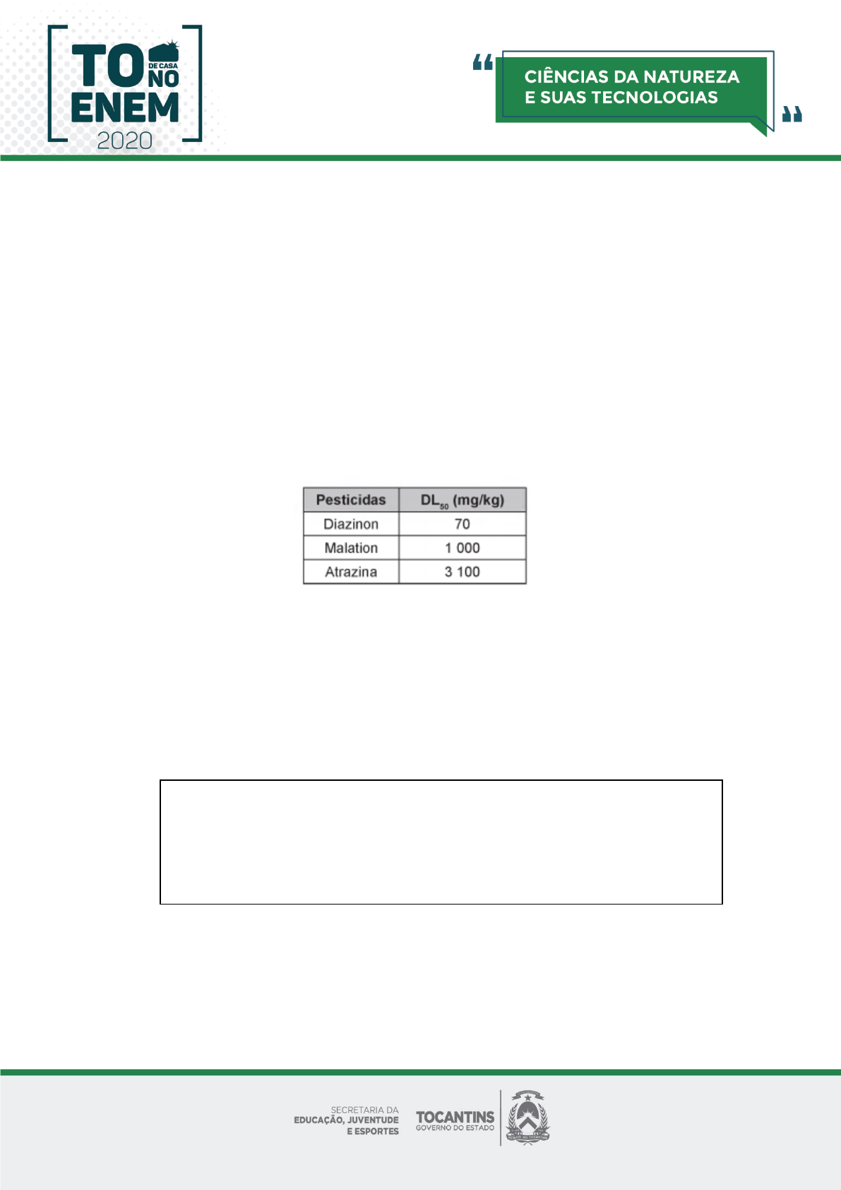 ENEM (2017) QUESTÃO 91 A toxicidade de algumas substâncias é normalmente representada por um índice conhecido DL50 (dose letal mediana). Ele representa a dosagem aplicada a uma população de seres vivos que mata 50% desses indivíduos e é normalmente medido utilizando ratos como cobaias. Esse índice é muito importante para os seres humanos, pois, ao se extrapolar os dados obtidos com o uso de cobaias, pode-se determinar o nível tolerável de contaminação de alimentos, para que possam ser consumidos de forma segura pelas pessoas. O quadro apresenta três pesticidas e suas toxicidades. A unidade mg/kg Indica a massa da substância ingerida pela cobaia. Sessenta ratos. Com massa de 200 g cada, foram divididos em três grupos de vinte. Três amostras de ração, contaminadas, cada uma delas com um dos pesticidas indicados no quadro, na concentração de 3 mg por grama de ração, foram administradas para cada grupo de cobaias. Cada rato consumiu 100 g de ração. Qual(ais) grupo(s) terá(ão) uma mortalidade mínima de 10 ratos? A) O grupo que se contaminou somente com atrazina. B) O grupo que se contaminou somente com diazinon. C) Os grupos que se contaminaram com atrazina e malation. D) Os grupos que se contaminaram com diazinon e malation. E) Nenhum dos grupos contaminados com atrazina, diazinon e malation. FICA A DICA! Para resolver essa questão, faz-se necessário um conhecimento prévio sobre: Regra de três simples; Conversão de unidades; Interpretação de texto. ANÁLISE DA QUESTÃO O enunciado informa que a toxicidade de algumas substâncias é normalmente representada por um índice conhecido DL50 (dose letal mediana), representa a dosagem aplicada para exterminar 50% de uma população. A questão trata-se de uma concentração e fornece dados importantes para a resolução: 60 ratos divididos em (3 grupos de 20 ratos); Massa (rato) 200 g; Consumo (rato) 100 g; 3 amostras de ração; 3 mg tóxico/g de ração. Calculamos inicialmente a massa de pesticida ingerida por cada rato ao consumir 100 g da ração: Cada rato consumiu 300mg de pesticida. Em seguida calculamos a massa do pesticida por quilograma de massa corporal em cada rato: Pesticida por quilograma de massa corporal 1500 mg pesticida Considerando que cada rato consumiu 1500mg/kg de pesticida, os ratos que ingeriram diazinon com DL50 = 70 mg/kg, malation com DL50 = 1000 mg/kg, consumiram uma dose superior a DL50 (dose letal) e tiveram mortalidade maior que 50% do grupo. A atrazina com DL50 = 3100 mg/kg, não provocará a morte de mais de 10 ratos. ENEM (2017) QUESTÃO 95 A eletrólise é um processo não espontâneo de grande importância para a indústria química. Uma de suas aplicações é a obtenção do gás cloro e do hidróxido de sódio, a partir de uma solução aquosa de cloreto de sódio. Nesse procedimento, utiliza- se uma célula eletroquímica, como ilustrado. No processo eletrolítico ilustrado, o produto secundário obtido é o: A) vapor de água. B) oxigênio molecular. C) hipoclorito de sódio. D) hidrogênio molecular. E) cloreto de hidrogênio. ANÁLISE DA QUESTÃO O enunciado apresenta como uma das aplicações da eletrólise, a obtenção do gás cloro e do hidróxido de sódio, a partir de uma solução aquosa de cloreto de sódio, ao final traz uma representação do funcionamento de uma célula eletroquímica. A partir da solução aquosa de cloreto de sódio, iniciamos o processo de identificação dos cátions e ânions existentes na solução. FICA A DICA! Para resolver essa questão, faz-se necessário um conhecimento prévio sobre: Equilíbrio químico; Prioridade de descarga; Dissociação iônica. Solução Aquosa de Cloreto de sódio Verificar quem tem prioridade de descarga no cátodo ou no ânodo, lembrando da regra de prioridade. Prioridade de descarga Cátions – 1A, 2A, Al +3 < H + < demais cátions. Ânions – Oxigenados e F - < OH - < demais ânions. Eletrólise Aquosa de Cloreto de sódio O enunciado afirma que na eletrólise aquosa obteve Hidróxido de Sódio NaOH e Cloro Cl2 (g), restando como produto secundário o Hidrogênio H2 (g). ENEM (2017) QUESTÃO 97 Um fato corriqueiro ao se cozinhar arroz é o derramamento de parte da água de cozimento sobre a chama azul do fogo, mudando-a para uma chama amarela. Essa mudança de cor pode suscitar interpretações diversas, relacionadas às substâncias presentes na água de cozimento. Além do sal de cozinha (NaCl), nela se encontram carboidratos, proteínas e sais minerais. Cientificamente, sabe-se que essa mudança de cor da chama ocorre pela: A) reação do gás de cozinha com o sal, volatilizando gás cloro. B) emissão de fótons pelo sódio, excitado por causa da chama. C) produção de derivado amarelo, pela reação com o carboidrato. D) reação do gás de cozinha com a água, formando gás hidrogênio. E) excitação das moléculas de proteínas, com formação de luz amarela. ANÁLISE DA QUESTÃO O enunciado afirma que ao derramar parte da água de cozimento do arroz sobre a chama azul do fogo, ocorrerá mudança na coloração da chama, tornando-a amarela. Considerando os dados fornecidos pelo enunciado, sabemos que os íons da solução de água e sal ao receber calor têm seus elétrons excitados e saltam para um nível mais energético (camada mais externa). Quando os elétrons retornam para um nível de menor energia, há a emissão de energia luminosa (fóton). Representação para absorção e emissão de energia em um átomo: Fonte: FISICA Modelo atómico de absorción y emisón de fotones.pdf acesso 20/02/2020 Emissão de fótons pelo sódio, excitado por causa da chama. FICA A DICA! Para resolver essa questão, faz-se necessário um conhecimento prévio sobre: Modelo Atômico de Bohr; Níveis de energia; Teste de chama. ENEM (2017) QUESTÃO 102 Partículas microscópicas existentes na atmosfera funcionam como núcleos de condensação de vapor de água que, sob condições adequadas de temperatura 