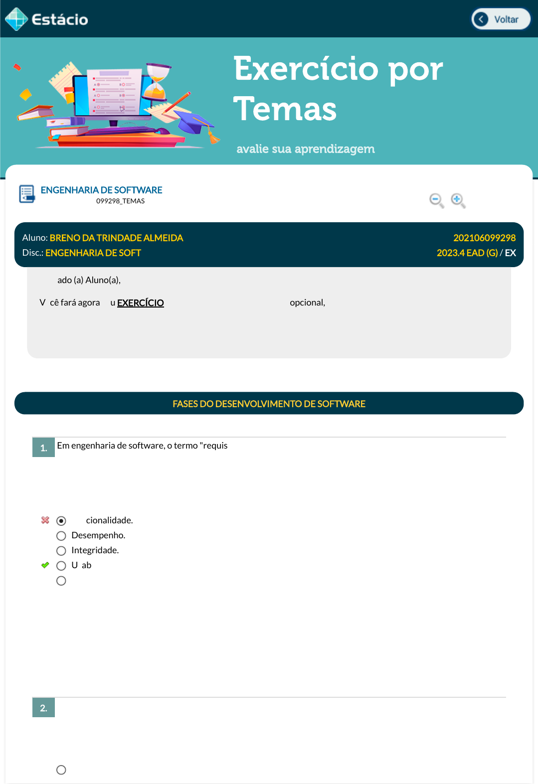 07/03/2024, 20:14 Estácio: Alunos https://simulado.estacio.br/alunos/ 1/5 Exercício por Temas avalie sua aprendizagem Em engenharia de software, o termo "requisito-chave" ou "requisito crítico" refere-se a um requisito que é considerado essencial ou de alta prioridade para o sucesso do projeto. Qual é o requisito-chave não funcional ao de�nir a interface grá�ca com o usuário? Durante a produção de um software, defeitos podem ser descobertos. Qual cenário apresenta uma solução mais rápida para um defeito identi�cado na versão de software em produção? ENGENHARIA DE SOFTWARE Lupa DGT0291_202106099298_TEMAS Aluno: BRENO DA TRINDADE ALMEIDA Matr.: 202106099298 Disc.: ENGENHARIA DE SOFT 2023.4 EAD (G) / EX Prezado (a) Aluno(a), Você fará agora seu EXERCÍCIO! Lembre-se que este exercício é opcional, mas não valerá ponto para sua avaliação. O mesmo será composto de questões de múltipla escolha. Após responde cada questão, você terá acesso ao gabarito comentado e/ou à explicação da mesma. Aproveite para se familiarizar com este modelo de questões que será usado na sua AV e AVS. FASES DO DESENVOLVIMENTO DE SOFTWARE 1. Funcionalidade. Desempenho. Integridade. Usabilidade. Segurança. Data Resp.: 07/03/2024 19:50:51 Explicação: Ao de�nir uma interface entre o usuário e o sistema, o requisito-chave não funcional é a usabilidade. 2. Ignorar o defeito. javascript:voltar(); javascript:voltar(); javascript:voltar(); javascript:voltar(); javascript:diminui(); javascript:diminui(); javascript:aumenta(); javascript:aumenta(); 07/03/2024, 20:14 Estácio: Alunos https://simulado.estacio.br/alunos/ 2/5 O projeto (ou "design", como é frequentemente chamado em inglês) é uma das etapas cruciais no ciclo de vida do desenvolvimento de software. O que são as entregas da etapa "projeto" do processo de desenvolvimento de software? Durante a fase de testes de um novo sistema de reservas online, a equipe de qualidade está empenhada em veri�car a aderência do software aos requisitos de�nidos, além de sua integração e funcionamento adequados. Qual é a principal atividade realizada na fase de testes deste sistema de reservas online? Ao implementar um novo software de gestão empresarial, a equipe de desenvolvimento se concentra em converter os modelos de projeto detalhados em código executável, mantendo em mente os padrões de qualidade e requisitos de desempenho. Qual é o principal foco da equipe durante a fase de implementação deste software de gestão empresarial? Redesenvolver todo o software. Continuar desenvolvendo a versão 2 com o defeito corrigido e liberá-la posteriormente. Corrigir o defeito na versão 1 e liberá-la imediatamente, enquanto ajusta a versão 2 em desenvolvimento. Aguardar o feedback dos usuários para a próxima iteração. Data Resp.: 07/03/2024 19:51:28 Explicação: Tecnicamente, esta é a melhor solução, pois o usuário teria de aguardar a liberação da versão 2, convivendo por um período com o impacto negativo do defeito do software no ambiente de produção. 3. Diagramas e especi�cações textuais. Plantas baixas e projetos elétricos. Código-fonte e executáveis. Programadores e analistas. Frameworks e bibliotecas. Data Resp.: 07/03/2024 19:52:11 Explicação: As entregas da etapa "projeto" são modelos, que incluem diagramas e especi�cações textuais. 4. Desenvolvimento de documentação técnica. Validação da aderência do software aos requisitos. Otimização da base de dados. Re�namento da interface do usuário. Análise de mercado para futuras expansões. Data Resp.: 07/03/2024 19:52:45 Explicação: A principal atividade durante a fase de testes de um software é a validação da aderência do software aos requisitos estabelecidos. Isso inclui garantir que todas as funcionalidades, desempenho e segurança do sistema de reservas online estejam de acordo com o que foi especi�cado na fase de engenharia de requisitos. 5. 07/03/2024, 20:14 Estácio: Alunos https://simulado.estacio.br/alunos/ 3/5 A ISO 9126 identi�ca seis atributos fundamentais de qualidade para o software. Avalie se as a�rmativas a seguir são Falsas ou Verdadeiras: [____] Confiabilidade, atributo associado ao tempo de disponibilidade do software. [____] Eficiência, atributo relacionado com a otimização dos recursos do sistema [____] Portabilidade, atributo associado à satisfação dos requisitos funcionais. Assinale a opção correta: Durante a fase de projeto de software de um aplicativo educacional, a equipe foca em de�nir a arquitetura do sistema, incluindo padrões de design para facilitar a manutenção e a escalabilidade futuras. Qual atividade é essencial na fase de projeto deste aplicativo educacional? Tradução dos modelos de projeto em código. Design de interface do usuário. Planejamento da infraestrutura de rede. Análise de requisitos do sistema. Teste de integração de sistemas. Data Resp.: 07/03/2024 19:53:42 Explicação: Na fase de implementação, o principal foco da equipe é traduzir os modelos de projeto em código executável. Este processo envolve a codi�cação com base nos projetos e especi�cações detalhados, garantindo que o software de gestão empresarial atenda aos padrões de qualidade e desempenho requeridos. 6. [V] - [V] - [F]. [V] - [V] - [V]. [V] - [F] - [F]. [V] - [F] - [V]. [F] - [V] - [V]. Data Resp.: 07/03/2024 19:54:27 Explicação: A resposta correta é: [V] - [V] - [F]. 7. Testes de usabilidade com usuários �nais. De�nição do modelo de classes do sistema. Implantação de módulos educacionais. Escolha do sistema de gerenciamento de banco de dados. Codi�cação das funcionalidades principais. Data Resp.: 07/03/2024 19:55:14 Explicação: Na fase de projeto, a de�nição do modelo de classes do sistema é crucial. Esta atividade envolve determinar a estrutura dos dados e a interação entre diferentes componentes do sistema, o que é fundamental para um aplicativo e