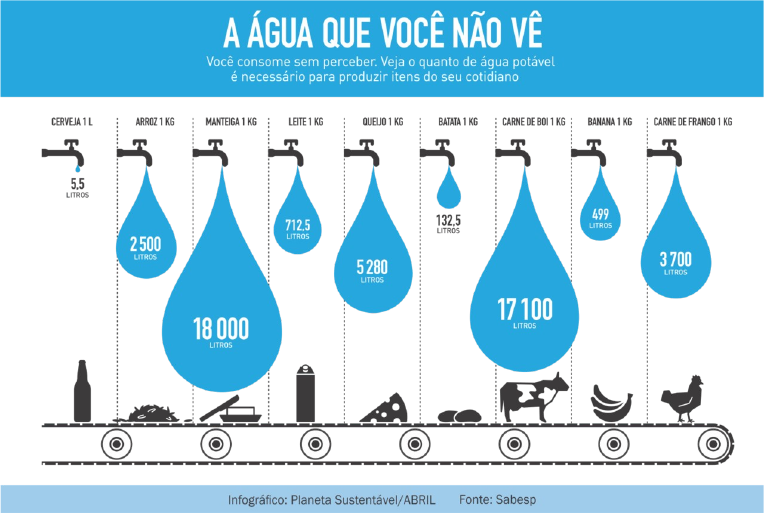 Fonte: https://novaescola.org.br/conteudo/10136/blog-alfabetizacao-leitura-escrita-producao-de-infograficos-sala-de-aula Economize A imagem acima retrata o quanto de água é utilizado diariamente para o preparo de certos produtos, ou seja, nos levando a entender o quão importante esse elemento é para nosso dia a dia e fazendo um paralelo com a importância de economizarmos por esse bem, já que ele e o fundamento da vida. Na linha inicial vemos o nome do produto e logo abaixo o consumo de água exigido para seu preparo e no final da imagem temos a imagem representando cada item referido na linha inicial. Muitas campanhas retratam a importância da economia de água falando “fechem a torneira ao escovar os dentes”, “não lave a calçada com mangueira” e embora estejam corretos em suas orientações esquecem-se também de falar o quanto gastamos nos preparos diários e que o uso consciente pode elevar ainda mais os nossos níveis de preservação. Por tanto a imagem traz informações relevantes e de suma importância para o tema: Economia de água.