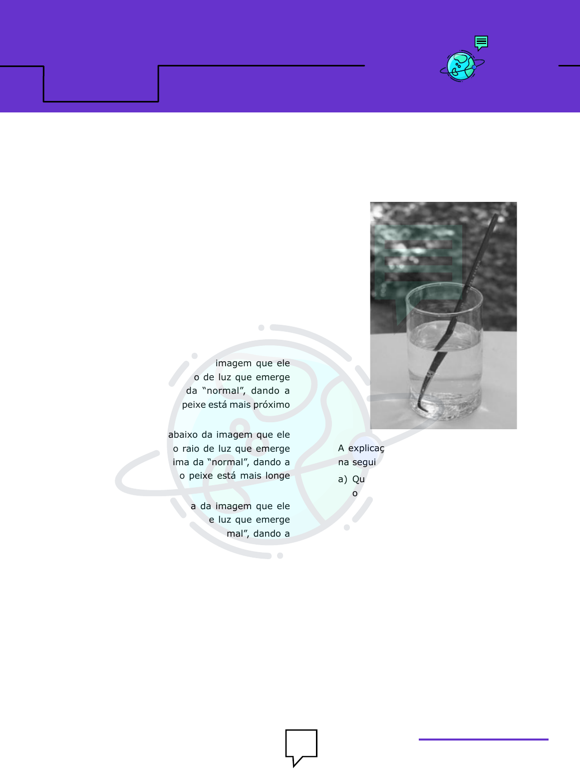 NARRADOUNIVERSO 01. (G1 - cotil 2020) Ao pescar com arco e flecha, um índio aprendeu com sua experiência que não deve lançar sua arma na direção do peixe. Considerando que a “normal” é a reta que forma com a superfície um ângulo de 90°, para que o índio atinja seu alvo ele deve lançar a flecha: a) Um pouco mais abaixo da imagem que ele está vendo, pois o raio de luz que emerge da água se afasta da “normal”, dando a impressão de que o peixe está mais próximo da superfície. b) Um pouco mais acima da imagem que ele está vendo, pois o raio de luz que emerge da água se afasta da “normal”, dando a impressão de que o peixe está mais próximo da superfície. c) Um pouco mais abaixo da imagem que ele está vendo, pois o raio de luz que emerge da água se aproxima da “normal”, dando a impressão de que o peixe está mais longe da superfície. d) Um pouco mais acima da imagem que ele está vendo, pois o raio de luz que emerge da água se aproxima da “normal”, dando a impressão de que o peixe está mais longe da superfície. 02. (G1 - ifsul 2020) Você já deve ter percebido que um objeto parece ter uma forma anormal quando mergulhado parcialmente em água, como representado na fotografia abaixo, na qual um pincel está parcialmente mergulhado em um copo com água. Essa ilusão é causada pelo fenômeno ondulatório chamado refração da luz, que ocorre quando a luz refletida pelo pincel muda de meio de propagação, passando da água para o ar. A explicação adequada para o fenômeno está na seguinte afirmação: a) Quando um feixe de luz passa da água para o ar, sua velocidade de propagação não se altera, o que provoca alteração na sua direção de propagação. b) Embora os meios ar e água apresentem o mesmo índice de refração, a velocidade de propagação da luz altera-se ao passar de um meio para o outro, gerando desvio de feixes de luz. c) O desvio dos feixes de luz deve-se meramente à ilusão de óptica gerada pela associação entre os meios água e vidro. d) Como o ar e a água apresentam diferentes índices de refração, a velocidade de propagação da luz é diferente de um meio para outro, causando o desvio de feixes de luz. 1 B-12FRENT E www.universonarrado.com.br Refração da Luz 2 www.universonarrado.com.br Lições de Física 03. (Ufpr 2019) Um dado meio tem um índice de refração n1. Um outro meio tem um índice de refração n2. Assinale a alternativa que expressa corretamente a relação entre os módulos das velocidades da luz nos dois meios, quando n n2 12= . a) v v2 14= . b) v v2 12= . c) v v2 1= . d) v v2 12 = . e) v v2 14 = . 04. (Unicamp 2018) Uma lente de Fresnel é composta por um conjunto de anéis concêntricos com uma das faces plana e a outra inclinada, como mostra a figura (a). Essas lentes, geralmente mais finas que as convencionais, são usadas principalmente para concentrar um feixe luminoso em determinado ponto, ou para colimar a luz de uma fonte luminosa, produzindo um feixe paralelo, como ilustra a figura (b). Exemplos desta última aplicação são os faróis de automóveis e os faróis costeiros. O diagrama da figura (c) mostra um raio luminoso que passa por um dos anéis de uma lente de Fresnel de acrílico e sai paralelamente ao seu eixo. Se sen( ) ,1 0 5 e sen( ) , ,2 0 75 o valor do índice de refração do acrílico é de a) 1 50, . b) 1 41, . c) 1 25, . d) 0 66, . 05. (Mackenzie 2018) Um raio de luz monocromática de frequência f Hz1 0 1015, , com velocidade v km s3 0 105, , que se propaga no ar, cujo índice de refração é igual a 1, incide sobre uma lâmina de vidro ( ),nvidro = 2 formando um ângulo 45° com a superfície da lâmina. O seno do ângulo de refração é a) 0 5, . b) 0 7, . c) 1 0, . d) 3 0, . e) 2. 06. (Famema 2018) Um raio de luz monocromático propaga-se por um meio A, que apresenta índice de refração absoluto nA = 1, e passa para outro meio B, de índice de refração nB = 2, conforme figura. 3 www.universonarrado.com.br Frente: B-12 NARRADOUNIVERSO Considere que o raio incidente forma com a normal à superfície o ângulo de 45°. Nessas condições, o ângulo de desvio ( ),d indicado na figura, é igual a a) 60°. b) 30°. c) 45°. d) 15°. e) 90°. 07. (Fgv 2018) São dados os índices de refração absolutos ( )n dos seguintes meios ópticos: nar = 1 0, , nágua = 1 3, , nvidro c = 1 5, , nvidro p = 1 8, . Um raio de luz monocromática foi emitido sobre um sistema óptico formado por 3 desses meios, obtendo-se a configuração seguinte. I e II são dióptros planos, que separam os meios A de B e B de C, respectivamente. A possível, correta e respectiva relação entre os meios A B, e C é a) água, vidro p e ar. b) ar, vidro c e vidro p. c) água, vidro c e vidro p. d) vidro c, ar e água. e) ar, água e vidro p. 08. (Upf 2018) Conta a história que Isaac Newton, trabalhando no polimento de algumas peças de vidro, conseguiu obter um prisma triangular, o qual utilizou para a sua famosa experiência da dispersão da luz branca, ilustrada na figura a seguir. Utilizando-se da palavra latina spectrum, ele descreveu o conjunto de cores que resultou dessa dispersão da luz branca ao atravessar o prisma. A explicação para o observado por Newton encontra-se associada ao fato de que cada cor que compõe o spectrum sofre um desvio diferente em virtude a) da sua polarização. b) da sua difusão. c) do seu índice de refração. d) da sua velocidade no vácuo. e) da sua interferência. 09. (Enem 2018) A figura representa um prisma óptico, constituído de um material transparente, cujo índice de refração é crescente com a frequência da luz que sobre ele incide. Um feixe luminoso, composto por luzes vermelha, azul e verde, incide na face A, emerge na face B e, após ser refletido por um espelho, incide num filme para fotografia colorida, revelando três pontos. Observando os pontos luminosos revelados no filme, de baixo para cima, constatam-se as seguintes cores: a) Ve