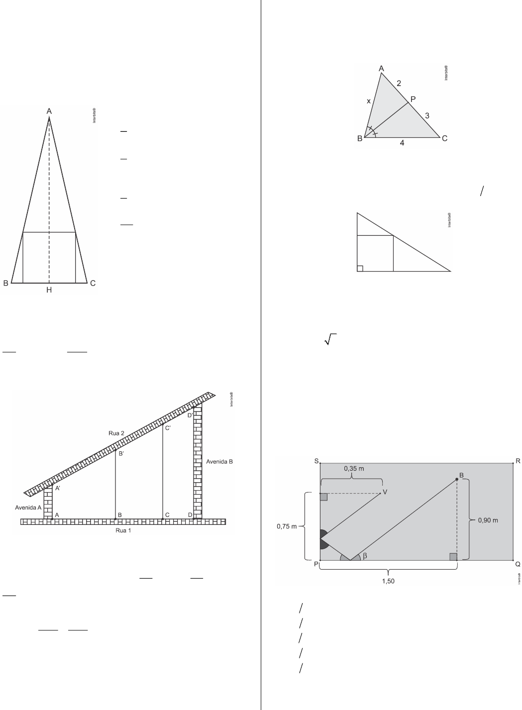 Lista de Exercícios (Complementar) – Geometria Plana - Módulo 6 (Teorema de Tales e Semelhança) waldematica.com.br 1. (UPF 2019) Na figura a seguir, estão representados o triângulo isósceles ABC e um quadrado inscrito nesse triângulo. O segmento AH é a altura do triângulo em relação à base BC. Sabe-se que o segmento AH mede 10 cm e o segmento BC mede 4 cm. Então, a medida do lado do quadrado, em centímetros, é a) 8 3 b) 9 2 c) 3 d) 5 2 e) 20 9 2. (UFU 2018) Uma área delimitada pelas Ruas 1 e 2 e pelas Avenidas A e B tem a forma de um trapézio ADD'A', com AD 90 m= e A'D' 135 m,= como mostra o esquema da figura abaixo. Tal área foi dividida em terrenos ABB'A', BCC'B' e CDD'C', todos na forma trapezoidal, com bases paralelas às avenidas tais que AB 40 m,BC 30 m= = e CD 20 m.= De acordo com essas informações, a diferença, em metros, A'B' C'D'− é igual a a) 20. b) 30. c) 15. d) 45. 3. (Acafe 2018) Analise as afirmações a seguir e assinale a alternativa que contém todas as corretas. I. No triângulo da figura, o segmento BP é bissetriz do ângulo B. Então, o valor de x é um número inteiro. II. Um quadrado está inscrito num triângulo retângulo cujos catetos medem 6 cm e 8 cm, conforme a figura. A medida da área do quadrado é 2576 49 cm . III. Se uma reta no espaço é paralela a dois planos simultaneamente, então esses planos são paralelos. IV. Se um triângulo equilátero está inscrito numa circunferência cujo raio mede 2 cm, então sua área mede 23 3 cm . a) I - III b) I - II - III c) II - III - IV d) II - IV 4. O retângulo PQRS é a representação de uma mesa de sinuca. O objetivo é alcançar a bola verde, representada pelo ponto V, com a bola branca, representada pelo ponto B. Sabe-se que o ângulo de incidência é igual ao ângulo de reflexão, como destacado na figura abaixo. Qual o valor da tangente do ângulo ?β a) 32 37 b) 33 37 c) 36 37 d) 32 35 e) 33 35 5. (IFPE 2018) Lista de Exercícios (Complementar) – Geometria Plana - Módulo 6 (Teorema de Tales e Semelhança) waldematica.com.br Em um dia ensolarado, às 10h da manhã, um edifício de 40 metros de altura produz uma sombra de 18 metros. Nesse mesmo instante, uma pessoa de 1,70 metros de altura, situada ao lado desse edifício, produz uma sombra de a) 1,20 metro. b) 3,77 metros. c) 26,47 centímetros. d) 76,5 centímetros. e) 94 centímetros. 6. (UEFS 2018) Os pontos D, E e F pertencem aos lados de um triângulo retângulo ABC, determinando o retângulo BFDE, com BF 6 cm,= conforme mostra a figura. Dadas as medidas AB 8 cm= e BC 10 cm,= o comprimento do segmento BE é a) 2,4 cm. b) 2,7 cm. c) 3 cm. d) 3,2 cm. e) 3,5 cm. 7. (IFSC 2018) Para resolver um problema clássico, o matemático grego Tales de Mileto, em viagem ao Egito, calculou a altura de uma pirâmide, usando a sombra de um bastão. Para tanto, considerou que 1) o bastão media 1m; 2) a sombra do bastão media 2 m; 3) a sombra da pirâmide, no mesmo momento, media 288 m; 4) os raios solares incidiam formando um ângulo de 27 com o solo. Considere tg 27 0,5. = Já Pitágoras, resolveria a questão usando seu teorema, considerando que a distância do topo da pirâmide à sua base (AB) era de aproximadamente 145 m e que o centro C da pirâmide estava distante do mesmo ponto B da base em 17 m. Dados: 2 2 2 2 2 2 142 20.164 143 20.449 144 20.736 145 21.025 146 21.316 147 21.609 = = = = = = Aplicando o raciocínio utilizado por um desses matemáticos, analise a figura e calcule a altura da pirâmide. A altura da pirâmide é a) 143 m. b) 146 m. c) 144 m. d) 147 m. e) 142 m. 8. (UPE 2018) Os lados de um triângulo medem, respectivamente, 5 cm, 7 cm e 8 cm. Quais são as respectivas medidas dos lados de um triângulo semelhante a este cujo perímetro mede 0,6 m? a) 15 cm, 21cm e 24 cm b) 12 cm, 22 cm e 26 cm c) 18 cm, 20 cm e 22 cm d) 11cm, 23 cm e 26 cm e) 16 cm,18 cm e 26 cm 9. (CFTMG 2018) Analise a figura a seguir. Lista de Exercícios (Complementar) – Geometria Plana - Módulo 6 (Teorema de Tales e Semelhança) waldematica.com.br Sobre essa figura, são feitas as seguintes considerações: I. r e s são retas paralelas e distam em 3 cm uma da outra. II. AB é um segmento de 1,5 cm contido em s. III. O segmento AC mede 4 cm. IV. BP é perpendicular a AC. A medida do segmento BP, em cm, é a) 8 . 9 b) 9 . 8 c) 8 . 5 d) 9 . 5 10. (PUCRJ 2018) Na figura abaixo, temos um quadrado AEDF e AC 4= e AB 6.= Qual é o valor do lado do quadrado? a) 2 b) 2,4 c) 2,5 d) 3 e) 4 11. (IFSUL) Três lotes residenciais têm frente para a rua dos Álamos e para a rua das Hortênsias, conforme a figura a seguir. As fronteiras entre os lotes são perpendiculares à rua das Hortênsias. Qual é a medida, em metros, da frente do lote A para a rua dos Álamos, sabendo-se que as frentes dos três lotes somadas medem 135 metros ? a) 55 b) 65 c) 75 d) 85 12. (Colégio Naval) Observe a figura a seguir. A figura acima apresenta o quadrilátero ABCD, com ângulos retos internos nos vértices B e D, AB 3 cm,= AD 2 cm= e CD 2AD.= Nessas condições, pode-se afirmar a) AC BD e AC BD 10 cm+ b) AC BD e AC BD 10 cm+ c) AC BD= e AC BD 10 cm+ d) AC BD e AC BD 6 cm+ e) AC BD e AC BD 6 cm+ 13. (AFA) Considere, no triângulo ABC abaixo, os pontos P AB, Q BC, R AC e os segmentos PQ e QR paralelos, respectivamente, a AC e AB. Sabendo que BQ 3 cm,= QC 1cm= e que a área do triângulo ABC é 28 cm , então a área do paralelogramo hachurado, em 2cm , é igual a a) 2 b) 3 c) 4 d) 5 14. (IFPE) Às 10 h 45 min de uma manhã ensolarada, as sombras de um edifício e de um poste de 8 metros de altura foram medidas ao mesmo tempo. Foram encontrados 30 metros e 12 metros, respectivamente, conforme ilustração abaixo. Lista de Exercícios (Complementar) – Geometria Plana - Módulo 6 (Teorema de Tales e Semelhança) waldematica.com.br De acordo com as informações acima, a altura h do prédio é de a) 12 metros. b) 18 metros. c) 16 metros. d) 14 metros. e) 20 metros. 15. (EEA