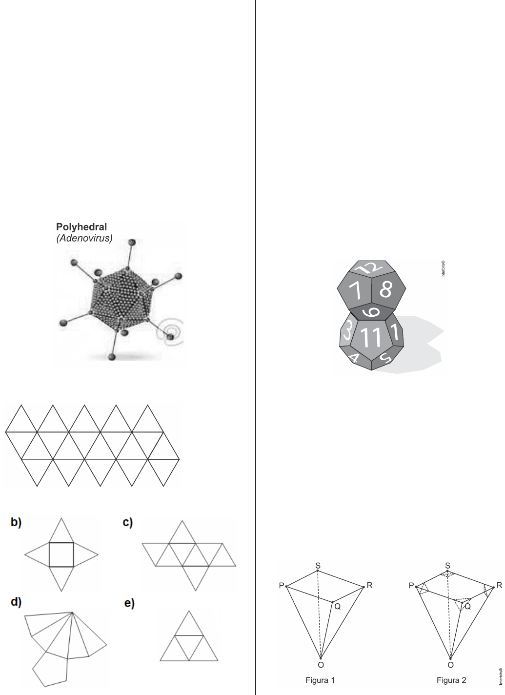 Lista de Exercícios (Única) – Geometria Espacial - Módulo 2 (Aula 2: Poliedros) waldematica.com.br 1. (UEPG) Dois poliedros regulares são construídos utilizando folhas de cartolina. Um desses poliedros tem faces pentagonais e o outro tem faces triangulares. Se a soma de todas as faces desses poliedros é 20, assinale o que for correto. 01) A soma dos ângulos de todas as faces do poliedro que tem faces pentagonais é 6.480 . 02) O poliedro com faces triangulares tem 8 vértices a menos que o outro. 04) Os dois poliedros têm o mesmo número de arestas. 08) A soma de todas as arestas desses poliedros é maior que 40. 2. (UFJF) Observe, abaixo, uma imagem desse vírus que tem a forma de um sólido geométrico. Qual é a planificação do sólido representado por esse vírus? a) 3. (Enem PPL) O hábito cristalino é um termo utilizado por mineralogistas para descrever a aparência típica de um cristal em termos de tamanho e forma. A granada é um mineral cujo hábito cristalino é um poliedro com 30 arestas e 20 vértices. Um mineralogista construiu um modelo ilustrativo de um cristal de granada pela junção dos polígonos correspondentes às faces. Supondo que o poliedro ilustrativo de um cristal de granada é convexo, então a quantidade de faces utilizadas na montagem do modelo ilustrativo desse cristal é igual a a) 10. b) 12. c) 25. d) 42. e) 50. 4. (UERJ) Dois dados, com doze faces pentagonais cada um, têm a forma de dodecaedros regulares. Se os dodecaedros estão justapostos por uma de suas faces, que coincidem perfeitamente, formam um poliedro côncavo, conforme ilustra a figura. Considere o número de vértices V, de faces F e de arestas A desse poliedro côncavo. A soma V F A+ + é igual a: a) 102 b) 106 c) 110 d) 112 5. (Enem) Um lapidador recebeu de um joalheiro a encomenda para trabalhar em uma pedra preciosa cujo formato é o de uma pirâmide, conforme ilustra a Figura 1. Para tanto, o lapidador fará quatro cortes de formatos iguais nos cantos da base. Os cantos retirados correspondem a pequenas pirâmides, nos vértices P, Q, R e S, ao longo dos segmentos tracejados, ilustrados na Figura 2. Lista de Exercícios (Única) – Geometria Espacial - Módulo 2 (Aula 2: Poliedros) waldematica.com.br Depois de efetuados os cortes, o lapidador obteve, a partir da pedra maior, uma joia poliédrica cujos números de faces, arestas e vértices são, respectivamente, iguais a a) 9, 20 e 13. b) 3, 24 e 13. c) 7,15 e 12. d) 10,16 e 5. e) 11,16 e 5. 6. (Enem PPL) Os sólidos de Platão são poliedros convexos cujas faces são todas congruentes a um único polígono regular, todos os vértices têm o mesmo número de arestas incidentes e cada aresta é compartilhada por apenas duas faces. Eles são importantes, por exemplo, na classificação das formas dos cristais minerais e no desenvolvimento de diversos objetos. Como todo poliedro convexo, os sólidos de Platão respeitam a relação de Euler V A F 2,− + = em que V, A e F são os números de vértices, arestas e faces do poliedro, respectivamente. Em um cristal, cuja forma é a de um poliedro de Platão de faces triangulares, qual é a relação entre o número de vértices e o número de faces? a) 2V 4F 4− = b) 2V 2F 4− = c) 2V F 4− = d) 2V F 4+ = e) 2V 5F 4+ = 7. (UECE) Um poliedro convexo com 32 vértices possui apenas faces triangulares. O número de arestas deste poliedro é a) 100. b) 120. c) 90. d) 80. 8. (UPF) O poliedro representado na figura (octaedro truncado) é construído a partir de um octaedro regular, cortando-se, para tal, em cada vértice, uma pirâmide regular de base quadrangular. A soma dos ângulos internos de todas as faces do octaedro truncado é: a) 2160 b) 5760 c) 7920 d) 10080 e) 13680 9. (Enem) Para o modelo de um troféu foi escolhido um poliedro P, obtido a partir de cortes nos vértices de um cubo. Com um corte plano em cada um dos cantos do cubo, retira-se o canto, que é um tetraedro de arestas menores do que metade da aresta do cubo. Cada face do poliedro P, então, é pintada usando uma cor distinta das demais faces. Com base nas informações, qual é a quantidade de cores que serão utilizadas na pintura das faces do troféu? a) 6 b) 8 c) 14 d) 24 e) 30 10. (UEL) Leia o texto a seguir. Originalmente os dados eram feitos de osso, marfim ou argila. Há evidências da existência deles no Paquistão, Afeganistão e noroeste da Índia, datando de 3500 a.C. Os dados cúbicos de argila continham de 1 a 6 pontos, dispostos de tal maneira que a soma dos pontos de cada par de faces opostas é sete. Adaptado de: Museu Arqueológico do Red Fort. Delhi, India. Atualmente, além dos dados em forma de cubo (hexaedro), encontram-se dados em vários formatos, inclusive esféricos, como mostram as figuras a seguir. Apesar do formato esférico, ao ser lançado, o dado mostra pontos de um a seis, como se fosse um dado cúbico. Isso acontece porque no interior da esfera existe uma cavidade em forma de octaedro, na qual existe um peso (um chumbinho) que se aloja em um dos vértices do octaedro. Assinale a alternativa que apresenta, corretamente, a propriedade dos poliedros regulares que justifica o fato de a cavidade no interior da esfera ser octaédrica. a) O número de vértices do octaedro é igual ao número de faces do hexaedro. b) O número de vértices do octaedro é diferente do número de faces do hexaedro. c) O número de arestas do octaedro é igual ao número de arestas do hexaedro. d) O número de faces do octaedro é igual ao número de vértices do hexaedro. e) O número de faces do octaedro é diferente do número de vértices do hexaedro. Lista de Exercícios (Única) – Geometria Espacial - Módulo 2 (Aula 2: Poliedros) waldematica.com.br 11. (UEMA) A bola de futebol evoluiu ao longo do tempo e, atualmente, é um icosaedro truncado, formado por 32 peças, denominadas de gomos e, geometricamente, de faces. Nessa bola, 12 faces são pentágonos regulares, e as outras, hexágonos, també