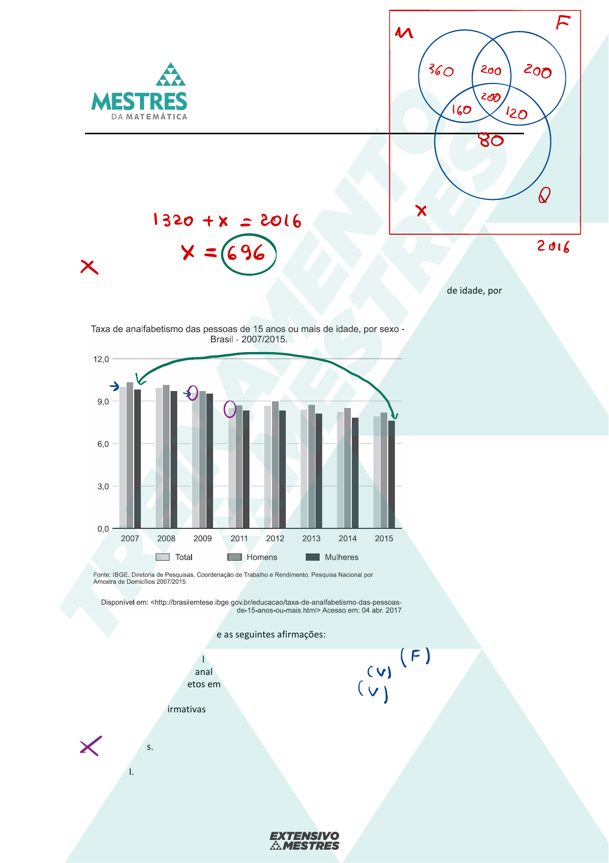 TREINAMENTO DE VELOCIDADE ON-LINE Lista 1 - Resolução 1. Em uma enquete, realizada com 2016 candidatos a uma das vagas nos cursos do IFAL, para saber em quais matérias, entre Matemática, Física e Química, eles sentiam mais dificuldade, obteve-se o seguinte resultado: 920 sentiam dificuldade em Matemática, 720 em Física, 560 em Química, 400 em Matemática e Física, 360 em Matemática e Química, 320 em Física e Química e 200 nas três matérias. O número de candidatos que afirmaram não ter dificuldade em nenhuma matéria é a) 136. b) 336. c) 416. d) 576. e) 696. 2. O gráfico abaixo apresenta a taxa de analfabetismo de pessoas de 15 anos ou mais de idade, por sexo, no Brasil. De acordo com o gráfico, analise as seguintes afirmações: I. O número de homens analfabetos em 2007 é menor do que em 2009. II. O número de mulheres analfabetas diminui de 2007 a 2015. III. O número de analfabetos em 2009 é maior do que em 2011. Estão corretas as afirmativas a) I e III apenas. b) I e II apenas. c) II e III apenas. d) I, II e III. e) apenas I. ... . .. × X =④ 2016 →A .O ( u, (F) ( u ) × T R E IN A M E N T O M E ST R E S EXTENSIVO MESTRES 3. Um fazendeiro resolveu cercar um terreno de formato retangular, cujas dimensões eram 60 metros de largura e 80 metros de comprimento, gastando R$ 20,00 para cada metro linear da cerca. Qual o valor total do gasto para cercar todo o terreno? a) R$ 2.800,00. b) R$ 4.800,00. c) R$ 5.600,00. d) R$ 6.800,00. e) R$ 9.600,00. 4. Em 20 de fevereiro de 2011 ocorreu a grande erupção do vulcão Bulusan nas Filipinas. A sua localização geográfica no globo terrestre é dada pelo GPS (sigla em inglês para Sistema de Posicionamento Global) com longitude de 124° 3’ 0” a leste do Meridiano de Greenwich. Dado: 1° equivale a 0’ e 1’ equivale a 0”. PAVARIN, G. Galileu, fev. 2012 (adaptado) A representação angular da localização do vulcão com relação a sua longitude da forma decimal é a) 124,02°. b) 124,05°. c) 124,20°. d) 124,30°. e) 124,50°. Perímetro = 60+80+60+80 = 280 m × 280.20 = 5600ft × 1° - ao ' X - 3 ' × = (E) ° = 0,05 . 12403' o " = 1240 ? 3 ' =1240-10,050=429,0550T R E IN A M E N T O M E ST R E S EXTENSIVO MESTRES 5. Em um círculo recortado em papel cartão foi feito o desenho de um homem estilizado. Esse círculo foi utilizado para montar uma roleta, conforme a figura 1, fixada em uma parede. Quando a roleta é acionada, o círculo gira livremente em torno do seu centro, e o triângulo indicador permanece fixo na parede. Considerando, inicialmente, a imagem do homem na posição da figura 1, obtém-se, após a roleta realizar uma rotação de três quartos de volta, no sentido horário, a figura representada em a) b) c) d) e) 6. Tertulino irá viajar e deseja guardar seus CDs de arrocha em sacolas plásticas. Para guardar os CDs em sacolas que contenham 60 unidades, serão necessárias 15 sacolas plásticas. Na mesma proporção, se os CDs forem guardados em sacolas com 75 unidades, quantas sacolas serão necessárias? a) 11 b) 13 c) 12 d) 14 e) 10 ]34 De volta , × × 60 . 15 = 500 CD's 900 LE O 12sa T R E IN A M E N T O M E ST R E S EXTENSIVO MESTRES nt ra - 12 0. 15 6. 89 6- 05 - gu sta vo na sc i 7. Use a tabela para responder à questão. CAMPÚS MODALIDADE CURSO INSCRITOS VAGAS Barreiros Proeja Técnico em operador de computador - Noite 144 40 Barreiros Integrado Técnico em agropecuária – Integral 209 140 Recife Proeja Técnico em refrigeração e climatização – Noite 322 40 Recife Subsequente Técnico em refrigeração e climatização - Noite 448 40 Vitória de Santo Antão Integrado Técnico em agropecuária – Integral 415 120 Vitória de Santo Antão Subsequente Técnico em zootecnia – Manhã 136 40 Vitória de Santo Antão Proeja Técnico em agricultura – Noite 28 32 Vitória de Santo Antão Proeja Técnico em manutenção e suporte em informática – Noite 78 32 Disponível em: <http://cvest.ifpe.edu.br/vestibular2017_1/arquivos/Concorrencia_sem_tipo_de_cota.pdf>. Acesso: 02 maio 2017 (adaptado). Com base nos dados apresentados na tabela acima, podemos afirmar que o total de candidatos inscritos no vestibular do IFPE 2017.1, modalidade PROEJA, foi de a) 472. b) 969. c) 572. d) 1.078. e) 948. x Somando os cursos " proeza " , temos : 144+3221-28+78=5720T R E IN A M E N T O M E ST R E S EXTENSIVO MESTRES 8. Durante uma aula de Matemática para o 6º ano do Colégio Militar do Rio de Janeiro, o professor Flávio escreveu no quadro a seguinte distribuição dos números naturais: Mantendo-se a disposição acima, pode-se afirmar que o número que inicia a 21ª linha é um a) divisível por 7. b) divisível por 3. c) múltiplo de 4. d) primo. e) par. 9. O primeiro computador que surgiu foi o ENIAC, sigla em inglês que significa Integrador e Computador Numérico e Eletrônico. Segundo a Wikipédia (COMPUTADOR, 2009), o computador surgiu na década de 1940, durante a Segunda Guerra Mundial, para ajudar o exército americano a realizar cálculos de precisão necessários para o lançamento de mísseis e bombas, pois, através de cálculos manuais, os resultados eram obtidos em 12 horas. Com o ENIAC, os mesmos cálculos levavam 30 segundos! Disponível em: <http://redeetec.mec.gov.br/images/stories/pdf/eixo_infor_comun/tec_man_sup/081112_manut _mont.pdf>. Acesso: 02 maio 2017 (adaptado). Com base no texto, em quantas horas, os resultados manuais seriam obtidos, sabendo que realizados no computador ENIAC, os mesmos cálculos foram feitos em 5 minutos? a) 300 horas. b) 100 horas. c) 150 horas. d) 120 horas. e) 180 horas. o- R -222 0-3 a-a G- s ? Linha 210 -5 . 202 = 400 ( vítima ) × Próximo =④Cápua ( rio Da Linha 21 ) × 2 cálculos por minuto 2. 5 = 10 cálculos 12 horas → 12 . lo = 120in T R E IN A M E N T O M E ST R E S EXTENSIVO MESTRES 10. Uma ração para passarinhos é composta por 3 tipos de sementes: X, Y e Z. A tabela abaixo mostra as quantidades, em gramas, de dois nutri