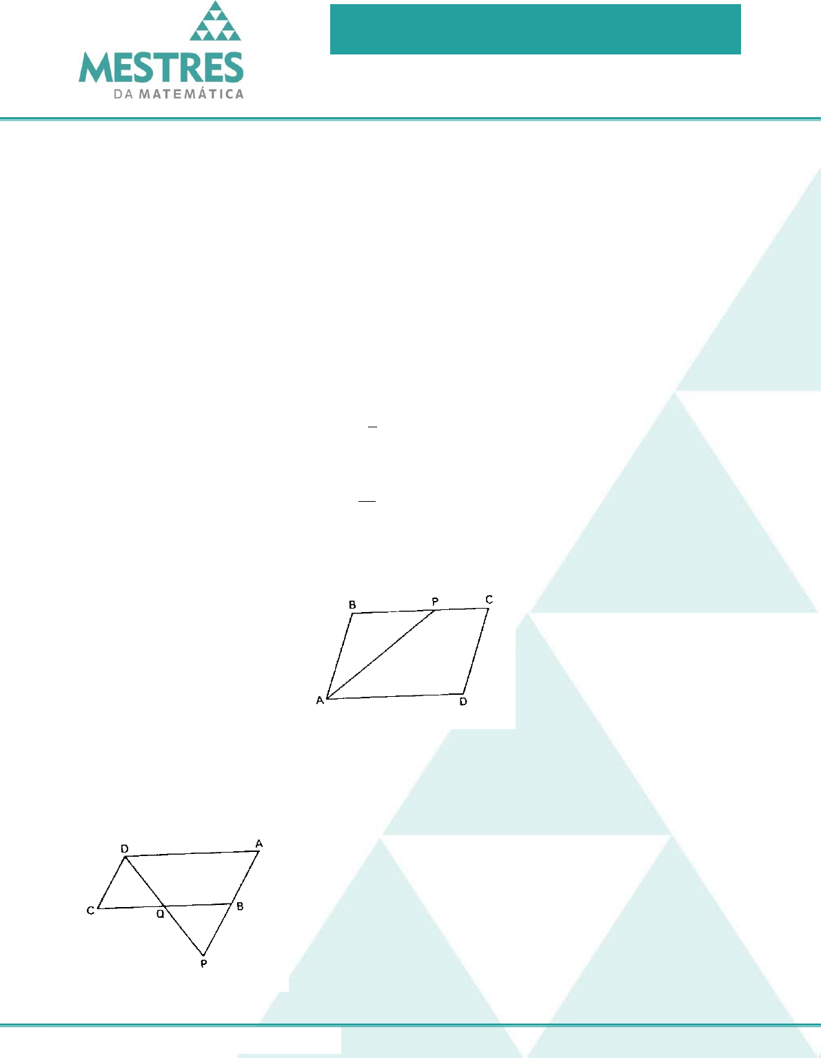 Exercícios de Aprendizagem GEOMETRIA PLANA 1 www.mestresdamatematica.com.br QUADRILÁTEROS – PARTE 3 Q1) Em um losango um dos ângulos mede o dobro do outro. Se a diagonal menor mede 6 cm calcule: a) o perímetro desse losango b) a diagonal maior desse losango Q2) Calcule os lados de um paralelogramo, sabendo que o seu perímetro mede 84 m e que a soma dos lados menores representa 5 2 da soma dos lados maiores. Q3) Sendo ABCD um paralelogramo, AP é bissetriz, AB = 7 cm e PC = 3 cm, determine o perímetro do paralelogramo. Q4) Se ABCD é um paralelogramo, AD = 20 cm, BQ = 12 cm e BP = BQ, determine o perímetro desse paralelogramo.