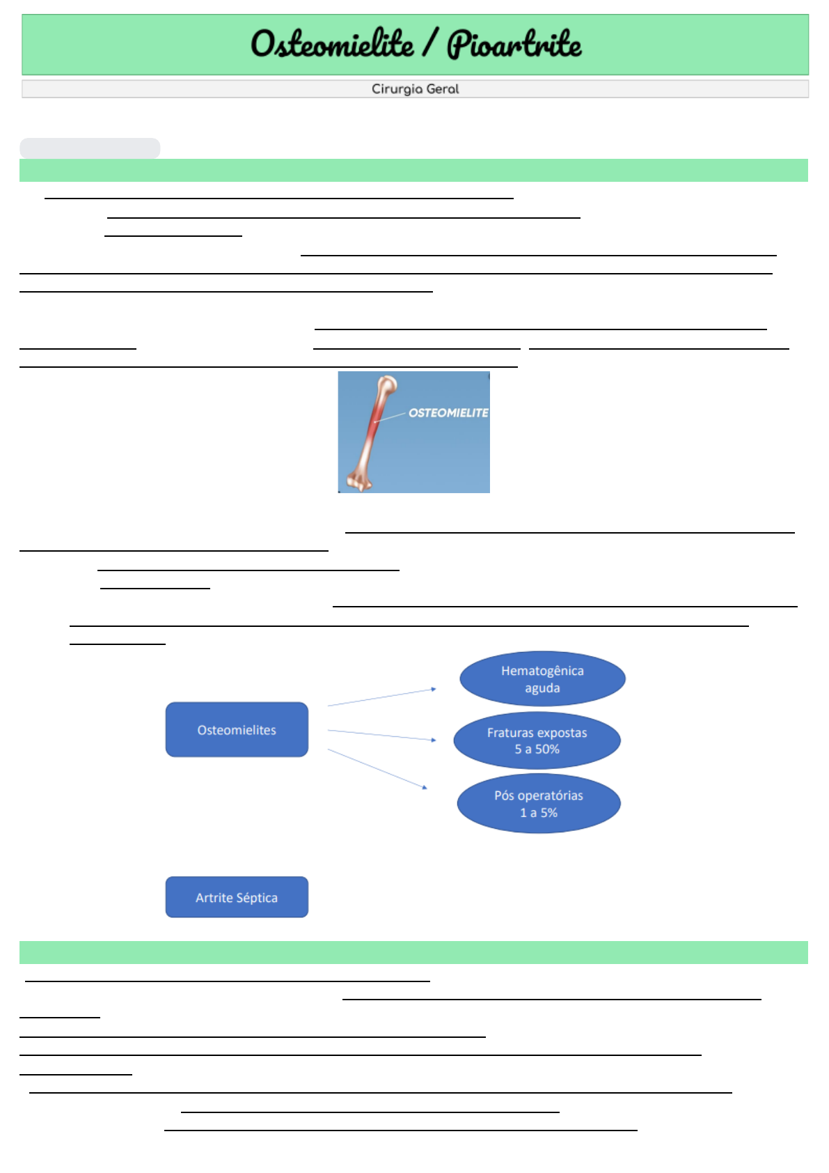 Medicina - 6º Semestre - Ana Paula Cuchera e Eduarda Costa Profº Carlos 9 de out. de 2023 Introdução - A osteomielite é uma condição inflamatória\infecciosa do osso causada por um organismo infectante, bactéria ou fungo (mais comumente Staphylococcus aureus) - Acomete um ou mais ossos - De forma geral, a infecção óssea é: hematogênica (originada de bacteremia), inoculação direta (fraturas expostas) ou de foco contíguo (originada de um foco de infecção adjacente à área da osteomielite - Abscesso no dente e entra na maxila) - A despeito dessas causas diferentes, todas as formas de osteomielite aguda podem evoluir e se tornar crônicas, compartilhando uma fisiopatologia final comum, com um invólucro de tecido mole comprometido ao redor do osso novo morto, infectado e reativo. - Infecção óssea → infecção ruim, já que o osso é tecido pouco vascularizados em relação aos outros, o que dificulta a chegada do antibiótico - Tem que lavar as infecções, tirar parte infectada - Infecção difícil de curar ● Em alguns casos o que ocorre é a diminuição das bactérias → osteomielite sede e a pessoa fica sem infecção, mas quando tem uma baixa da imunidade essa pessoa pode desenvolver osteomielite 1- Hematogênica Aguda - Foco distante que chega no osso através do sangue - Processo infeccioso intra ósseo, devido a foco infeccioso distante e disseminação do germe via sanguínea - É considerada urgência e o tratamento deve ser hospitalar. - Mais comum em crianças – que podem ser acometidas em qualquer idade – osso mais vascularizados - Subnutridos e desnutridos têm mecanismos de defesa mais baixos favorecendo a infecção, assim como portadores de leucoses, diabetes, hemoglobinopatias, HIV e etc - Geralmente com porta de entrada à distância: piodermites, otites, amigdalites. 1 - Nas metáfises de ossos longos, especialmente nas próximas ao joelho e ombro. ● Começa na metáfise porque tem os sinusóides ● Ocorrem nessas áreas, pois tem mais sangue (na fise de crescimento) - Nas metáfises ocorrem lagos venosos sinusoidais, com fluxo lento e baixa concentração de monócitos que favorecem a fixação bacteriana ● Região metafisária é a propícia para crescimento bacteriana (por causa dos sinusóides) ● Depois da metáfise ela se expande para outras áreas Epidemiologia - 21.8 casos por 100,000 pessoas-ano entre 1969 e 2009. - Durante o período do estudo, as taxas de incidência permaneceram estáveis entre crianças e adultos jovens (com menos de 50 anos de idade), mas quase triplicaram entre os idosos, sobretudo em decorrência de um aumento secular nos casos relacionados à diabetes - Em crianças: meninos > meninas Fisiopatologia ● Bacteremia ● Artéria Nutrícia ○ entra na parte medular do osso e se divide para proximal e distal ● Capilares sinusóides ● Multiplicação bacteriana - Formação de abscesso intra ósseo, este tampa a cortical (abscesso subperiosteal) → infecção entre a cortical e o periósteo → rompe periósteo e com isso faz abscesso nos tecidos moles (músculos) ● Se não tratado gera fístula na pele (característica osteomielite crônica) - Como tratar abscesso: drenar ● Depois que forma o abscesso na osteomielite, tem que fazer cirurgia para drenar, pois antibiotico nao chega no abscesso (está encapsulado) 2 Quadro clínico ● Depende da localização e da idade. ● Manifestações sistêmicas: febre, calafrios ● Dor localizada, claudicação antálgica, pseudoparalisia ● Aumento de volume local, calor (maiores quanto maior for acometimento) ● Rubor estará presente já no início se o osso for superficial ● Palpação revela dor na zona metafisária (e não na articulação) ● Se quadro progride, rompe abscesso e melhora dor OBS! Celulite → quando o quadro de vermelhidão é exagerado 3 Laboratório ● Hemograma: leucocitose com desvio à esquerda ● VHS aumentado ● Proteína C reativa eleva-se nas primeiras 6hs e é mais específica ● Hemocultura positiva em 50% casos ● Raio X - normal OBS! VHS aumentado → inespecífico - ele é bom para saber se o antibiótico está fazendo efeito (con trole do tratamento) - Diagnóstico é clínico !! ● Pois o exame de sangue é inespecífico e raio x é normal Estudo radiográfico - Raio X: ● Primeiros dias revela alteração partes moles ● 7-14 dias - Levantamento periosteal com formação de osso lamelar (casca de cebola) – abscesso subperiosteal, pus passa cortical. ● 14-21 dias – rarefação óssea OBS! Imagem 1 = casca de cebola - Reação de periósteo → de vários tipos ocorre na casca de cebola - Casca de cebola → ficar várias marcas pela formação de pus e cicatrização que ocorre OBS! Imagem 2: periósteo levanta → ossifica → forma raios de sol → buraco (pus ou tumor) - Cintilografia óssea de corpo inteiro: para diagnóstico precoce ● Hipercaptação dentro das primeiras 24hs. ● Baixa especificidade, reflete aumento do fluxo e atividade osteoblástica (lesões tumorais ou pós trauma). ● Identificação de múltiplos focos 4 OBS! Radiografia de criança, pois a metáfise está muito preta (muito sangue e divisão celular nas fises de crescimento) - Partes pretas: fise de crescimento captam muitas células novas - RM: ● Precoce. ● Útil na suspeita de osteomielite vertebral, discite e esqueleto axial e pelve. ○ Porém é de difícil acesso , tem que marcar em outro local, etc. ● Abscesso subperiosteal aparece como hipossinal em T1 e hipersinal em T2. ● Injeção de contraste paramagnético (gadolínio) facilita diferenciação entre inflamação e infecção. Tratamento - Tratamento precoce adequado é o principal fator para um desfecho positivo - antes da instalação do abscesso. - Internar e avaliação completa clínica e laboratorial de urgência - Conservador com ATB parenteral, repouso e proteção do membro pode ter sucesso se iniciado nas primeiras 24-48hs. - Melhora de