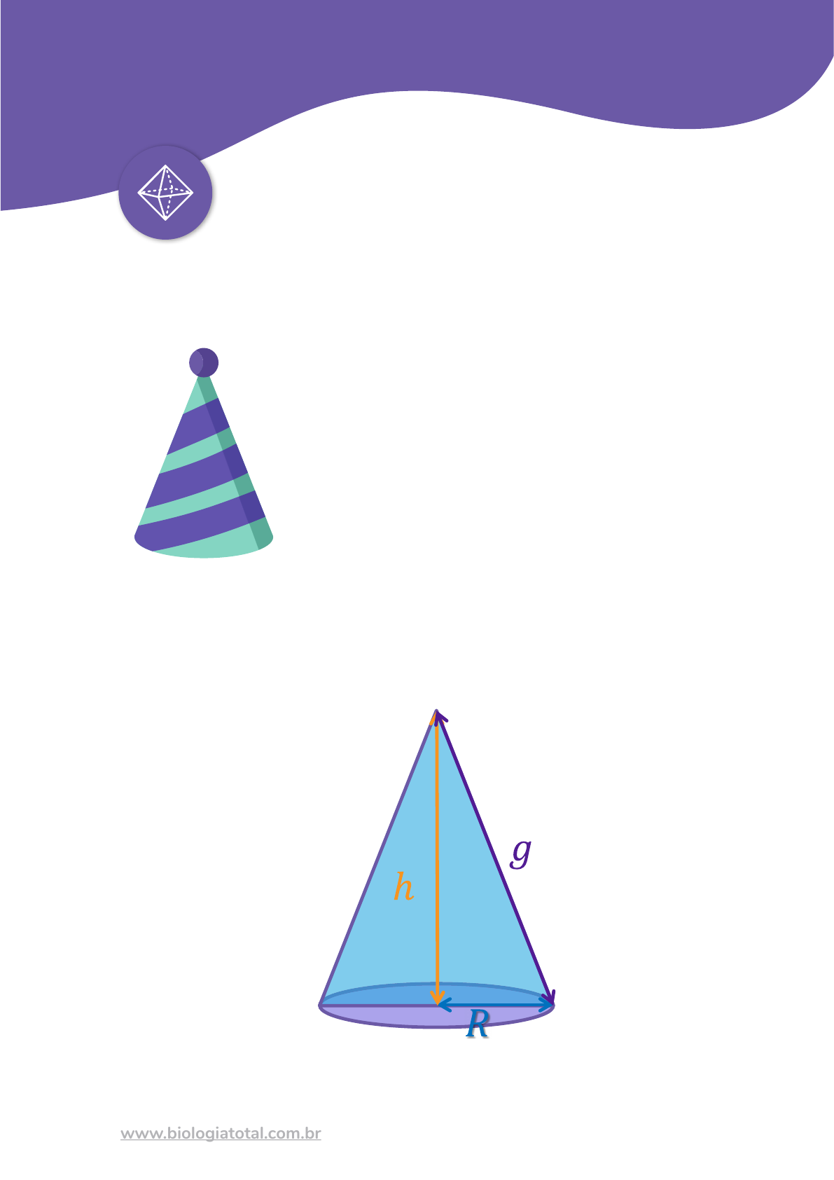 1www.biologiatotal.com.br CONE Você lembra quando, na sua infância, você era convidado para as festas de aniversário (e talvez até tenha feito uma) em que todos os convidados colocavam o chapéu temático ilustrado abaixo para esta celebração? Tirando a bolinha colorida no topo desse chapéu, ele tem o formato de um cone. Vamos estudar esse sólido e suas propriedades, começando pela sua definição matemática. Definição 1. Considere um plano α que contenha um círculo C e um ponto 𝑃 fora de α. Dizemos que um cone é um sólido formado pela união entre os segmentos de reta que partem do círculo e chegam até 𝑃. Obs.: O círculo do cone contido no plano é chamado de base e o ponto 𝑃 é chamado de vértice. Observe a figura abaixo. Como a base do cone é um círculo, ela possui um raio 𝑅 associado. Além disso, o segmento de reta perpendicular que une o vértice à um ponto da base é chamado de altura ℎ do cone. Por fim, os segmentos de reta que unem o vértice a um ponto na circunferência da base são chamados de geratrizes, denotadas abaixo por 𝑔. 2 Co ne TIPOS DE CONE Os cones podem ser classificados em retos, quando o segmento de reta que une o vértice e o centro da base é perpendicular ao plano, e oblíquos no caso deste segmento de reta não ser perpendicular ao plano. Observe na ilustração abaixo estes dois tipos de cones. � RD H L a a K R D HL � K a a Obs.: salvo se dito ou ilustrado o contrário, sempre que falarmos em cone, estamos nos referindo ao caso do cone reto. PERÍMETRO E ÁREA DO CONE O perímetro da base é o perímetro de um círculo: A área da base é dada pela seguinte equação: Note na figura abaixo que, ao “retirarmos” a lateral do cone e colocarmos sobre um plano, vemos que ela possui um formato de um setor circular com um ângulo α associado (em graus). Perceba também que o comprimento do arco desse setor circular é exatamente igual ao perímetro da base, ou seja, de 2𝜋𝑅 . Cone Reto Cone Oblíquo 3www.biologiatotal.com.br Co ne Sabendo disso, podemos agora calcular a área lateral do cone, que nada mais é do que a área deste setor circular: 360° − 𝜋𝑅 2 𝛼 − 𝐴𝑙𝑎𝑡𝑒𝑟𝑎𝑙 Temos então: Com α dado em graus. Assim, a área total do cone é a soma da área lateral encontrada com a área da base: 𝐴𝑐𝑜𝑛𝑒 = 𝐴𝑙𝑎𝑡𝑒𝑟𝑎𝑙 + 𝐴𝐵 Uma vez que falamos da área, seguimos agora para falar do volume do cone. Ele é calculado de forma igual à vista no caso da pirâmide: Existe um caso especial de cone, semelhante ao visto para o cilindro, que ocorre quando a sua geratriz é exatamente igual ao diâmetro da base. Ele é chamado de cone equilátero. 𝑔 = 2𝑅 http://www.biologiatotal.com.br 4 Co ne Calcule o valor da geratriz de um cone equilátero de volume 15𝜋 𝑐𝑚³ e altura 5 𝑐𝑚. Resolução: Para calcular o valor da geratriz do cone equilátero, basta encontrarmos primeiro o valor do raio de sua base. Como o exercício nos forneceu seu volume, temos: Logo, com o valor do raio, calculamos sua geratriz: 𝑔 = 2 . 𝑅 𝑔 = 2 . 3 𝑔 = 6 𝑐𝑚 Assim, este cone equilátero possui uma geratriz com valor de 6 𝑐𝑚. TRONCO DE CONE Observe a figura abaixo, a qual ilustra-se um cone de altura 𝐻 e raio da base 𝑅 . h Hr R G g EXERCÍCIO RESOLVIDO 5www.biologiatotal.com.br Co neO tronco de cone é o sólido que resta ao realizarmos um “corte” na seção transversal do cone “inteiro”. Este corte separa o tronco (parte de baixo) e um novo cone (parte de cima). Na figura abaixo, representamos o tronco de pirâmide obtido quando realizamos este corte na pirâmide da imagem anterior. h R r hT gT r O novo cone e o cone maior anterior possuem algumas relações entre si: Onde 𝐴𝑏 é a área da base do cone menor e 𝐴𝐵 é a área da base do tronco (que coincide com a área da base do cone maior, anterior ao corte). Além disso, 𝑉𝑝 é o volume do cone menor e 𝑉𝑡𝑜𝑡𝑎𝑙 é o volume do cone maior (antes do corte). http://www.biologiatotal.com.br 6 Co ne Vamos examinar com mais detalhes a forma do tronco de cone. Representamos algumas grandezas importantes na figura abaixo. R r hT gT Denotamos como ℎ𝑇 a altura do tronco de cone, 𝑅 como o raio da base “maior” e 𝑟 como o raio da base “menor”. Além disso, este tronco possui uma geratriz que chamamos de 𝑔𝑇. Observe na figura abaixo que a lateral do tronco de cone é formada por uma coroa circular onde a circunferência de “dentro” possui raio 𝑟 e circunferência de “fora” possui raio 𝑅 : gT gT Assim, para calcular a área lateral do tronco de cone, utilizamos a seguinte relação: 𝐴𝑙𝑎𝑡𝑒𝑟𝑎𝑙 = 𝜋. (𝑟 + 𝑅 )𝑔𝑇 Além disso, a área total do tronco é a soma da área lateral com as áreas das duas bases (de baixo e de cima): 𝐴𝑡𝑟𝑜𝑛𝑐𝑜 = 𝐴𝑙𝑎𝑡𝑒𝑟𝑎𝑙 + 𝐴𝑏 + 𝐴𝐵 Por fim, vamos estudar sobre o volume deste sólido. O tronco de cone possui um volume que pode ser calculado como o volume do cone total (antes do “corte” do tronco) subtraído do volume do cone menor obtido: 𝑉𝑡𝑟𝑜𝑛𝑐𝑜 = 𝑉𝑡𝑜𝑡𝑎𝑙 − 𝑉𝑝 Calcula-se, através de algumas deduções, o volume do tronco de cone e chegamos no seguinte resultado: 7www.biologiatotal.com.br Co neObs.: este resultado é similar ao visto para o caso do tronco de pirâmide. Considere um cone qualquer de volume igual a V. Se fizermos um corte na seção deste cone exatamente na metade da sua altura, qual será o volume do tronco de cone obtido após este corte? Resolução: Antes de calcular o volume do tronco de cone, sabemos que o volume do cone menor e do cone total se relacionam com a altura através da seguinte fórmula: Como a altura do cone menor é exatamente a metade da altura do cone total, temos: É isso mesmo! Como o corte foi feito exatamente na met