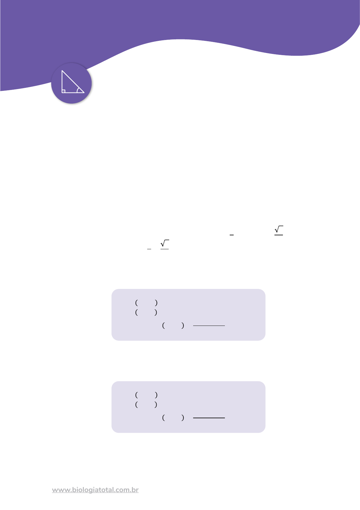 1www.biologiatotal.com.br OPERAÇÕES COM ARCOS Nesta apostila aprenderemos mais algumas ferramentas para calcular o seno, cosseno e tangente de arcos que não estão na tabela trigonométrica. A ideia será relacionar esses arcos quaisquer (arcos diferentes de 30°, 45° e 60°) com os arcos da tabela trigonométrica através da soma, subtração, multiplicação e divisão de arcos. Vamos começar? SOMA DE ARCOS Como você faria para calcular as razões trigonométricas de um arco que não está na tabela trigonométrica, como o seno de 75°, por exemplo? Bom, 75° pode ser visto como a soma de 10° e 65°, 20° e 55°, 35 e 40° e assim por diante, porém não conhecemos o seno de nenhum desses arcos. Mas 75° também pode ser visto como a soma de 30° e 45° e o seno desses ângulos já conhecemos: 𝑠𝑒𝑛 30° = 1 2 e 𝑠𝑒𝑛 45° = 2 2 . Ah, então o seno de 75° é igual a soma de 𝑠𝑒𝑛 30° = 1 2 + 𝑠𝑒𝑛 45° = 2 2 ? A reposta é não, pois o sen (30°+45°) é diferente de sen 30° + sen 45°! A maneira correta de calcular as razões trigonométricas desses ângulos é a que veremos agora. Para isso, considere a e b arcos quaisquer. Temos então: 𝒔𝒆𝒏 𝒂 + 𝒃 = 𝒔𝒆𝒏 𝒂 � 𝒄𝒐𝒔 𝒃 + 𝒔𝒆𝒏 𝒃 � 𝒄𝒐𝒔 𝒂 𝒄𝒐𝒔 𝒂 + 𝒃 = 𝒄𝒐𝒔 𝒂 � 𝒄𝒐𝒔 𝒃 − 𝒔𝒆𝒏 𝒂 � 𝒔𝒆𝒏 𝒃 𝒕𝒈 𝒂 + 𝒃 = 𝒕𝒈 𝒂+ 𝒕𝒈 𝒃𝟏 − 𝒕𝒈 𝒂 . 𝒕𝒈 𝒃 SUBTRAÇÃO DE ARCOS Assim como podemos somar arcos, também podemos subtraí-los. Vamos ver como: 𝒔𝒆𝒏 𝒂 − 𝒃 = 𝒔𝒆𝒏 𝒂 � 𝒄𝒐𝒔 𝒃 − 𝒔𝒆𝒏 𝒃 � 𝒄𝒐𝒔 𝒂 𝒄𝒐𝒔 𝒂 − 𝒃 = 𝒄𝒐𝒔 𝒂 � 𝒄𝒐𝒔 𝒃 + 𝒔𝒆𝒏 𝒂 � 𝒔𝒆𝒏 𝒃 𝒕𝒈 𝒂 − 𝒃 = 𝒕𝒈 𝒂 − 𝒕𝒈 𝒃𝟏 + 𝒕𝒈 𝒂 . 𝒕𝒈 𝒃 Exemplo: Calcule as razões trigonométricas de 15°. 2 O pe ra çõ es c om a rc os Solução: 𝑠𝑒𝑛 15° = 𝑠𝑒𝑛 45° − 30° = 𝑠𝑒𝑛45° � 𝑐𝑜𝑠30° − 𝑠𝑒𝑛30° � 𝑐𝑜𝑠45° = 2 2 � 3 2 − 1 2 ∙ 2 2 = 6 4 − 2 4 = 6 − 2 4 𝑐𝑜𝑠 15° = 𝑐𝑜𝑠 45° − 30° = 𝑐𝑜𝑠45° � 𝑐𝑜𝑠30° + 𝑠𝑒𝑛45° � 𝑠𝑒𝑛30° = 2 2 � 3 2 + 2 2 � 1 2 = 6 4 + 2 4 = 6 + 2 4 𝑡𝑔 15° = 𝑡𝑔 45° − 30° = 𝑡𝑔45° − 𝑡𝑔30° 1 + 𝑡𝑔45° � 𝑡𝑔30° = 1 − 33 1 + 1 � 33 = 3 − 3 3 3 + 3 3 = 3 − 3 3 + 3 Em resumo 𝒔𝒆𝒏 𝒂 ± 𝒃 = 𝒔𝒆𝒏 𝒂 � 𝒄𝒐𝒔 𝒃 ± 𝒔𝒆𝒏 𝒃 � 𝒄𝒐𝒔 𝒂 𝒄𝒐𝒔 𝒂 ± 𝒃 = 𝒄𝒐𝒔 𝒂 � 𝒄𝒐𝒔 𝒃 ∓ 𝒔𝒆𝒏 𝒂 � 𝒔𝒆𝒏 𝒃 𝒕𝒈 𝒂 ± 𝒃 = 𝒕𝒈 𝒂± 𝒕𝒈 𝒃𝟏 ∓ 𝒕𝒈 𝒂 . 𝒕𝒈 𝒃 ARCOS DUPLOS Agora imagine que o arco a é igual ao arco b, e que queremos encontrar as razões trigonométricas da soma desses arcos. Para isso usaremos as fórmulas de soma de arcos e chegaremos às fórmulas do seno, cosseno e tangente de arcos duplos. Acompanhe! Como a = b temos: f 𝑠𝑒𝑛 𝑎 + 𝑏 = 𝑠𝑒𝑛 𝑎 + 𝑎 = 𝑠𝑒𝑛 2𝑎 = 𝑠𝑒𝑛 𝑎 � cos 𝑎 + 𝑠𝑒𝑛 𝑎 � cos 𝑎 = 2 � 𝑠𝑒𝑛 𝑎 � cos 𝑎 ⇒ 𝑠𝑒𝑛 2𝑎 = 2 � 𝑠𝑒𝑛 𝑎 � cos 𝑎 cos 𝑎 + 𝑏 = cos 𝑎 + 𝑎 = cos 2𝑎 = cos 𝑎 � cos 𝑎 − 𝑠𝑒𝑛 𝑎 � 𝑠𝑒𝑛 𝑎 = 𝑐𝑜𝑠2𝑎 − 𝑠𝑒𝑛2𝑎 cos 2𝑎 = 𝑐𝑜𝑠2𝑎 − 𝑠𝑒𝑛2𝑎 𝑡𝑔 𝑎 + 𝑏 = 𝑡𝑔 𝑎 + 𝑎 = 𝑡𝑔 2𝑎 = 𝑡𝑔 � + 𝑡𝑔 �1 − 𝑡𝑔 � . 𝑡𝑔 � = 2.𝑡𝑔 � 1 − 𝑡𝑔²� ⇒ 𝑡𝑔 2𝑎 = 2 � 𝑡𝑔 𝑎 1 − 𝑡𝑔2𝑎 f f Vamos deduzir agora, através da relação fundamental da trigonometria, mais duas formas de calcular o cosseno de arcos duplos. Temos: a. sen² � + cos² � = 1 ⇒ sen2 � = 1 � cos2 � (Relação fundamental da trigonometria) b. sen² � + cos² � = 1 ⇒ cos2 � = 1 � sen2 � (Relação fundamental da trigonometria) c. cos (2�) = cos² � � sen² � Substituindo a em c obtemos: 𝑐𝑜𝑠 2𝑎 = 𝑐𝑜𝑠2𝑎 − 1 − 𝑐𝑜𝑠2𝑎 = 𝑐𝑜𝑠2𝑎 − 1 + 𝑐𝑜𝑠2𝑎 ⟹ 𝑐𝑜𝑠 2𝑎 = 2𝑐𝑜𝑠2𝑎 − 1 Substituindo b em c obtemos: 𝑐𝑜𝑠 2𝑎 = 1 − 𝑠𝑒𝑛2 𝑎 − 𝑠𝑒𝑛2𝑎 = 1 − 𝑠𝑒𝑛2𝑎 − 𝑠𝑒𝑛2 𝑎 ⟹ 𝑐𝑜𝑠 2𝑎 = 1 − 2𝑠𝑒𝑛2𝑎 3www.biologiatotal.com.br O pe ra çõ es c om a rc osExemplo: Calcule o cosseno de 60°. Solução: Vamos calcular o cosseno de 60° usando as três fórmulas e você verá como chegamos à mesma resposta. cos (60°) = cos (2.30°) = cos²(30°) – sen²(30°) = 3 2 2 − 1 2 2 = 3 4 − 1 4 = 2 4 = 1 2 cos (60°) = cos (2.30°) = 2 · cos²(30°) – 1 = 2 � 3 2 2 − 1 = 2 � 3 4 − 1 = 3 − 2 2 = 1 2 cos (60°) = cos (2.30°) = 1 – 2 · sen²(30°) = 1 − 2 � 1 2 2 = 1 − 2 4 = 4 − 2 4 = 2 4 = 1 2 ARCOS METADE Agora que já sabemos calcular as razões trigonométricas de arcos duplos vamos usar fórmula do cosseno duplo para deduzir as fórmulas das razões trigonométricas de arcos metade. Para isso considere 2 � = 𝑥, ou seja, � = 𝑥 2 . Sabemos que cos (2�) = 1 – 2 sen² � portanto: cos(2𝑎) = 1 − 2𝑠𝑒𝑛2𝑎 cos 𝑥 = 1 − 2𝑠𝑒𝑛2 𝑥 2 cos 𝑥 + 1 = −2𝑠𝑒𝑛2 𝑥 2 −2𝑠𝑒𝑛2 𝑥 2 = cos 𝑥 + 1 𝑠𝑒𝑛2 𝑥 2 = − cos 𝑥 + 1 2 cos(2𝑎) = 1 − 2𝑠𝑒𝑛2𝑎 cos 𝑥 = 1 − 2𝑠𝑒𝑛2 𝑥 2 cos 𝑥 + 1 = −2𝑠𝑒𝑛2 𝑥 2 −2𝑠𝑒𝑛2 𝑥 2 = cos 𝑥 + 1 𝑠𝑒𝑛2 𝑥 2 = − cos 𝑥 + 1 2 cos(2𝑎) = 1 − 2𝑠𝑒𝑛2𝑎 cos 𝑥 = 1 − 2𝑠𝑒𝑛2 𝑥 2 cos 𝑥 + 1 = −2𝑠𝑒𝑛2 𝑥 2 −2𝑠𝑒𝑛2 𝑥 2 = cos 𝑥 + 1 𝑠𝑒𝑛2 𝑥 