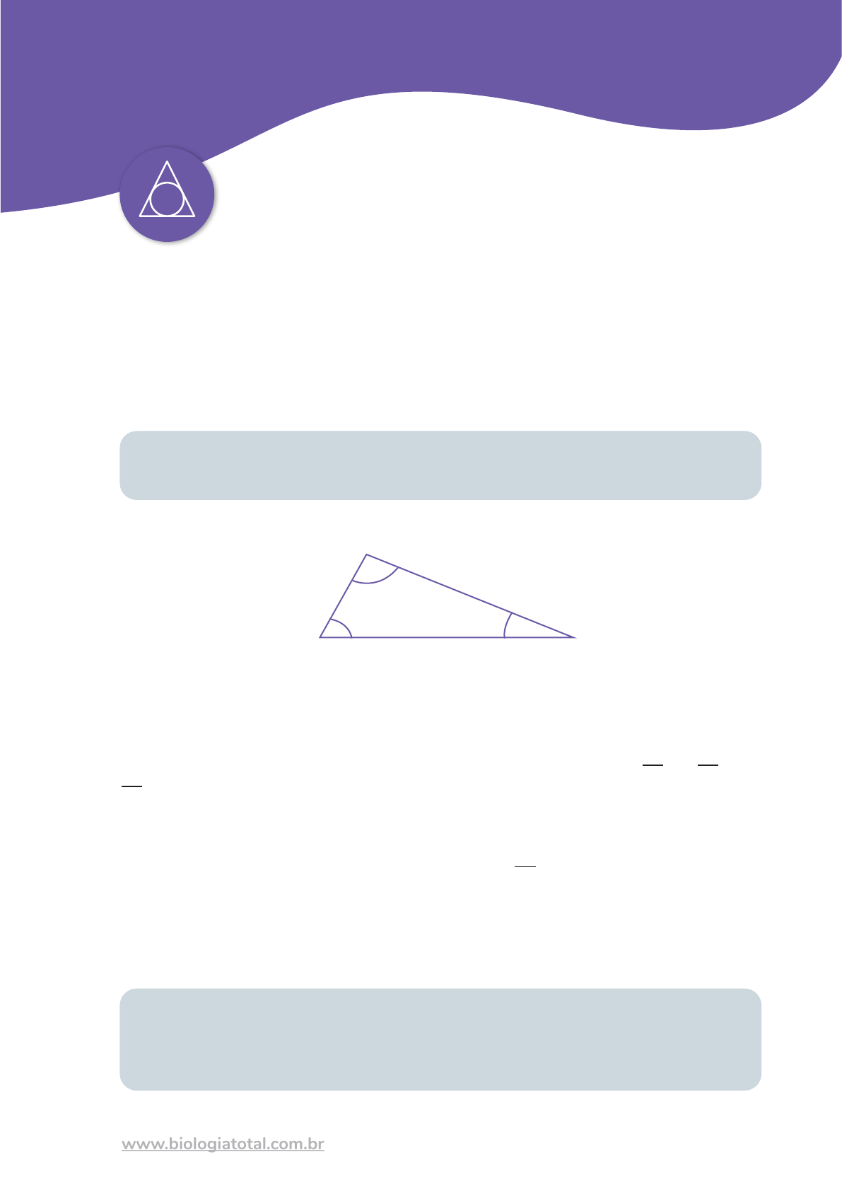 1www.biologiatotal.com.br TRIÂNGULOS Chegamos a um dos tópicos mais falados em todos os materiais de geometria plana, os triângulos. Mas você sabe o que é um triângulo? Provavelmente dirá algo como “é um objeto que tem três lados”. Não deixa de ser uma aproximação coerente, mas veremos como se define formalmente um triângulo, para que não haja dúvidas do que estamos falando daqui pra frente. Antes disso, a noção de pontos colineares vai ser importante. Pontos colineares são pontos que pertencem a uma mesma reta. Agora, podemos falar do triângulo: Um triângulo é uma figura formada por três pontos não colineares e três segmentos de retas que têm em suas extremidades dois desses pontos. Para nos referirmos ao triângulo da figura utilizamos a notação 𝛥𝐴𝐵𝐶, ou 𝛥𝐵𝐴𝐶, ou 𝛥𝐵𝐶𝐴 , etc. A ordem das letras não importa quando tratamos do mesmo triângulo. Os pontos A, B e C são os vértices do triângulo, os segmentos de reta 𝐴𝐵 = 𝑐, 𝐴𝐶 = 𝑏 e 𝐵𝐶 = 𝑎 são os lados do triângulo e 𝛼, 𝛽 e 𝛾 são os ângulos internos do triângulo. É importante mencionar que o maior lado do triângulo sempre será oposto ao maior ângulo. Na nossa figura de exemplo, supondo que o vértice A seja o vértice que contém o maior ângulo, então o maior lado está oposto a ele (𝐵𝐶). Os lados do triângulo possuem medidas diferentes, então poderíamos pensar: quaisquer três valores de comprimento são capazes de formar um triângulo? A resposta para esta pergunta é não. Para que um triângulo seja formado, os valores dos seus lados precisam obedecer à uma condição de existência: |𝑎−𝑐| < 𝑏 < 𝑎 +𝑐 𝛼 𝛾 𝛽 A B C a c b 2 Tr iâ ng ul os Em outras palavras, para um triângulo existir, o comprimento de um lado qualquer precisa ser maior que a diferença do comprimento dos outros dois lados em módulo e menor que a soma do comprimento desses mesmos dois lados. Os triângulos possuem uma propriedade fundamental em relação aos seus ângulos: a soma dos ângulos internos de qualquer triângulo vale 180°. Veja a representação desta propriedade, conhecida como relação angular de Tales: α γβ β γ Estamos combinados então que os ângulos internos do triângulo estão resolvidos. Mas e os ângulos externos? Eles existem? Sim! Mas então, o que é um ângulo externo de um triângulo? O ângulo externo de um triângulo é o suplemento do ângulo interno adjacente a ele. Observe a imagem abaixo: α γβ ê Temos que ê é um ângulo externo do triângulo e sua medida é: ê = 180° − 𝛾. Assim, todo triângulo possui 3 ângulos externos, bem como possui 3 ângulos internos. Mas então, podemos obter mais informações a respeito do ângulo externo? Sim! Na figura acima, temos o seguinte par de informações: Esse par de informações nos conduz a: ê = α + β. Essa relação é lida como: a medida de um ângulo externo de um triângulo é igual à soma das medidas dos ângulos internos não adjacentes a ele. α+ β + γ = 180° 3www.biologiatotal.com.br Tr iâ ng ul osAgora que já vimos as ideias iniciais, vamos classificar os triângulos! CLASSIFICAÇÃO DOS TRIÂNGULOS A primeira classificação dos triângulos que temos é quanto aos seus lados, mas o que isso quer dizer? Isso quer dizer o seguinte: quando o triângulo possui três lados com diferentes medidas cada um, dizemos que ele é um triângulo escaleno. Quando o triângulo possui pelo menos dois lados de mesma medida, chamamos de triângulo isósceles. Finalmente, quando o triângulo possui os três lados com a mesma medida, chamamos de triângulo equilátero. Em desenhos de triângulos, representamos lados que têm a mesma medida com o mesmo número de “risquinhos” e lados que têm medidas diferentes com diferentes números de “risquinhos”. Observe essa classificação na imagem abaixo. Escaleno Isósceles Equilátero Aqui valem umas observações: f Todo triângulo equilátero também é isósceles! f Se os triângulos possuem lados com medidas iguais, seus ângulos opostos internos também terão medidas iguais. Sendo assim, o triângulo escaleno possui 3 ângulos com medidas diferentes, o triângulo isósceles possui 2 ângulos com medidas iguais e o triângulo equilátero possui 3 ângulos com medidas iguais (nesse caso, iguais a 60°). A segunda classificação dos triângulos é e em relação aos seus ângulos internos. Quando todos os ângulos internos do triângulo forem menores que 90°, temos um triângulo acutângulo. Por outro lado, se temos um ângulo interno igual a 90°, chamamos o triângulo de triângulo retângulo. Por fim, caso tenhamos um ângulo interno maior que 90°, este será um triângulo obtusângulo. Acutângulo Retângulo Obtusângulo 60º 60º 60º 4 Tr iâ ng ul os Quando falamos especificamente de triângulos retângulos, nomeamos os seus lados conforme a figura abaixo. O maior lado (ou seja, o lado oposto ao ângulo reto) é chamado de hipotenusa. Se definirmos um ângulo de referência dentro do triângulo (representado por α abaixo), então o lado oposto a esse ângulo é chamado de cateto oposto. Por último, o lado que sobra é o cateto adjacente (pois está “encostado” no ângulo de referência). Continuando a falar sobre a classificação dos triângulos, consideremos agora o triângulo abaixo, onde a é o seu maior lado. f Se ocorrer a desigualdade a2<b2+c2, então o triângulo será acutângulo; f Se ocorrer a desigualdade a2>b2+c2, então o triângulo será obtusângulo e f Se ocorrer a igualdade a2=b2+c2, então o triângulo será retângulo. Perceba então que é possível classificar um triângulo quanto aos seus ângulos sabendo apenas as medidas dos seus lados. A igualdade anterior é conhecida como teorema de Pitágoras: em um triângulo retângulo, o quadrado da hipotenusa é igual à soma dos quadrados dos catetos. Este teorema, além da equação conhecida, 