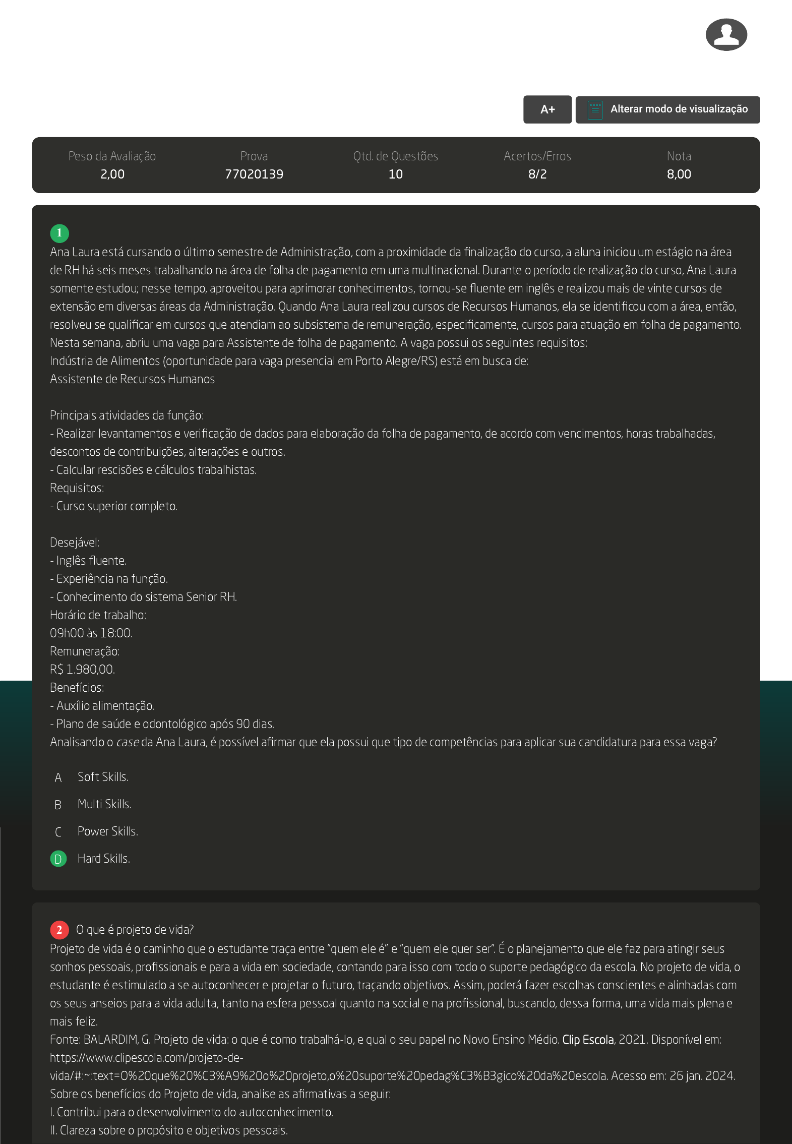 09/03/2024, 09:38 AVA https://ava2.uniasselvi.com.br/subject/grades-and-tests/answer-book/eyJ0ZXN0Ijp7InRlc3RDb2RlIjoiOTU5NTMzIiwiZGVzY3JpcHRpb24iOiJBdmFsaWHDp8OjbyBJSSAtIEluZGl2aWR1YWwiLCJwYXJhbWV0ZXIiOjE… 1/4 GABARITO | Avaliação II - Individual (Cod.:959533) Peso da Avaliação 2,00 Prova 77020139 Qtd. de Questões 10 Acertos/Erros 8/2 Nota 8,00 Ana Laura está cursando o último semestre de Administração, com a proximidade da finalização do curso, a aluna iniciou um estágio na área de RH há seis meses trabalhando na área de folha de pagamento em uma multinacional. Durante o período de realização do curso, Ana Laura somente estudou; nesse tempo, aproveitou para aprimorar conhecimentos, tornou-se fluente em inglês e realizou mais de vinte cursos de extensão em diversas áreas da Administração. Quando Ana Laura realizou cursos de Recursos Humanos, ela se identificou com a área, então, resolveu se qualificar em cursos que atendiam ao subsistema de remuneração, especificamente, cursos para atuação em folha de pagamento. Nesta semana, abriu uma vaga para Assistente de folha de pagamento. A vaga possui os seguintes requisitos: Indústria de Alimentos (oportunidade para vaga presencial em Porto Alegre/RS) está em busca de: Assistente de Recursos Humanos Principais atividades da função: - Realizar levantamentos e verificação de dados para elaboração da folha de pagamento, de acordo com vencimentos, horas trabalhadas, descontos de contribuições, alterações e outros. - Calcular rescisões e cálculos trabalhistas. Requisitos: - Curso superior completo. Desejável: - Inglês fluente. - Experiência na função. - Conhecimento do sistema Senior RH. Horário de trabalho: 09h00 às 18:00. Remuneração: R$ 1.980,00. Benefícios: - Auxílio alimentação. - Plano de saúde e odontológico após 90 dias. Analisando o case da Ana Laura, é possível afirmar que ela possui que tipo de competências para aplicar sua candidatura para essa vaga? A Soft Skills. B Multi Skills. C Power Skills. D Hard Skills. O que é projeto de vida? Projeto de vida é o caminho que o estudante traça entre “quem ele é” e “quem ele quer ser”. É o planejamento que ele faz para atingir seus sonhos pessoais, profissionais e para a vida em sociedade, contando para isso com todo o suporte pedagógico da escola. No projeto de vida, o estudante é estimulado a se autoconhecer e projetar o futuro, traçando objetivos. Assim, poderá fazer escolhas conscientes e alinhadas com os seus anseios para a vida adulta, tanto na esfera pessoal quanto na social e na profissional, buscando, dessa forma, uma vida mais plena e mais feliz. Fonte: BALARDIM, G. Projeto de vida: o que é como trabalhá-lo, e qual o seu papel no Novo Ensino Médio. Clip Escola, 2021. Disponível em: https://www.clipescola.com/projeto-de- vida/#:~:text=O%20que%20%C3%A9%20o%20projeto,o%20suporte%20pedag%C3%B3gico%20da%20escola. Acesso em: 26 jan. 2024. Sobre os benefícios do Projeto de vida, analise as afirmativas a seguir: I. Contribui para o desenvolvimento do autoconhecimento. II. Clareza sobre o propósito e objetivos pessoais. VOLTAR A+ Alterar modo de visualização 1 2 Ingrid Vitória Machado Klemmtz Terapias Integrativas e Complementares (6768247) 09/03/2024, 09:38 AVA https://ava2.uniasselvi.com.br/subject/grades-and-tests/answer-book/eyJ0ZXN0Ijp7InRlc3RDb2RlIjoiOTU5NTMzIiwiZGVzY3JpcHRpb24iOiJBdmFsaWHDp8OjbyBJSSAtIEluZGl2aWR1YWwiLCJwYXJhbWV0ZXIiOjE… 2/4 III. Ficar livre de “pagar o preço” da dedicação. É correto o que se afirma em: A I e III, apenas. B II e III, apenas. C I e II, apenas. D I, II e III. O ultra-aprendizado (ultralearning) é “[...] uma estratégia de aquisição de habilidades e conhecimento que é tanto autodirigida quanto intensiva”. O autor sugere uma metodologia que segue um percurso de nove princípios para apropriação do aprendizado. Fonte: YOUNG, S. H. Ultra-aprendizado: domine habilidades valiosas, seja mais esperto que a competição e dê um impulso em sua carreira. Rio de Janeiro: Harper Collins, 2020. p. 39. Considerando o exposto, analise as afirmativas a seguir: I. No princípio do metalearning, deve-se definir o porquê, o que e como vamos aprender novas habilidades mais facilmente. II. O princípio da retenção dá a entender o que você esquece e por que é preciso aprender, lembrando do que você aprendeu de forma consistente. III. No princípio da diretividade, deve-se levar em conta a capacidade de concentração, para isso é importante definir uma gestão do tempo para atender às demandas. É correto o que se afirma em: A II e III, apenas. B I, II e III. C III, apenas. D I e II, apenas. A indústria 4.0 traz uma nova relação homem-máquina, ou seja, as máquinas podem executar tarefas que antes eram realizadas pelos empregados de forma manual através de observação e anotações em planilhas, algumas vezes, colocando em risco a própria segurança do trabalhador. Assim, processos de predição e correção de máquinas passam a ter dados em tempo real e decisões autônomas das próprias máquinas na correção de problemas. Fonte: adaptado de: MANYIKA, J. et al. Jobs lost, jobs gained: workforce transitions in a time of automation. McKinsey Global Institute, 2017. Disponível em: http://hdl.voced.edu.au/10707/444873. Acesso em: 24 jan. 2024. Sobre as características da indústria 4.0, assinale a alternativa correta: A As máquinas estão programadas para tirar os empregos dos trabalhadores por não errarem na execução das tarefas. B O advento das máquinas já programadas torna as indústrias engessadas nos seus processos de trabalho. C A automação das máquinas dá a possibilidade de se criarem novos empregos, por isso não há o risco das pessoas perderem seus empregos. D O uso das máquinas traz tranquilidade para a indústria, pois não precisa investir em qualificação dos trabalhadores. A aquisição de competências para o trabalho é uma pr