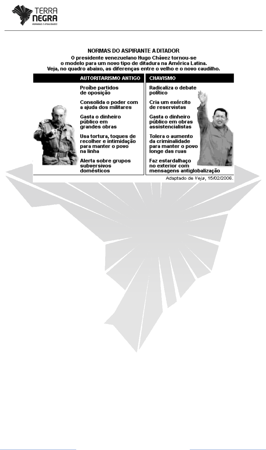 Página 1 www.terranegra.online 01. (Uerj 2007) A partir da classificação anterior proposta, os aspectos que marcariam o estilo dos novos caudilhos na América Latina são: a) liberalismo e tolerância da violência urbana b) capitalismo e ênfase na gestão eficiente da economia c) nacionalismo e redução de investimentos em obras públicas d) neopopulismo e não-alinhamento à internacionalização econômica 02. (Uepb 2014) As profundas desigualdades sociais vivenciadas pela América Latina impulsionaram os novos rumos políticos abraçados pela região. Emergiu deste contexto de desigualdades e insatisfações a ascensão dos partidos de esquerda em vários países. A região registra taxas de crescimento econômico, mas diminuir as desigualdades sociais ainda é o maior desafio para governos que, embora eleitos democraticamente, seguem tendências diferentes. Tais tendências políticas são agrupadas nas seguintes denominações: I. Bloco conservador, nos quais se alinham o México, a Colômbia e o Chile, aliados dos Estados Unidos e defensores do livre comércio. II. Bloco bolivariano, do qual participam a Bolívia e o Equador, liderados pela Venezuela, são nacionalistas, contrários ao neoliberalismo e opositores dos Estados Unidos. III. Bloco moderado, formado pelo Brasil, Argentina. Uruguai e Peru, desenvolve políticas de combate à pobreza e de inclusão social. IV. Bloco Comunista, do qual fazem parte Cuba, Nicarágua e Coreia do Sul, países que fizeram revoluções proletárias subsidiadas pela União Soviética. Estão corretas apenas as proposições a) I, II e III b) II, III e lV c) l e lV d) II e lV Página 2 www.terranegra.online e) l e lI 03. (Uece 2017) A Venezuela tem atravessado uma grave crise. O atual presidente Nicolas Maduro, eleito no ano de 2013, não tem conseguido superar os problemas estruturais do país oriundos de uma série de fatores tais como a baixa nos preços dos barris de petróleo e a corrupção. Escreva V ou F conforme seja verdadeiro ou falso o que se afirma a seguir sobre esse tema. ( ) Nicolas Maduro era vice-presidente e herdeiro político de Hugo Chaves que faleceu em 2013. ( ) O chavismo perdeu as eleições parlamentares em dezembro de 2016, o que iniciou seu revés institucional. ( ) O governo venezuelano, para controlar a crise, propõe antecipação das eleições marcadas para o final do ano de 2018. ( ) Em 2016 o Vaticano promoveu um diálogo com o governo venezuelano para aliviar a crise. A sequência correta, de cima para baixo, é: a) V, V, F, V. b) V, F, V, F. c) F, V, F, V. d) F, F, V, F. Página 3 www.terranegra.online Gabarito: 01. D 02. A A proposição [IV] está incorreta, visto que não existe um “Bloco Comunista”, países como Cuba e Nicarágua apresentam governos de esquerda mais radical e estão no “Bloco Bolivariano” (ALBA – Alternativa Bolivariana para as Américas). A Coreia do Sul é um país capitalista, um dos Tigres Asiáticos e com IDH muito elevado, praticamente um país desenvolvido. A Coreia do Norte é que apresenta um governo socialista com teor autoritário. 03. A A terceira afirmativa é falsa porque não existe uma proposta de antecipação eleitoral. Na Venezuela, nesse momento, uma Assembleia Nacional Constituinte foi eleita à reveria do Congresso e o Superior Tribunal de Justiça assumiu o controle do Congresso, fatos que levam a oposição a perder força no país.