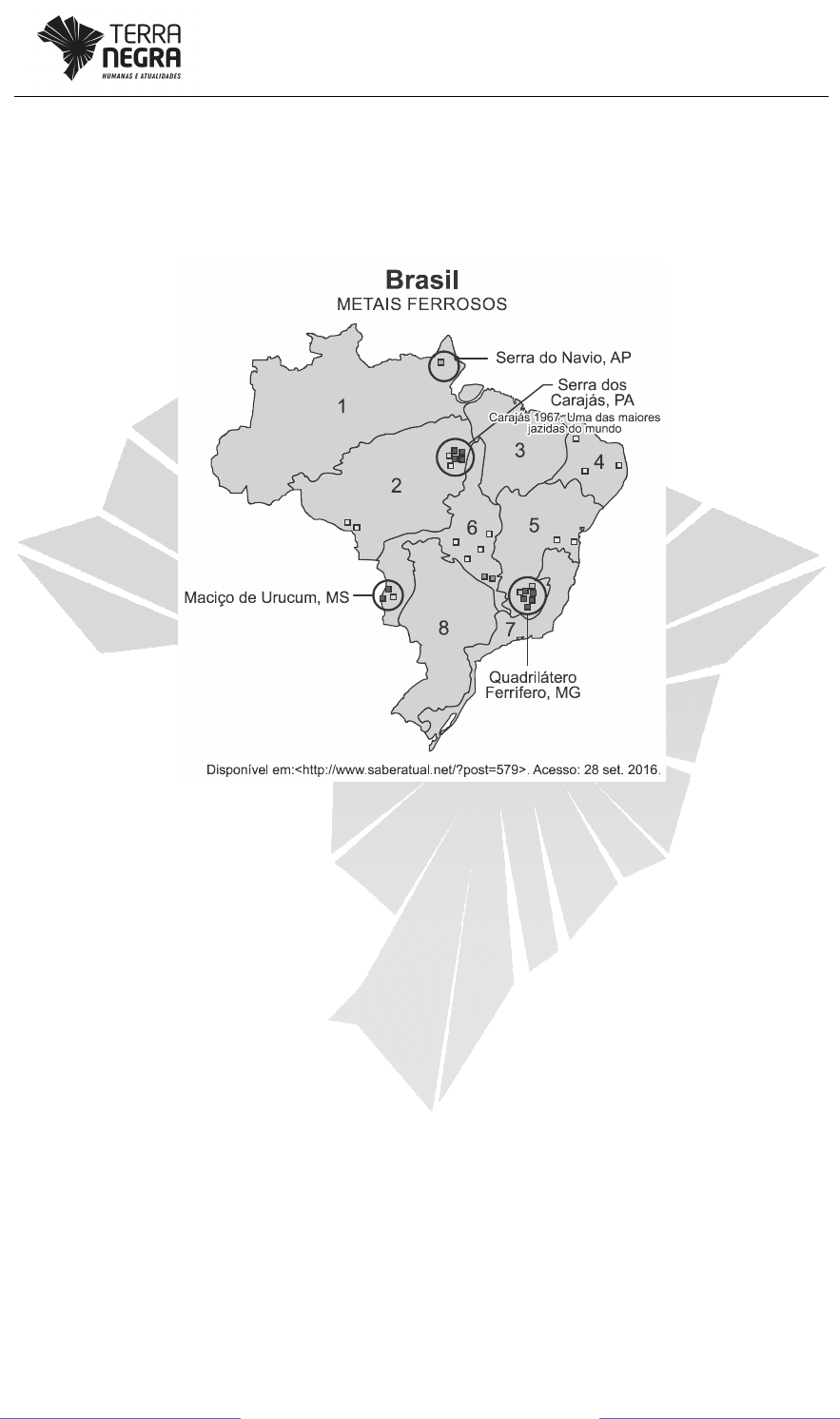 Página 1 www.terranegra.online 01. (G1 - ifpe 2017) O Brasil é um dos maiores produtores e exportadores de recursos minerais, e entre seus principais produtos estão o minério de ferro, o manganês e a bauxita, que são matérias-primas essenciais para vários ramos do setor industrial. Sabe-se que essa riqueza em reservas de minerais metálicos está diretamente atrelada a sua estrutura geológica. Diante do exposto e observando a imagem abaixo, podemos afirmar quanto aos recursos minerais brasileiros que a) na Serra dos Carajás, encontra-se uma das maiores reservas de minerais metálicos do mundo, responsável pela maior produção do país, o que contribui para o equilíbrio da balança comercial brasileira. b) o principal centro de exploração mineral está no Quadrilátero Ferrífero no Estado de Minas Gerais, e, entre os principais recursos extraídos, estão: minério de ferro, bauxita e carvão mineral. c) as principais atividades de exploração dos minerais metálicos, circuladas na imagem acima, concentram-se nas áreas das bacias sedimentares, que são geologicamente mais antigas. d) a maior produção de bauxita, mineral de onde é extraído o alumínio, está no Maciço do Urucum – MS, local conhecido pela elevada qualidade de seu minério, que é exportado principalmente para Europa e Japão. e) as principais jazidas de minerais metálicos são encontradas na Serra do Carajás e no Quadrilátero Ferrífero nas áreas formadas geologicamente por escudos cristalinos. 02. (Ufu 2015) No Brasil encontramos grandes depósitos importantes de minérios. Parte destes minerais encontrados são metálicos e estão presente em 4% do Página 2 www.terranegra.online território brasileiro. O que poucos sabem é que os minerais metálicos não são renováveis, ou seja, a natureza não repõe. Disponível em: <http://www.citra.com.br/minerais-metalicos-no-brasil/> Acesso em: 14 de fev. 2015 A ocorrência, no território brasileiro, do recurso natural apresentado está relacionada a) à antiguidade de sua estrutura geológica associada a afloramentos cristalinos. b) à formação de bacias sedimentares acompanhada de processos erosivos. c) à geração de dobramentos modernos seguida de intemperismo físico. d) aos processos tectônicos da era cenozoica coligada a formação de rochas metamórficas. 03. (Uesc 2011) Todos os continentes têm um núcleo de crosta continental estável, total ou amplamente formado por rochas pré-cambrianas com estruturas complexas, normalmente gnássicas e xistosas, e injetadas por batólitos graníticos. ADAS, M. Panorama geográfico do Brasil. São Paulo: Moderna, 2001. Sobre a estrutura geológica descrita, pode-se afirmar: a) Possui importantes jazidas de combustíveis fósseis e de minerais não metálicos. b) Corresponde a grandes curvamentos, resultantes de forças tectônicas orogenéticas antigas. c) Apresenta sedimentação contínua, causada por agentes externos, como a água, o vento e a temperatura. d) Configura-se como planícies fanerozoicas ou assumem feições de depressões interplanálticas. e) Apresenta relevos rebaixados, por sofrer intenso processo erosivo, no decorrer do tempo geológico. Página 3 www.terranegra.online Gabarito: 01. E A alternativa [E] está correta porque a Serra dos Carajás e o Quadrilátero Ferrífero representam as grandes jazidas de minerais metálicos, recursos associados à formação de escudos. As alternativas incorretas são: [A], porque o Quadrilátero Ferrífero é a principal área produtora do país; [B], porque a exploração de bauxita ocorre em Poços de Caldas e no vale do rio Trombetas; [C], porque minérios metálicos se formam em áreas de escudos cristalinos; [D], porque a produção de bauxita ocorre no vale do rio Trombetas no Pará e em Poços de Caldas em Minas Gerais. 02. A As maiores jazidas de minerais metálicos são encontradas em Escudos Cristalinos e Dobramentos Antigos (rochas magmáticas intrusivas e metamórficas) formados no Eon Pré-Cambriano. Os recursos se concentram nas rochas da Era Proterozoica que correspondem a 4% da estrutura geológica brasileira. 03. E O texto refere-se aos Escudos Cristalinos, a estrutura geológica mais antiga (Eon Pré-Cambriano) e integrada principalmente por rochas magmáticas intrusivas (granito) e metamórficas (gnaisse). Devido à idade, estas estruturas foram bastante desgastadas pela erosão dando origem na superfície a depressões e planaltos com média e baixa altitude.