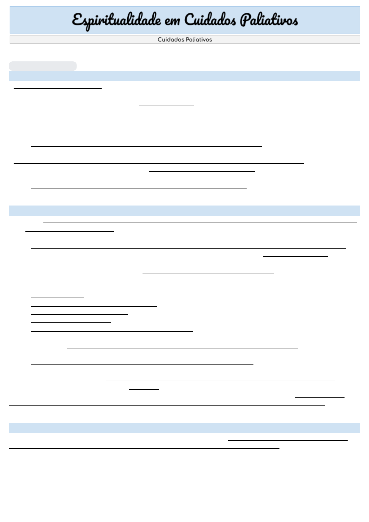 Medicina - 6º Semestre - Ana Paula Cuchera e Eduarda Costa Profº Miguel Teixeira 30 de ago. de 2023 O que é espiritualidade - Religioso → é uma prática. Quando o paciente vai a um local de “culto”. Ex: Igreja, umbanda, celta,etc ● Ou seja, está mais ligada às práticas e rituais ● Chamadas de religiões porque seguem um rito. Algumas famílias tem ritos de serem passados na hora da morte ● Catolicismo → extrema unção como rito de passagem na morte ● Protestante → fazem funeral, templos, coro cantando, há uma grande preparação para enterrar - não pode cremar ● Ser religiosa também não quer dizer que a pessoa é espiritualizada - Espiritualidade → está relacionado com as questões mais subjetivas dos ser humano. ● Busca experiências humanas que compreendem sentido da vida ● Espiritualidade não tem nada a ver com Deus ● Pode se ser uma pessoa espiritualizada sem práticas religiosas Tópicos para discussão - Abordar espiritualidade/religiosidade (E/R) faz parte do MCCP (método clínico centrado na pessoa) e do cuidado integral à pessoa - Coping positivo ou negativo ● Necessidade de processos adaptativos pessoais às diversas mudanças trazidas pela doença, processo conhecido como coping, no qual é possível compreender quais estratégias o indivíduo usa no enfrentamento da doença - Instrumentos: anamneses espiritual, questionário FICA, questionário HOPE - Pacientes, em geral, querem que o assunto seja abordado - Dificuldades do profissional: ● Falta de tempo ● Falta de conhecimento/treinamento ● Medo de ofender o paciente ● Desconforto com tema ● Influências da própria forma de lidar com a E/R OBS! Delirium → estado alterado de consciência, que pode ter uma causa (ex: sepse), essa pode verbalizar que está vendo coisas, ouvindo vozes → sente coisas extrafísicas ● Geralmente esse cenário ocorre quando a pessoa está morrendo → antes de morrer sente algo ● Esse está no campo das ideias - Delírio → Quando a pessoa acredita em algo que não é verdade → acredita com toda a certeza ● Diferente da psicose, é uma ideia fixa - Deliróide → se origina em fenômenos afetivos ou de outras experiências pessoais, não apresenta convicção absoluta e nem certeza subjetiva, pode ser permeável à refutação e à experiência Espiritualidade - Espiritualidade é um elemento complexo e multidimensional, intrínseco da experiência humana, que compreende a busca de cada um por sentido na vida e de transcendência (EVANGELISTA et al., 2016; PUCHALSKI et al., 2020) 1 Religiosidade x Espiritualidade - Coping:medidas de enfrentamento - Enfrentamento ou coping refere-se à união de estratégias cognitivas e comportamentais, utilizadas pelas pessoas como forma de enfrentar as situações de estresse. - Embora o conceito de coping religioso tenha uma conotação positiva, ele pode ser também negativo: ● O coping religioso-espiritual positivo (CREP) congrega medidas que proporcionam efeito benéfico ao indivíduo. Ex: Procurar amor ou proteção em “Deus”, maior conexão com forças transcendentais, conforto na literatura religiosa, abertura para perdoar e ser perdoado, entre outros ● Já o coping religioso-espiritual negativo (CREN), está relacionado a medidas que geram consequências prejudiciais ao indivíduo. Ex: Pensar que ir para o inferno, questionar existência de Deus, delegar a existência de problemas como existência ou punição - Puchalski et al. (2009) → sugerem que a espiritualidade no contexto dos cuidados paliativos deve ser considerada como um sinal vital, ou seja, integrada na rotina de cuidados, abordada como qualquer outra questão médica e inserida no plano de cuidados do paciente - Apesar de poder incluir a busca por uma entidade divina, a espiritualidade diferencia-se da religiosidade na medida em que esta envolve, dentro de uma coletividade, a expressão da espiritualidade através de uma organização, com tradições, rituais, crenças, práticas, normas e celebrações em comum (EVANGELISTA et al., 2016; STEINHAUSER et al., 2017; PUCHALSKI et al., 2020) 2 Anamnese ou História Espiritual - Perguntas para convidar os pacientes a compartilhar suas crenças e práticas religiosas ou espirituais, especialmente em sua relação com a saúde. - conversar com os pacientes sobre as crenças, práticas religiosas, espirituais. - A prática religiosa pode estar relacionada com a saúde do paciente como um todo (palavra de conforto ou até mesmomedidas de saúde. Ex: caminhar) - Quando o paciente fala que faz bem omédico tem função de fazer o coping positivo (reforçar que o paciente deve continuar) Escalas de Avaliação OBS! Avalia através de uma escala o nível de religiosidade e espiritualidade 3 OBS!Mais direcionado Angústia Espiritual - Angústia espiritual → falta de fé, crença que atrapalha, etc. ● Ex: Quando a pessoa vai morrer e fica se questionando: “ e se tudo que eu acredito não for verdade?” e fica angustiado - O médico tenta conversar ou acessar o líder espiritual dele que terá mais experiência para confortar 4 Qualidade de vida e de morte OBS! O Brasil ocupa um dos piores rankings de qualidade de morte - Não tem acesso a analgésicos (morre com dor), morrer no corredor por lotação, etc. → isso corrobora para esses índices horríveis do Brasil ● O Reino Unido apresenta a melhor qualidade de morte de todo o ranking. ● Países ricos tendem a ocupar melhores posições no ranking - em segundo lugar está a Austrália, seguida por Nova Zelândia. ● Nos últimos dois lugares estavam Bangladesh e Iraque; ● Países commelhor qualidade de morte compartilham características, como uma política nacional de cuidados paliativos, altos gastos públicos em serviços de saúde, treinamento extensivo para os profissionais envolvidos, grande oferta de opioides e forte consciência pública sobre cuidados paliativos; ● Políticas nacionais são vitais para 