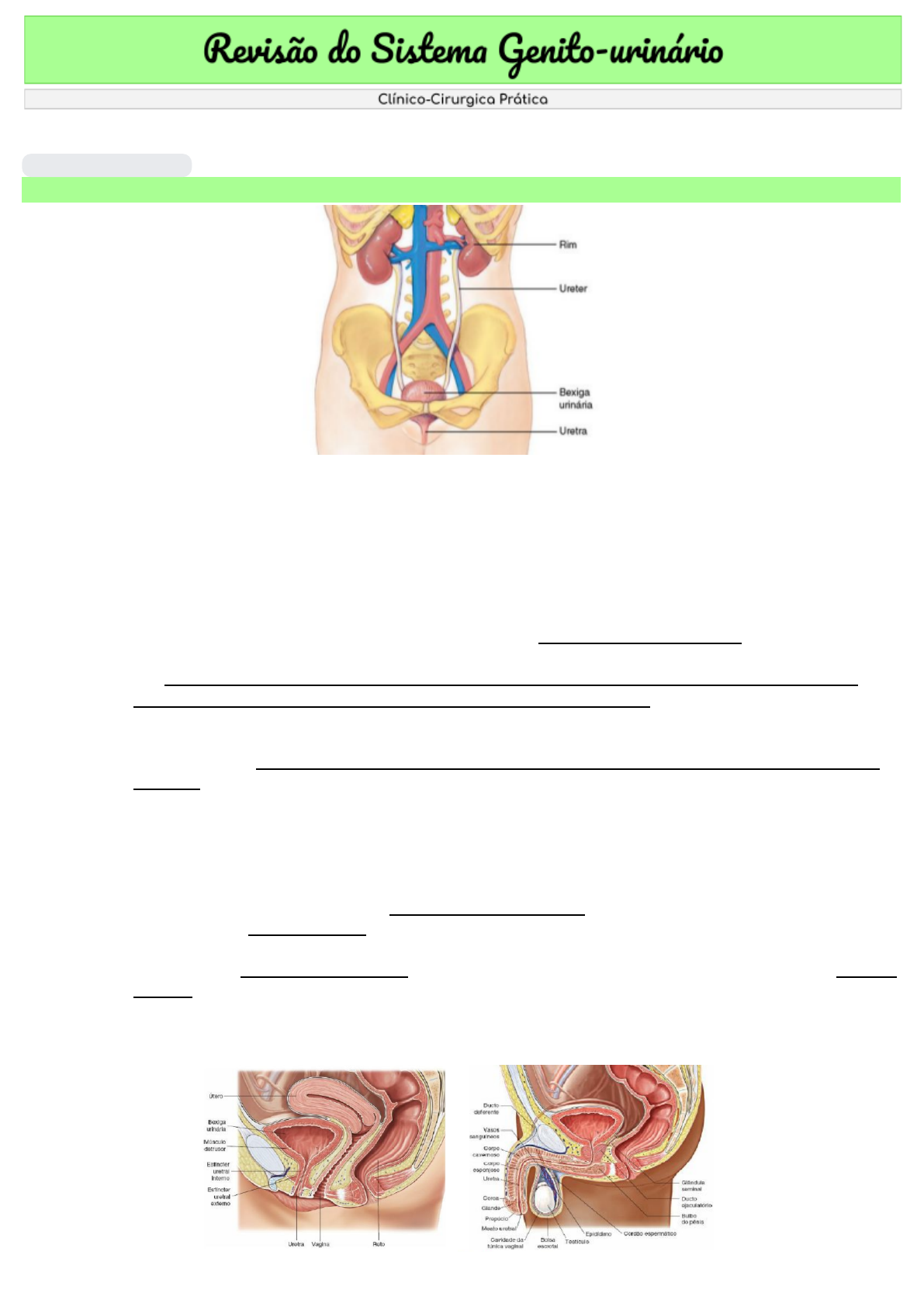 Medicina - 6º Semestre - Ana Paula Cuchera e Eduarda Costa Profº Fabrício Lopes 28 de ago. de 2023 Componentes do Sistema urinário - O sistema urinário consiste dos: ● Rins ○ Os rins produzem a urina e respondem pelas outras funções atribuídas ao sistema urinário ○ O rim direito, em geral, está ligeiramente abaixo do esquerdo por causa do fígado, que o desloca para baixo ● Ureteres ○ Os ureteres conduzem a urina dos rins para a bexiga urinária ○ Cada ureter é um pequeno tubo com cerca de 25 cm de comprimento, que conduz a urina da pelve renal para a bexiga urinária. ○ Ele desce da pelve renal, ao longo da parede abdominal posterior, atrás do peritônio parietal, e entra na bexiga urinária pela face póstero-inferior ● Bexiga urinária ○ Bexiga urinária é um reservatório temporário para a urina ○ Localizada na cavidade pélvica, posteriormente à sínfise púbica e debaixo do peritônio parietal ○ Seu tamanho e a forma variam com a quantidade de urina que ela contém e com a pressão dos órgãos vizinhos ● Uretra ○ A uretra é uma estrutura que conduz a urina da bexiga urinária para o exterior ○ Tubo de paredes finas que conduz a urina do assoalho da bexiga urinária para o exterior ○ A abertura para o exterior é o óstio externo da uretra ○ Mulheres → a uretra é curta, 3 a 4 cm de comprimento - o óstio externo abre-se para o exterior um pouco à frente do óstio da vagina ○ Homens → a uretra é mais longa, cerca de 20 cm de comprimento, transportando urina e sêmen. ■ Parte prostática: próxima da bexiga urinária, atravessa a próstata ■ Parte membranácea: penetra no assoalho da pelve, e entra no pênis ■ Parte esponjosa (mais longa): ocupa toda a extensão do pênis 1 Semiologia - Sinais e sintomas: - Dor → pode ser: ● Dor Renal X Cólica ureteral → se ingere água durante a cólica renal vai doer, pois o rim distende ● Dor hipogástrica ou dor vesical → originária do corpo da bexiga, ela é percebida na região supra púbica, irradiando-se para a uretra e meato urinário, podendo dar a sensação de queimação ● Dor Perineal → infecção aguda de próstata ou trauma que leva a dor intensa, sendo referida no sacro ou no reto ○ Geralmente ocorre por prostatite aguda ou crônica ● Disúria → dor no ato miccional, podendo ser no início, final ou durante toda a urina ○ Dor no início → costuma ser mais frequente, pois é o primeiro contato da urina (que é ácida) com a mucosa - sugerindo doenças uretrais ○ Dor no final → mais frequente em doenças vesicais ○ Associada a uretrite, cistite ○ Dor ou queimação ao urinar ● Litíase → pedra no rim ● Cistite → disúria (dor), urgência miccional e polaciúria ● Prostatite → mais em jovens ○ Geralmente dá uma secreção matutina, ardência leve e dor perineal ○ Normalmente esse paciente teve uretrite ● Uretrite → disúria e secreção uretral ○ Pode ser gonocócica ou não gonocócica ● Traumatismo geniturinário → queda a cavaleiro, bate o períneo (entre anus e escroto) ● Irritantes uretrais → sabonete que cai as vezes ● Reação alérgica → quando não sabe a causa, chuta isso ● Lombalgia → sensação profunda e pesada de intensidade variável - Hematúria = sangue na urina - ocorre no início, pois conforme a urina sai, essa empurra o sangue ● Sua principal causa é litíase urinária ● Dificilmente há por infecção urinária ● Hematúria na litíase diferencia os quadros pela quantidade de sangue ● Essa análise tem que ser mais aprofundada, vendo solutos na urina, composição ácido úrico, oxalato de cálcio, estruvita e fosfato de cálcio ● Medicação → que diminua a pH da urina ou que diminua a excreção urinária de cálcio (tiazídico). Mas sempre analisar a composição do cálculo ● 3 estreitamentos no ureter: ○ 1- JUP → junção ureteropélvica ○ 3- JUV → junção ureterovesical ■ Lugar mais estreito, pois o ureter entra na bexiga de forma oblíqua → quando faz xixi a bexiga aperta a JUV para que a urina não suba. ○ 2- Constrição ilíaca 2 - Esforço miccional (necessidade de impor um aumento à pressão abdominal (Valsalva) para iniciar e/ou manter o jato urinário) - Jato fraco (jato urinário com pressão diminuída - mais afilado e com alcance menor) - Sensação de esvaziamento incompleto/tenesmo vesical (percepção de bexiga ainda repleta ou com conteúdo urinário adicional ao término da micção) - Gotejamento pós-miccional (presença de saída de conteúdo urinário em gotas ao término do fluxo miccional) - Jato em spray ou duplo (saída do jato urinário de forma espalhada ou dividido em dois fluxos de direção distintas) - Retenção urinária (incapacidade absoluta de promover a micção) ● Incapacidade de esvaziar a bexiga, apesar dos rins estarem produzindo urina normalmente ○ Aguda: Dificuldade de esvaziar a bexiga de forma abrupta, sentindo a bexiga distendida e dolorosa. Pode ser por: ■ Obstrução de cálculo de uretra (geralmente quando em homens se aloja na uretra prostática) ■ Trauma ■ Falência no músculo detrusor → depois de anestesia (necessário passar uma sonda de alívio) ○ Crônica: Ocorre dilatação lenta e progressiva, a dor pode estar ausente, queixa de hesitação, gotejamento e não consciência da distensão vesical ■ A retenção é tão grande que dá gotejamento pela pressão está alta (bexigoma/globo vesical), geralmente tem uma bexiga neurogênica flácida ■ Pode ser por: hiperplasia prostática e diabetes mellitus de difícil compensação e longa duração - Poliúria (> 40 ml/Kg ou >2,8 Litros emmaiores de 70 Kg) - Polaciúria (vontade de urinar commuita frequência, em pequenas quantidades) - comum na cistite. - Urgência miccional: Necessidade súbita e imperiosa de urinar, podendo até haver o esvaziamento involuntário da bexiga ● Causas: uretrite, cistite, prostatite (inflamaç