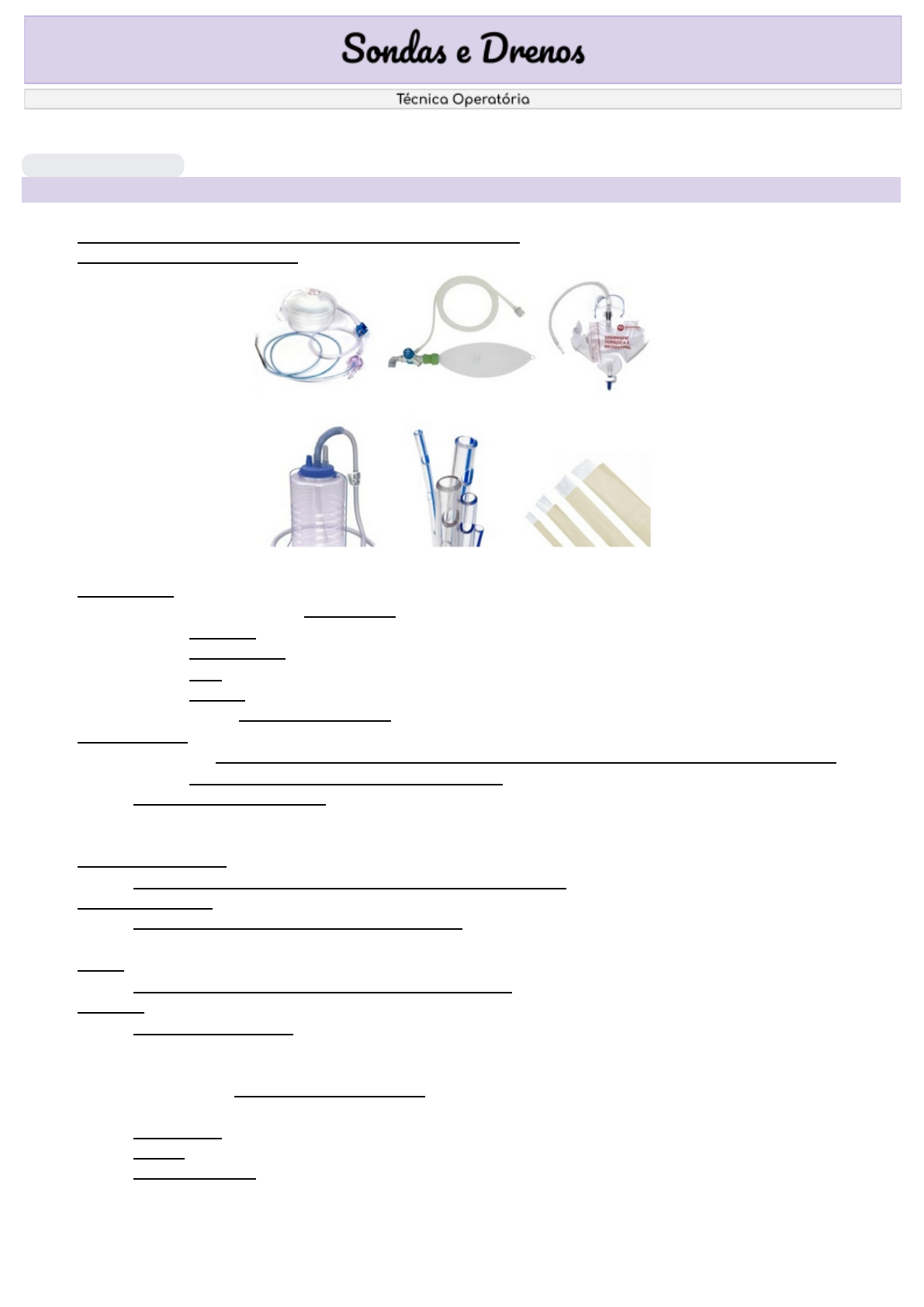 Medicina - 6º Semestre - Ana Paula Cuchera e Eduarda Costa Profª Luis 31 de out. de 2023 Drenos - Definição: ● Tubos manufaturados para drenar fluidos corporais ● Látex, polietileno, silicone - Indicações: ● Profiláticas ○ Remover de forma preventiva: ■ Sangue ■ Serosidade ■ Bile ■ Líquor ○ Estabelecer fístula controlada ● Terapêuticas ○ Remover secreções de cavidades naturais ou resultante de processos patológicos ■ Pus, sangue, exsudato, linfocele, bile ○ Ar da cavidade pleural - Classificação: ● Sistema fechado ○ Conteúdo não é exposto ao ambiente atmosférico ● Sistema aberto ○ Comunica-se com o meio atmosférico ● Ativo ○ Conteúdo direcionado por pressão negativa (aspiração contínua) ● Passivo ○ Canaliza os fluídos - Sistema de drenagem ativa fechada (vácuo): ● Drenos: ○ Porto-Vac ○ Blake ○ Jackson Pratt ● Dreno torácico ● Terapia de feridas complexas por pressão negativa 1 - Sistema passivo fechado: ● Drenos: ○ Pigtail ○ Kehr ○ Waterman ○ Mallecot e Pezzer ● Dreno torácico Sistemas de drenagem fechada - Sistema de drenagem ativa fechada (vácuo) 1. Porto-Vac ○ Polietileno ○ O dreno de sucção (Portovac) é utilizado para drenagem de líquido seroso ou sanguinolento, de locais de dissecção ou da área de anastomoses intraperitoneais ○ Objetivos: ■ Garantir a manipulação correta do dispositivo a fim de prevenir a ocorrência de infecções relacionadas ao procedimento 2. Jackson-Pratt ○ Flexível, silicone ○ Extremidade achatada commúltiplas perfurações (túbulo laminar) ○ Cavidade abdominal ○ O dreno Jackson Pratt é um dispositivo siliconado, em formato de pera, que funciona com pressão negativa ○ Ele realizar uma drenagem no local da cirurgia para retirar fluidos e evitar a formação de coágulos e abcessos 3. Blake ○ Silicone, flexível ○ Túbulo laminar, cilíndrico, vazado ○ Cirurgia plástica ○ O Dreno de Blake Medicone é indicado para drenagem corporal no período pós-operatório onde fluidos tendem a se acumular e aumentar o risco de infecção 2 - Sistema de drenagem passiva fechada 1. “Pigtail” – inserção percutânea ○ Radiologia intervencionista, pneumotórax ○ Limitação: conteúdo espesso, cavidades septadas ○ Reservatório ○ O pigtail é um tubo fino, com um orifício final e outros orifícios paralelos ○ Sua aplicabilidade clínica principal é a drenagem de tórax 2. Dreno de Kehr ou em “T” ○ Vias biliares, ducto biliar comum ○ Fístula biliar controlada ○ Após retirada a fístula se fecha espontaneamente ○ O dreno de Kehr é um ducto colocado dentro da via biliar e exteriorizado através de um orifício na pele. ○ É usado em cirurgias onde a via biliar é abordada, normalmente após abertura da mesma para exploração, sendo a coledocolitíase (presença de cálculos dentro do ducto colédoco) sua principal indicação. ○ Sua função é orientar a drenagem de bile enquanto ocorre a diminuição do inchaço da via biliar, o que dificulta a passagem da mesma em direção ao duodeno, evitando assim, obstrução à saída da mesma. 3. Dreno de tórax ○ Rígidos, calibrosos, PVC ou silicone ○ Sistema de drenagem sob selo d’água ○ Os drenos são dispositivos que estão acoplados a um reservatório e, normalmente, são inseridos após o paciente realizar uma cirurgia. ○ Esses tubos têm a função principal de remover líquidos e ar da região onde são inseridos. 3 OBS! Selo de água → quando respira evita que o ar volte (respira e não aspira) - Drenagem fechada acoplada a sistema de sucção - vácuo = drenagem fechada ativa ● Dreno de tórax /mediastino / pericárdio 4 Sistema de drenagem aberta 1- Penrose: ● Látex ● Laminar ● Capilaridade ● Condução direta do efluente ● Curativo com gazes ● Volume de drenagem estimado pelo peso das gazes ● Drenagem de leitos cirúrgicos ● Drenagens de abscessos e coleções purulentas OBS! Penrose → faz também drenagem profilática - se tiver hematoma ele drena para fazer descompressão 2- Dreno de Waterman ● Túbulo laminar ● “Vigiar” anastomoses gastrointestinais (fístulas) ● Capilaridade ● Látex ou silicone ● É utilizado para retirar a secreção produzida após a cirurgia OBS!Waterman → usado para fazer vigília de formação fístula 3- Dreno ondulado/corrugado ● Placa de látex ou silicone ● Sistemas de “canaletas” Drenos - Fixação ● Sutura com fio inabsorvível – nylon 5 ● Alfinete de segurança ● Exteriorização por contra-abertura - Complicações ● Inflamação ● Infecção ● Fragmentação na retirada ● Erosão de estruturas contíguas ● Deslocamento/saída inadvertida ● Sangramento OBS! Imagem → o dreno se moveu, saiu e com isso, está com um dos buraquinhos para fora (pessoa se movimentou e saiu do lugar) - A solução para isso é refazer - Critérios para retirada ● Redução do volume drenado ● Aspecto do líquido ● Mobilização progressiva até a saída completa (passivos) OBS! Penrose → vai tirando aos poucos Sistema de drenagem de feridas cirúrgicas complexas - Vácuo 6 OBS! Drenos vácuo, diminui o tempo de fechamento das feridas Sondas 1- Nasogástrica (Levine) ● Drenagem do conteúdo gástrico OBS!Medir a sonda do nariz até a orelha e depois ao processo xifóide - Saber se está no estômago, pega uma seringa e colocar ar → se fizer barulho está certo 2- Sonda nasoenteral (DOBBHOFF) ● Sonda de alimentação de poliuretano com peso no ponta, original projetado para a alimentação nasogástrica e nasoduodenal ● A ponta grande e em bolus facilita a passagem e ajuda a manter o posicionamento OBS! Somente para alimentação, tem parte metálica e essa chega até o duodeno (pede raio X depois) - Só pode dar dieta depois do raio X 7 3- Sonda de gastrostomia: ● As sondas de gastrostomia são inseridas no estômago pelo abdome para alimentaç