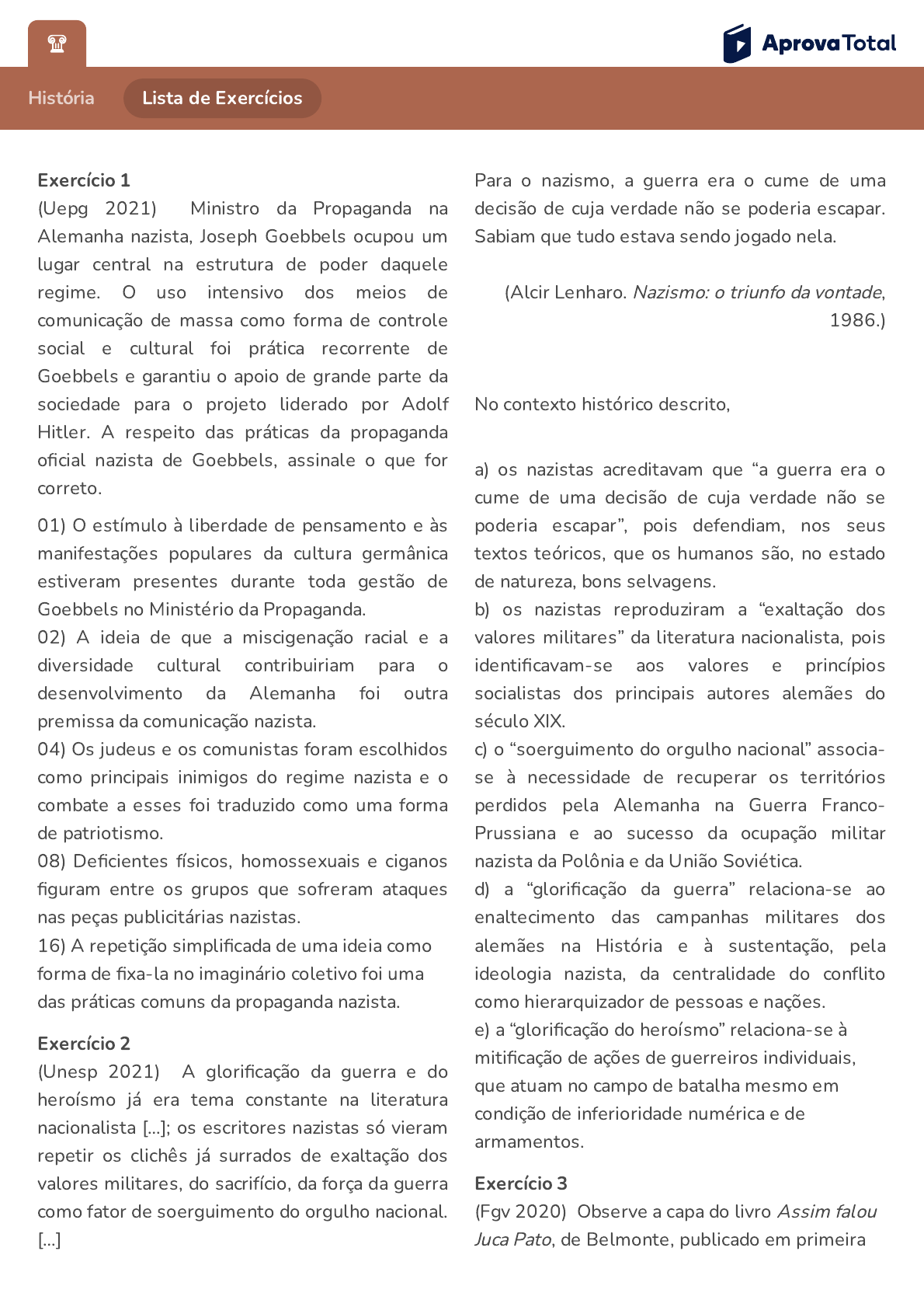 https://aprovatotal.com.br/medio/historia/exercicios/seculo-xx/ex.5-os-eua-(1945-1980) 1/46 História Lista de Exercícios Exercício 1 (Uepg 2021) Ministro da Propaganda na Alemanha nazista, Joseph Goebbels ocupou um lugar central na estrutura de poder daquele regime. O uso intensivo dos meios de comunicação de massa como forma de controle social e cultural foi prática recorrente de Goebbels e garantiu o apoio de grande parte da sociedade para o projeto liderado por Adolf Hitler. A respeito das práticas da propaganda o�cial nazista de Goebbels, assinale o que for correto. 01) O estímulo à liberdade de pensamento e às manifestações populares da cultura germânica estiveram presentes durante toda gestão de Goebbels no Ministério da Propaganda. 02) A ideia de que a miscigenação racial e a diversidade cultural contribuiriam para o desenvolvimento da Alemanha foi outra premissa da comunicação nazista. 04) Os judeus e os comunistas foram escolhidos como principais inimigos do regime nazista e o combate a esses foi traduzido como uma forma de patriotismo. 08) De�cientes físicos, homossexuais e ciganos �guram entre os grupos que sofreram ataques nas peças publicitárias nazistas. 16) A repetição simpli�cada de uma ideia como forma de �xa-la no imaginário coletivo foi uma das práticas comuns da propaganda nazista. Exercício 2 (Unesp 2021) A glori�cação da guerra e do heroísmo já era tema constante na literatura nacionalista […]; os escritores nazistas só vieram repetir os clichês já surrados de exaltação dos valores militares, do sacrifício, da força da guerra como fator de soerguimento do orgulho nacional. […] Para o nazismo, a guerra era o cume de uma decisão de cuja verdade não se poderia escapar. Sabiam que tudo estava sendo jogado nela. (Alcir Lenharo. Nazismo: o triunfo da vontade, 1986.) No contexto histórico descrito, a) os nazistas acreditavam que “a guerra era o cume de uma decisão de cuja verdade não se poderia escapar”, pois defendiam, nos seus textos teóricos, que os humanos são, no estado de natureza, bons selvagens. b) os nazistas reproduziram a “exaltação dos valores militares” da literatura nacionalista, pois identi�cavam-se aos valores e princípios socialistas dos principais autores alemães do século XIX. c) o “soerguimento do orgulho nacional” associa- se à necessidade de recuperar os territórios perdidos pela Alemanha na Guerra Franco- Prussiana e ao sucesso da ocupação militar nazista da Polônia e da União Soviética. d) a “glori�cação da guerra” relaciona-se ao enaltecimento das campanhas militares dos alemães na História e à sustentação, pela ideologia nazista, da centralidade do con�ito como hierarquizador de pessoas e nações. e) a “glori�cação do heroísmo” relaciona-se à miti�cação de ações de guerreiros individuais, que atuam no campo de batalha mesmo em condição de inferioridade numérica e de armamentos. Exercício 3 (Fgv 2020) Observe a capa do livro Assim falou Juca Pato, de Belmonte, publicado em primeira https://aprovatotal.com.br/medio/historia/exercicios/seculo-xx/ex.5-os-eua-(1945-1980) 2/46 edição em 1933. Belmonte é o pseudônimo do jornalista, caricaturista e escritor Benedito Barros Barreto. Belmonte criou o personagem Juca Pato nas suas crônicas diárias no jornal Folha da Noite, a partir de 1925. O livro Assim falou Juca Pato (Aspectos divertidos de uma confusão dramática) é uma coletânea de crônicas publicadas no jornal. A capa do livro é uma ilustração dos assuntos tratados por Belmonte, tais como: a) consolidação do liberalismo econômico, tratados militares, independência de colônias africanas, primeira República brasileira, sufrágio universal feminino. b) alianças de governos totalitários, vitórias socialistas no Oriente, industrialização colonial, Estado Novo brasileiro e pessimismo cultural. c) formação de Estados Nacionais, política de Paz Armada, aliança dos países do Terceiro Mundo, República Federal brasileira e dissolução dos costumes. d) constituição de regimes antidemocráticos, expansionismos militares, contestação do domínio colonial, situação política brasileira, modi�cações comportamentais. e) fortalecimento da Sociedade das Nações, internacionalismo econômico, criação do pan- asiatismo, movimento sindicalista brasileiro e movimento feminista. Exercício 4 (G1 - cftmg 2020) [Os nazistas] acreditavam que o movimento das mulheres fazia parte de uma conspiração judaica internacional para subverter a família alemã e, assim, destruir a raça alemã. O movimento, alegavam, encorajava as mulheres a a�rmar sua independência econômica e a negligenciar sua tarefa de produzir �lhos. Difundia as doutrinas femininas de paci�smo, democracia e “materialismo”. Ao incentivar a contracepção e o aborto para diminuir o índice de natalidade, atacava a própria existência do povo alemão. GUPTA, Charu. Politics of Gender: Woman in Nazi Germany. Economic and Political Weekly, v. 26, n. 17, abr. 1991. Apud STANLEY, Jason. Como funciona o fascismo. A política do “nós” e “eles”. Porto Alegre: L&PM, 2018, p. 55. Com base nesse texto, a condição feminina na doutrina nazista se caracterizava pela: a) propaganda de conscientização sobre os direitos civis e políticos das mulheres. b) valorização da maternidade como instrumento de crescimento da população ariana. c) ampliação de instituições femininas de educação pro�ssional criadas pelo governo. d) organização administrativa restritiva à presença de mulheres em postos de trabalho. Exercício 5 (Uel 2020) Analise a imagem e leia sua legenda a seguir. https://aprovatotal.com.br/medio/historia/exercicios/seculo-xx/ex.5-os-eua-(1945-1980) 3/46 Página do jornal nazista Der Stürmer, que circulou na Alemanha entre 1923 e 1945. Nesta imagem, vemos uma edição de 1936. Abaixo da caricatura, ao �nal da página, 