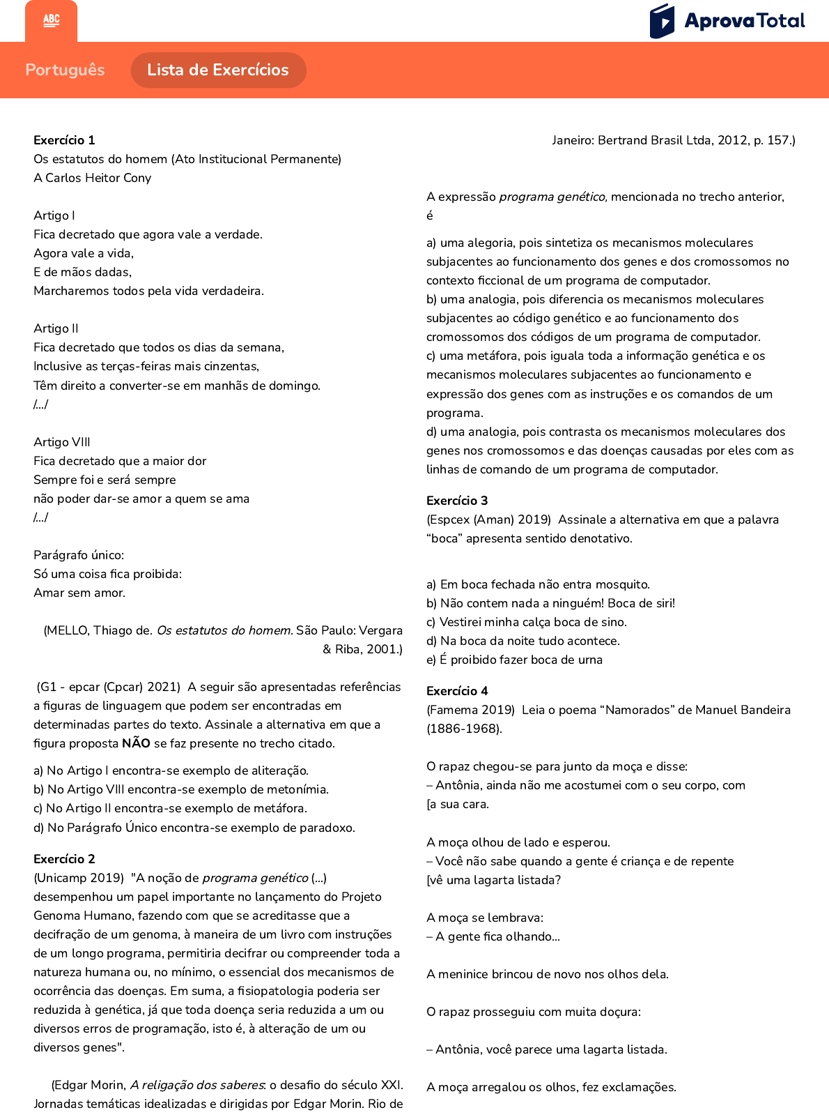 Português Lista de Exercícios Exercício 1 Os estatutos do homem (Ato Institucional Permanente) A Carlos Heitor Cony Artigo I Fica decretado que agora vale a verdade. Agora vale a vida, E de mãos dadas, Marcharemos todos pela vida verdadeira. Artigo II Fica decretado que todos os dias da semana, Inclusive as terças-feiras mais cinzentas, Têm direito a converter-se em manhãs de domingo. /.../ Artigo VIII Fica decretado que a maior dor Sempre foi e será sempre não poder dar-se amor a quem se ama /.../ Parágrafo único: Só uma coisa �ca proibida: Amar sem amor. (MELLO, Thiago de. Os estatutos do homem. São Paulo: Vergara & Riba, 2001.) (G1 - epcar (Cpcar) 2021) A seguir são apresentadas referências a �guras de linguagem que podem ser encontradas em determinadas partes do texto. Assinale a alternativa em que a �gura proposta NÃO se faz presente no trecho citado. a) No Artigo I encontra-se exemplo de aliteração. b) No Artigo VIII encontra-se exemplo de metonímia. c) No Artigo II encontra-se exemplo de metáfora. d) No Parágrafo Único encontra-se exemplo de paradoxo. Exercício 2 (Unicamp 2019) "A noção de programa genético (...) desempenhou um papel importante no lançamento do Projeto Genoma Humano, fazendo com que se acreditasse que a decifração de um genoma, à maneira de um livro com instruções de um longo programa, permitiria decifrar ou compreender toda a natureza humana ou, no mínimo, o essencial dos mecanismos de ocorrência das doenças. Em suma, a �siopatologia poderia ser reduzida à genética, já que toda doença seria reduzida a um ou diversos erros de programação, isto é, à alteração de um ou diversos genes". (Edgar Morin, A religação dos saberes: o desa�o do século XXI. Jornadas temáticas idealizadas e dirigidas por Edgar Morin. Rio de Janeiro: Bertrand Brasil Ltda, 2012, p. 157.) A expressão programa genético, mencionada no trecho anterior, é a) uma alegoria, pois sintetiza os mecanismos moleculares subjacentes ao funcionamento dos genes e dos cromossomos no contexto �ccional de um programa de computador. b) uma analogia, pois diferencia os mecanismos moleculares subjacentes ao código genético e ao funcionamento dos cromossomos dos códigos de um programa de computador. c) uma metáfora, pois iguala toda a informação genética e os mecanismos moleculares subjacentes ao funcionamento e expressão dos genes com as instruções e os comandos de um programa. d) uma analogia, pois contrasta os mecanismos moleculares dos genes nos cromossomos e das doenças causadas por eles com as linhas de comando de um programa de computador. Exercício 3 (Espcex (Aman) 2019) Assinale a alternativa em que a palavra “boca” apresenta sentido denotativo. a) Em boca fechada não entra mosquito. b) Não contem nada a ninguém! Boca de siri! c) Vestirei minha calça boca de sino. d) Na boca da noite tudo acontece. e) É proibido fazer boca de urna Exercício 4 (Famema 2019) Leia o poema “Namorados” de Manuel Bandeira (1886-1968). O rapaz chegou-se para junto da moça e disse: – Antônia, ainda não me acostumei com o seu corpo, com [a sua cara. A moça olhou de lado e esperou. – Você não sabe quando a gente é criança e de repente [vê uma lagarta listada? A moça se lembrava: – A gente �ca olhando... A meninice brincou de novo nos olhos dela. O rapaz prosseguiu com muita doçura: – Antônia, você parece uma lagarta listada. A moça arregalou os olhos, fez exclamações. O rapaz concluiu: – Antônia, você é engraçada! Você parece louca. (Estrela da vida inteira, 2009.) Veri�ca-se a ocorrência de personi�cação no seguinte verso: a) “– Antônia, você parece uma lagarta listada.” b) “A moça arregalou os olhos, fez exclamações.” c) “A meninice brincou de novo nos olhos dela.” d) “– Antônia, você é engraçada! Você parece louca.” e) “A moça olhou de lado e esperou.” Exercício 5 (G1 - ifpe 2019) Leia o texto para responder à questão. O AMOR COMEU MEU NOME O amor comeu meu nome, minha identidade, meu retrato. O amor comeu minha certidão de idade, minha genealogia, meu endereço. O amor comeu meus cartões de visita. O amor veio e comeu todos os papéis onde eu escrevera meu nome. O amor comeu minhas roupas, meus lenços, minhas camisas. O amor comeu metros e metros de gravatas. O amor comeu a medida de meus ternos, o número de meus sapatos, o tamanho de meus chapéus. [...] Faminto, o amor devorou os utensílios de meu uso: pente, navalha, escovas, tesouras de unhas, canivete. [...] O amor comeu minha paz e minha guerra. Meu dia e minha noite. Meu inverno e meu verão. Comeu meu silêncio, minha dor de cabeça, meu medo da morte. MELO NETO, J. C. Disponível em: <https://www.culturagenial.com/maiores-poemas-de-amor- literatura-brasileira/>. Acesso em: 04 out. 2018. A principal �gura de linguagem utilizada na construção do poema de João Cabral de Melo Neto reproduzido, em parte, no texto é a) eufemismo, uma vez que os objetos devorados pelo amor são representações da realidade. b) hipérbole, já que o amor devora, de forma exagerada, vários objetos que fazem parte do cotidiano do eu lírico. c) prosopopeia, pois ao amor são atribuídas ações humanas. d) sinestesia, como se pode perceber pela repetição do verbo “comer” associado ao substantivo abstrato “amor”. e) metonímia, a qual é marcada pela relação entre “nome, identidade e retrato” (primeiro verso), pois há uma gradação entre esses termos. Exercício 6 TEXTO PARA A PRÓXIMA QUESTÃO: Leia o trecho do livro A dança do universo, do físico brasileiro Marcelo Gleiser, para responder à(s) questão(ões) a seguir. Algumas pessoas tornam-se heróis contra sua própria vontade. Mesmo que elas tenham ideias realmente (ou potencialmente) revolucionárias, muitas vezes não as reconhecem como tais, ou não acreditam no seu próprio potencial. Divididas entre enfrentar sua insegurança expondo suas ide