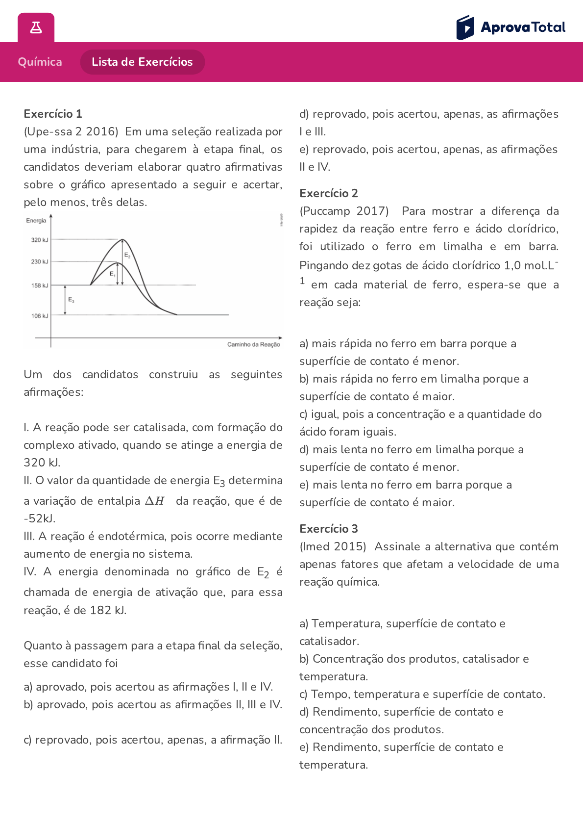 https://aprovatotal.com.br/medio/quimica/exercicios/cinetica-quimica/ex.10-introducao-a-cinetica-quimica 1/27 Química Lista de Exercícios Exercício 1 (Upe-ssa 2 2016) Em uma seleção realizada por uma indústria, para chegarem à etapa �nal, os candidatos deveriam elaborar quatro a�rmativas sobre o grá�co apresentado a seguir e acertar, pelo menos, três delas. Um dos candidatos construiu as seguintes a�rmações: I. A reação pode ser catalisada, com formação do complexo ativado, quando se atinge a energia de 320 kJ. II. O valor da quantidade de energia E3 determina a variação de entalpia da reação, que é de -52kJ. III. A reação é endotérmica, pois ocorre mediante aumento de energia no sistema. IV. A energia denominada no grá�co de E2 é chamada de energia de ativação que, para essa reação, é de 182 kJ. Quanto à passagem para a etapa �nal da seleção, esse candidato foi a) aprovado, pois acertou as a�rmações I, II e IV. b) aprovado, pois acertou as a�rmações II, III e IV. c) reprovado, pois acertou, apenas, a a�rmação II. d) reprovado, pois acertou, apenas, as a�rmações I e III. e) reprovado, pois acertou, apenas, as a�rmações II e IV. Exercício 2 (Puccamp 2017) Para mostrar a diferença da rapidez da reação entre ferro e ácido clorídrico, foi utilizado o ferro em limalha e em barra. Pingando dez gotas de ácido clorídrico 1,0 mol.L- 1 em cada material de ferro, espera-se que a reação seja: a) mais rápida no ferro em barra porque a superfície de contato é menor. b) mais rápida no ferro em limalha porque a superfície de contato é maior. c) igual, pois a concentração e a quantidade do ácido foram iguais. d) mais lenta no ferro em limalha porque a superfície de contato é menor. e) mais lenta no ferro em barra porque a superfície de contato é maior. Exercício 3 (Imed 2015) Assinale a alternativa que contém apenas fatores que afetam a velocidade de uma reação química. a) Temperatura, superfície de contato e catalisador. b) Concentração dos produtos, catalisador e temperatura. c) Tempo, temperatura e superfície de contato. d) Rendimento, superfície de contato e concentração dos produtos. e) Rendimento, superfície de contato e temperatura. ΔH https://aprovatotal.com.br/medio/quimica/exercicios/cinetica-quimica/ex.10-introducao-a-cinetica-quimica 2/27 Exercício 4 (Uece 2016) Alguns medicamentos são apresentados na forma de comprimidos que, quando ingeridos, dissolvem-se lentamente no líquido presente no tubo digestório, garantindo um efeito prolongado no organismo. Contudo, algumas pessoas, por conta própria, amassam o comprimido antes de tomá-lo. Esse procedimento é inconveniente, pois reduz o efeito prolongado devido: a) à diminuição da superfície de contato do comprimido, provocando redução na velocidade da reação. b) à diminuição da superfície de contato, favorecendo a dissolução. c) ao aumento da velocidade da reação em consequência do aumento da superfície de contato do comprimido. d) diminuição da frequência de colisões das partículas do comprimido com as moléculas do líquido presente no tubo digestório. Exercício 5 (Acafe 2016) Baseado nos conceitos sobre cinética das reações químicas, analise as a�rmações a seguir. I. Catálise heterogênea pode ser caracterizada quando existe uma superfície de contato visível entre os reagentes e o catalisador. II. A energia de ativação (Ea) varia com a concentração dos reagentes. III. A constante de velocidade (k) pode variar com a temperatura. IV. A energia de ativação (Ea) varia com a temperatura do sistema. Todas as a�rmações corretas estão em: a) I, II e IV. b) I, III e IV. c) I e III. d) II e III. Exercício 6 (Udesc 2016) Cinética química é a parte da Química que estuda a velocidade das reações, a in�uência das concentrações de produtos e os reagentes na velocidade, assim como a in�uência de outros fatores, como temperatura, presença de catalisador, inibidor, etc. Em termodinâmica estuda-se o equilíbrio entre espécies químicas em uma reação, assim como fatores que in�uenciam o deslocamento desse equilíbrio, que podem ser variados de forma a maximizar ou minimizar a obtenção de um determinado composto. Sobre essas duas importantes áreas da Química, analise as proposições. I. A in�uência da concentração dos reagentes sobre a velocidade de uma reação é dada pela sua lei de velocidade, que é uma expressão matemática que sempre envolve a concentração de todos os reagentes, cada um elevado ao seu coe�ciente estequiométrico. II. A posição de um dado equilíbrio químico – o lado para o qual ele se encontra majoritariamente deslocado – pode ser deduzida a partir da lei de velocidade para qualquer equilíbrio químico. III. Reações lentas são reações necessariamente deslocadas para os reagentes. Já reações rápidas se processam com consumo total dos reagentes e de maneira quase imediata. IV. À pressão constante, o aumento da temperatura tem sempre uma in�uência de https://aprovatotal.com.br/medio/quimica/exercicios/cinetica-quimica/ex.10-introducao-a-cinetica-quimica 3/27 aumentar a velocidade de uma reação, mas o efeito desse aumento sobre o deslocamento do equilíbrio depende, primordialmente, da variação de entalpia para a reação na faixa de temperatura avaliada. V. Tempo de meia vida é o tempo necessário para que a concentração de um reagente caia a metade de seu valor inicial, correspondendo ao tempo de equilíbrio da reação, que é de�nido como o tempo necessário para que metade dos produtos se transforme em reagente. Assinale a alternativa correta. a) Somente a a�rmativa III é verdadeira. b) Somente a a�rmativa IV é verdadeira. c) Somente as a�rmativas I e V são verdadeiras. d) Somente as a�rmativas I, II e IV são verdadeiras. e) Somente as a�rmativas I, III e V são verdadeiras. Exercício 7 (G1 - ifba 2017) 