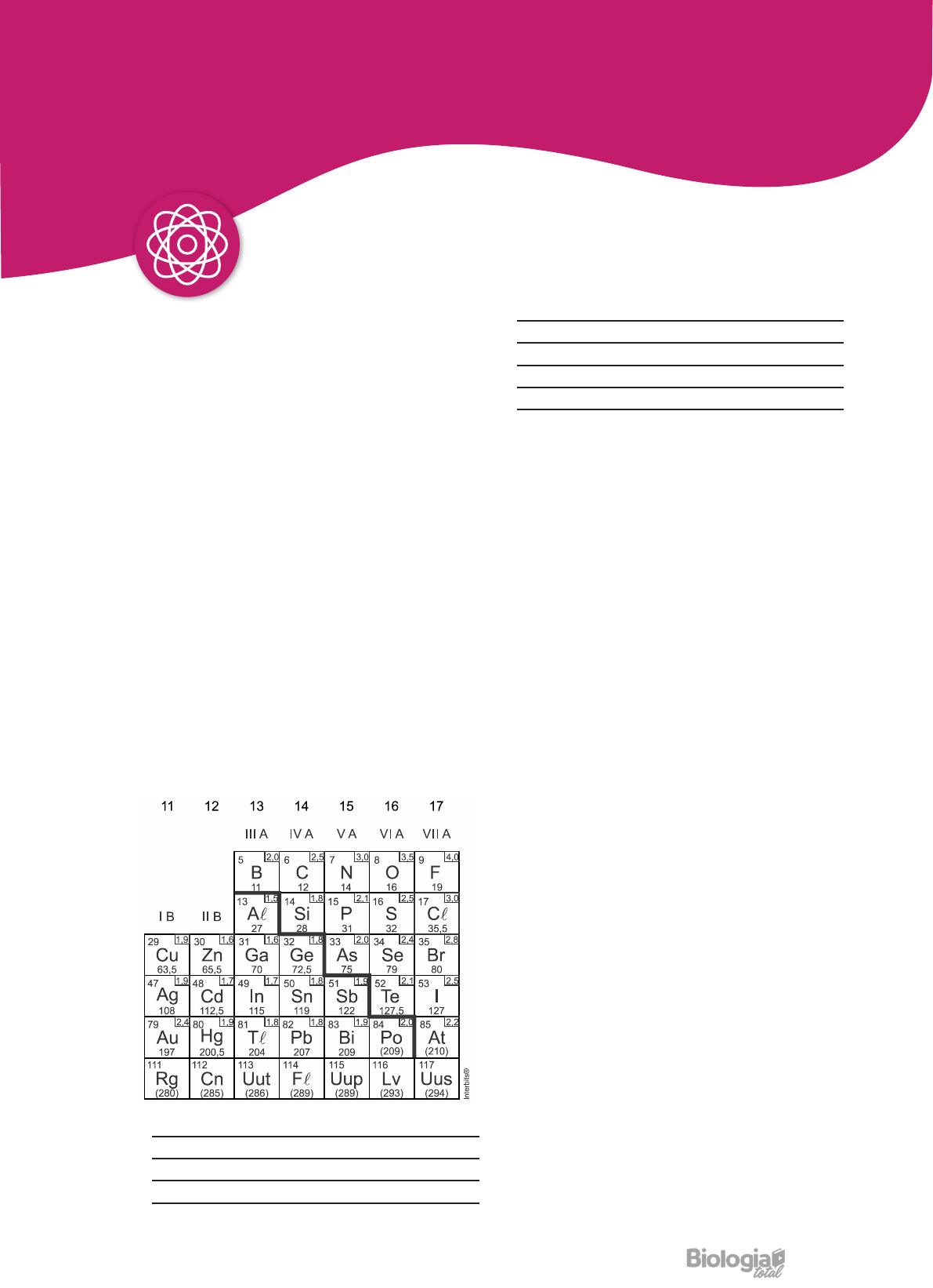 TABELA PERIÓDICA 11 1. (UERJ 2017) Na premiação das Olimpíadas, o primeiro, o segundo e o terceiro colocados em cada competição recebem, respectivamente, medalha de ouro (Au), de prata (Ag) e de bronze. Sabe-se que o bronze é uma liga metálica formada, entre outros elementos químicos, por cobre (Cu) e estanho (Sn). Considerando os metais citados, escreva o símbolo daquele que possui maior massa atômica e o nome daquele que pertence ao grupo 14 da tabela de classificação periódica. Em seguida, apresente duas fórmulas: a do cátion divalente do metal de menor raio atômico do grupo 11 da tabela de classificação periódica e a do cloreto composto pelo metal correspondente à medalha da segunda colocação. Dado: 2. (UEPG 2016) Considerando os átomos neutros A (Z = 17), D (Z = 12), E (Z = 15), J (Z = 18) e X (Z = 19), assinale o que for correto. 01. O átomo A é um halogênio. 02. O átomo com maior raio atômico é o X. 04. O átomo E possui energia de ionização maior que o átomo D. 08. Os átomos X e J pertencem à mesma família da tabela periódica. 16 O átomo com maior afinidade eletrônica é o átomo J. 3. (UEPG 2016) Com relação aos processos abaixo, assinale o que for correto. 1 2E E0 2 (g) (g) (g)A A A + +→ → 01. A energia E1 é menor que a energia E2. 02. A energia E1 é a energia liberada para retirar um elétron de um átomo isolado. 04. A espécie A2+ possui um raio atômico menor que a espécie A0. 08. A energia E2 é a segunda energia de ionização do átomo A. 16. O processo apresentado pode representar a ionização de um átomo de metal alcalino-terroso. 22 Ex er cí ci os A pr of un da do s: T ab el a Pe rió di ca 4. (UEL 2016) O desenvolvimento da Tabela Periódica culminou na disposição sistemática dos elementos em grupos de acordo com características químicas similares entre si. Os elementos metálicos pertencentes ao Grupo 1 incluem rubídio (Rb), lítio (Li), frâncio (Fr), potássio (K), sódio (Na) e césio (Cs), os quais exibem diferentes reatividades. Quando pequena quantidade de cada elemento do Grupo 1 é adicionada a um frasco contendo água pura, ocorre uma reação química cuja velocidade e liberação de calor são proporcionais à reatividade dos referidos metais. Baseado nas propriedades químicas desses elementos metálicos, responda aos itens a seguir. a. Disponha todos os elementos do Grupo 1 em ordem decrescente de reatividade e explique a sequência. b. Sabe-se que a adição de elementos metálicos do Grupo 1 promove alteração do pH da água pura. Essa alteração pode ser comprovada mediante o uso de indicadores ácido-base. O quadro a seguir apresenta alguns indicadores ácido-base com suas respectivas faixas de viragem, em função do pH. Indicadores ácido-base Mudança de cor Faixas de viragem (pH) Alaranjado de metila Vermelho para amarelo 3,1 – 4,4 Azul de timol Amarelo para azul 1,2 – 2,8 Fenolftaleína Incolor para rosa 8,3 – 10,0 Roxo de bromocresol Amarelo para roxo 5,2 – 6,8 c. Desconsiderando a possível reação do indicador ácido-base no meio com produtos da reação, indique, entre os indicadores ácido-base relacionados no quadro, qual deles permite comprovar a mudança de pH após a adição de elementos do Grupo 1 em água pura. Justifique sua resposta. 5. (UERJ 2015) Para que os fogos de artifício produzam cores diferentes, os fabricantes misturam à pólvora sais de alguns metais, como os da tabela a seguir. Metal Coloração obtida bário verde cálcio laranja cobre azul estrôncio ou lítio vermelha ferro dourada sódio amarela titânio, alumínio ou magnésio prateada Considerando as informações da tabela acima, identifique o metal alcalino terroso responsável pela cor prateada e apresente a fórmula mínima do cloreto formado por esse elemento; em seguida, aponte a coloração obtida pelo metal que possui menor raio atômico e determine seu número de oxidação quando na forma de cátion. 6. (UEPG 2015) Com relação aos elementos abaixo, representados por A, B, e C e seus respectivos números atômicos, assinale o que for correto. A (Z = 12) B (Z = 32) C (Z = 38) 3www.biologiatotal.com.br 3www.biologiatotal.com.br Ex er cí ci os A pr of un da do s: T ab el a Pe rió di ca01. Os elementos A e C fazem parte do mesmo período da Tabela Periódica. 02. O elemento B é o que apresenta o maior caráter metálico. 04. O elemento que perderá o elétron mais facilmente é o elemento C, sendo este o menos eletronegativo. 08. O elemento mais eletronegativo é o elemento B. 7. (UEPG 2015) Considerando os átomos abaixo, representados pelas letras X, Y, Z e W e, a partir de suas configurações eletrônicas, assinale o que for correto quanto às propriedades periódicas e a localização na Tabela Periódica atual. X (Z = 16), Y (Z = 20), Z (Z = 29), W (Z = 35) 01. Os átomos Y e W estão no mesmo período da Tabela Periódica. 02. O átomo Z pertence a um elemento de transição externa. 04. Y tem maior raio atômico do que W. 08. O átomo Y tem maior eletronegatividade do que o átomo X. 16. X e W estão localizados em colunas vizinhas, mas não no mesmo período da Tabela Periódica. 8. (UEM 2015) A respeito das propriedades periódicas dos elementos, assinale a(s) alternativa(s) correta(s). 01. A reatividade química dos metais aumenta com o caráter metálico crescente. 02. Os elementos químicos de maior densidade estão localizados na região central inferior da tabela periódica, onde estão o ósmio, o irídio e a platina. 04. Os elementos que possuem os maiores volumes atômicos são os metais alcalinos, seguidos dos gases nobres. 08. Quanto menor for o raio atômico, mais próximo estará o elétron do núcleo e, portanto, maior será a energia necessária para removê-lo. Em uma mesma família da tabela periódica, a afinidade eletrônica cresce de cima para baixo. 9. (UFES 2015) O cálcio e o bário são elementos que pertencem à família 2A (Grupo 2) da tabela periód