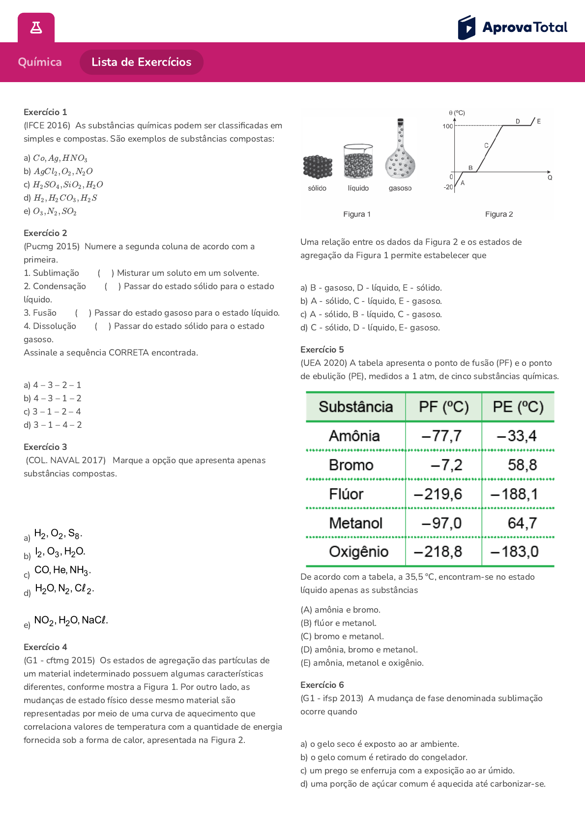https://www.biologiatotal.com.br/medio/quimica/exercicios/estudo-da-materia/ex.8-estudos-da-materia 1/15 Química Lista de Exercícios Exercício 1 (IFCE 2016) As substâncias químicas podem ser classi�cadas em simples e compostas. São exemplos de substâncias compostas: a) b) c) d) e) Exercício 2 (Pucmg 2015) Numere a segunda coluna de acordo com a primeira. 1. Sublimação ( ) Misturar um soluto em um solvente. 2. Condensação ( ) Passar do estado sólido para o estado líquido. 3. Fusão ( ) Passar do estado gasoso para o estado líquido. 4. Dissolução ( ) Passar do estado sólido para o estado gasoso. Assinale a sequência CORRETA encontrada. a) 4 – 3 – 2 – 1 b) 4 – 3 – 1 – 2 c) 3 – 1 – 2 – 4 d) 3 – 1 – 4 – 2 Exercício 3 (COL. NAVAL 2017) Marque a opção que apresenta apenas substâncias compostas. a) b) c) d) e) Exercício 4 (G1 - cftmg 2015) Os estados de agregação das partículas de um material indeterminado possuem algumas características diferentes, conforme mostra a Figura 1. Por outro lado, as mudanças de estado físico desse mesmo material são representadas por meio de uma curva de aquecimento que correlaciona valores de temperatura com a quantidade de energia fornecida sob a forma de calor, apresentada na Figura 2. Uma relação entre os dados da Figura 2 e os estados de agregação da Figura 1 permite estabelecer que a) B - gasoso, D - líquido, E - sólido. b) A - sólido, C - líquido, E - gasoso. c) A - sólido, B - líquido, C - gasoso. d) C - sólido, D - líquido, E- gasoso. Exercício 5 (UEA 2020) A tabela apresenta o ponto de fusão (PF) e o ponto de ebulição (PE), medidos a 1 atm, de cinco substâncias químicas. De acordo com a tabela, a 35,5 ºC, encontram-se no estado líquido apenas as substâncias (A) amônia e bromo. (B) �úor e metanol. (C) bromo e metanol. (D) amônia, bromo e metanol. (E) amônia, metanol e oxigênio. Exercício 6 (G1 - ifsp 2013) A mudança de fase denominada sublimação ocorre quando a) o gelo seco é exposto ao ar ambiente. b) o gelo comum é retirado do congelador. c) um prego se enferruja com a exposição ao ar úmido. d) uma porção de açúcar comum é aquecida até carbonizar-se. Co,Ag,HNO3 AgC , , Ol2 O2 N2 S ,Si , OH2 O4 O2 H2 , C , SH2 H2 O3 H2 , ,SO3 N2 O2 https://www.biologiatotal.com.br/medio/quimica/exercicios/estudo-da-materia/ex.8-estudos-da-materia 2/15 e) uma estátua de mármore é corroída pela chuva ácida. Exercício 7 (G1 - cftmg 2017) Sobre o esquema seguinte, que representa um modelo cinético-molecular de uma mesma substância, foram feitas quatro a�rmações: I. Ao passar da fase B para a C, o sistema absorve calor. II. O grau de agitação molecular em A é maior que em B. III. O processo II ocorre com liberação de calor. IV. No processo I, ocorre o fenômeno da fusão. Estão corretas apenas as a�rmativas a) I e II. b) I e IV. c) II e III. d) III e IV. Exercício 8 (CFTRJ 2017) “Clarear o cabelo em salão com química ou em casa, sem química?” A�nal no salão serão usados tonalizantes, oxidantes, neutralizantes e uma série de outras substâncias. Já o processo caseiro, conta com as receitas antigas que resistiram aos anos. Nesse universo encontramos a cebola, o suco de limão, canela, ruibarbo e até o mel para mudar a tonalidade dos cabelos. Sobre o tratamento caseiro, podemos inferir que: a) por ser natural e sem a presença de substâncias químicas é menos invasivo b) ter apenas produtos naturais signi�ca que oferece riscos menores ao uso; c) apesar de ser um processo natural, também contém substâncias químicas; d) a isenção de tonalizantes e outras substâncias torna o procedimento seguro. Exercício 9 (G1 - ifsc 2014) Podemos determinar o estado físico de uma substância, observando sua temperatura de fusão e de ebulição. Observe o quadro abaixo: Assinale a alternativa CORRETA. a) É possível determinar se uma substância é sólida, apenas pelo seu ponto de ebulição. b) O alumínio é sólido nas condições ambientes, pois apresenta baixo ponto de fusão. c) A 70°C o metanol é líquido. d) A amônia apresenta alto ponto de fusão e ebulição. e) A 25°C o oxigênio é gasoso. Exercício 10 (IFSP 2017) Com relação a processos químicos e físicos, correlacione as colunas. 1. Processos Químicos. 2. Processos Físicos. ( ) Queima de papel. ( ) Papel amassado. ( ) Obtenção de sal a partir da evaporação da água do mar. ( ) Palha de aço enferrujada. ( ) Bloco de cobre transformado em �os de cobre. Assinale a alternativa que apresenta a sequência correta. a) 1 – 2 – 1 – 2 – 1 b) 1 – 2 – 2 – 1 – 2 c) 2 – 1 – 1 – 2 – 1 d) 1 – 1 – 2 – 1 – 2 e) 2 – 1 – 2 – 1 – 1 Exercício 11 (CPS 2014) O Vale dos Vinhedos, localizado na Serra Gaúcha, representa o legado histórico, cultural e gastronômico deixado pelos imigrantes italianos que chegaram à região em 1875 e, hoje, está em perfeita harmonia com as modernas tecnologias para produção de uva e vinhos �nos, possuindo infraestrutura turística de alta qualidade. (setur.rs.gov.br/portal/index.php? q=destino&cod=4&opt=&id=36&bd=&fg=3 Acesso em: https://www.biologiatotal.com.br/medio/quimica/exercicios/estudo-da-materia/ex.8-estudos-da-materia 3/15 10.09.2013.) Na obtenção do vinho, o açúcar da uva é transformado em etanol (o álcool presente no vinho) e em gás carbônico, conforme a reação representada pela equação: C6H12O6 --> 2 C2H5OH + 2 CO2 Nessa equação, nota-se a representação de a) dois reagentes. b) cinco substâncias. c) um processo físico. d) cinco substâncias simples. e) três substâncias compostas. Exercício 12 (G1 - ifsp 2012) Um frasco de amostra contendo três substâncias químicas, A, B e C, foi enviado a um laboratório químico para ser analisado. O rótulo apresenta os seus pontos de fusão (P.F.) e pontos de ebulição (P.E.) à pressão de 1 atm conforme o quadro a seguir: A primeira medida to