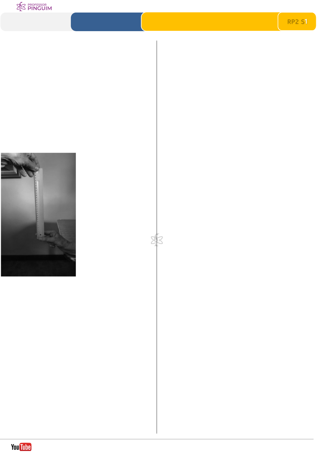 1 Extensivo de Física RP2 S1Revisão Parcial 2 DINÂMICA 2 Plano Inclinado. Resultante Centripeta Resoluções em vídeo ► professorpinguim.com.br /profpinguim 1. (Fcmmg) Renato quer saber o tempo de reflexo entre ver e agir de sua mãe, pois ela é motorista e ele se preocupa com a segurança dela no trânsito. Para tanto, realiza um experimento no qual ele mantém uma régua de 30 cm, suspensa verticalmente, segurando-a entre seus dedos pela extremidade superior, de maneira que o zero da régua esteja posicionado na extremidade inferior. Neste momento, pede a sua mãe para apoiar a mão direita sobre a beirada de uma mesa, abrindo levemente os dedos polegar e indicador na altura do zero da régua, sem tocá-la, mas prontos para segurá-la assim que a régua for abandonada, como mostra a foto abaixo (foto do autor). Sem prévio aviso, a régua é abandonada e a mãe de Renato pega a régua depois de cair 20 cm. Certo dia, o carro dirigido pela mãe desce uma rua inclinada de 30° e quando atinge a velocidade de 18 km/h, ela vê um buraco adiante e pisa o freio. Considerando que, durante a freada, o carro desce a rua sem atrito, que g vale 10 m/s2, que sen30 0,50,° = que cos30 0,87° = e que o tempo de reflexo da mãe é o mesmo que aconteceu com a queda da régua, a distância que o carro percorre entre a mãe ver o buraco e pisar o freio é de: a) 1,10 m. b) 1,87 m. c) 2,00 m. d) 2,53 m. 2. (Uepg-pss 1) Um móvel de massa 50 g realiza um movimento circular uniforme (MCU), de raio 10 m e período igual a 2 s. Analise esse movimento e assinale o que for correto. 01) A frequência do movimento vale 0,5 Hz. 02) A força centrípeta que age sobre essa massa tem valor igual a 45 N. 04) A velocidade angular desse móvel é igual a π rad/s. 08) Utilizando para ( )π o valor aproximado igual a 3, pode-se afirmar que sua velocidade linear vale 108 km/h. https://youtube.com/profpinguim https://professorpinguim.com.br https://youtube.com/profpinguim 2 Extensivo de Física RP2 S1Revisão Parcial 2 DINÂMICA 2 Plano Inclinado. Resultante Centripeta Resoluções em vídeo ► professorpinguim.com.br /profpinguim 3. (Famema) Um bloco de 60 kg é abandonado sobre um plano inclinado em 30° com a horizontal. Para mantê-lo em repouso, o bloco é preso a uma das extremidades de um fio que, após passar por uma roldana fixa, é puxado verticalmente para baixo, na outra extremidade, por um homem de 80 kg que está em repouso, de pé, sobre um piso horizontal, como ilustra a figura. Considere o fio e a roldana ideais, os atritos desprezíveis, o trecho do fio entre o bloco e a roldana paralelo ao plano inclinado e g = 10 m/s2. O módulo da força exercida pelo piso horizontal sobre o homem é a) 800 N. b) 600 N. c) 500 N. d) 300 N. e) 200 N. 4. (Unisinos) Um bloco de massa 5 kg encontra-se em repouso sobre um plano com inclinação de 30° em relação à horizontal, preso a um dinamômetro, calibrado em newton, posicionado paralelo à superfície do plano, tal como ilustrado na figura abaixo. Não há atrito entre o bloco e a superfície do plano inclinado. Com base nas teorias da dinâmica newtoniana, analise as afirmações a seguir: I. O módulo da força normal que a superfície do plano aplica no bloco é de 50 N. II. A leitura do dinamômetro indica o valor de 25 N. III. Caso o dinamômetro seja retirado e o bloco desça o plano, o módulo de sua aceleração será de 2 5 3 m s . 2 Sobre as proposições acima, pode-se afirmar que a) apenas I está correta. b) apenas II está correta. c) apenas I e III estão corretas. d) apenas II e III estão corretas. e) I, III e III estão corretas. https://youtube.com/profpinguim https://professorpinguim.com.br https://youtube.com/profpinguim 3 Extensivo de Física RP2 S1Revisão Parcial 2 DINÂMICA 2 Plano Inclinado. Resultante Centripeta Resoluções em vídeo ► professorpinguim.com.br /profpinguim 5. (Fmj) Uma pessoa desceu uma ladeira, inclinada de um ângulo 30° em relação à horizontal, em um carrinho de rolimã, com aceleração média de 21,5 m s . Considere que a aceleração gravitacional fosse 210 m s , que a massa do conjunto pessoa e carrinho fosse 60 kg, que sen30 0,50° = e que cos30 0,87.° = Se, durante a descida, o conjunto foi impulsionado apenas pelo próprio peso, a intensidade média da resultante das forças de resistência que atuaram sobre o conjunto foi de a) 300 N. b) 210 N. c) 520 N. d) 390 N. e) 90 N. 6. (Puccamp) Num trecho retilíneo de uma pista de automobilismo há uma lombada cujo raio de curvatura é de 50 m. Um carro passa pelo ponto mais alto da elevação com velocidade v, de forma que a interação entre o veículo e o solo (peso aparente) é mg 5 neste ponto. Adote g = 10 m/s2. Nestas condições, em m/s, o valor de v é a) 10 b) 20 c) 30 d) 40 e) 50 https://youtube.com/profpinguim https://professorpinguim.com.br https://youtube.com/profpinguim 4 Extensivo de Física RP2 S1Revisão Parcial 2 DINÂMICA 2 Plano Inclinado. Resultante Centripeta Resoluções em vídeo ► professorpinguim.com.br /profpinguim 7. (Acafe) Uma comissão de engenheiros necessita fornecer alguns dados técnicos a uma fábrica de pneus. Para uma curva de raio 120 metros, quando um veículo entra na mesma com velocidade 108 km/h, qual deverá ser o coeficiente de atrito ' 'μ entre os pneus e o asfalto para o carro não derrapar? Dados: g = 10 m/s2 a) 0,09 b) 0,75 c) 0,9 d) 0,075 8. (Eear) Num pêndulo cônico uma pequena esfera de massa igual a 2 kg está suspensa por um fio ideal, de massa desprezível e com 4 m de comprimento. Sabendo que a esfera descreve movimento circular uniforme, com o centro em C, qual o valor da velocidade angular desse movimento, em rad s? Adote o módulo da aceleração da gravidade no local igual a 210 m s . a) 2 2 b) 3 2 c) 5 d) 2 5 https://youtube.com/profpinguim https://professorpinguim.com.br https://youtube.com/profpinguim