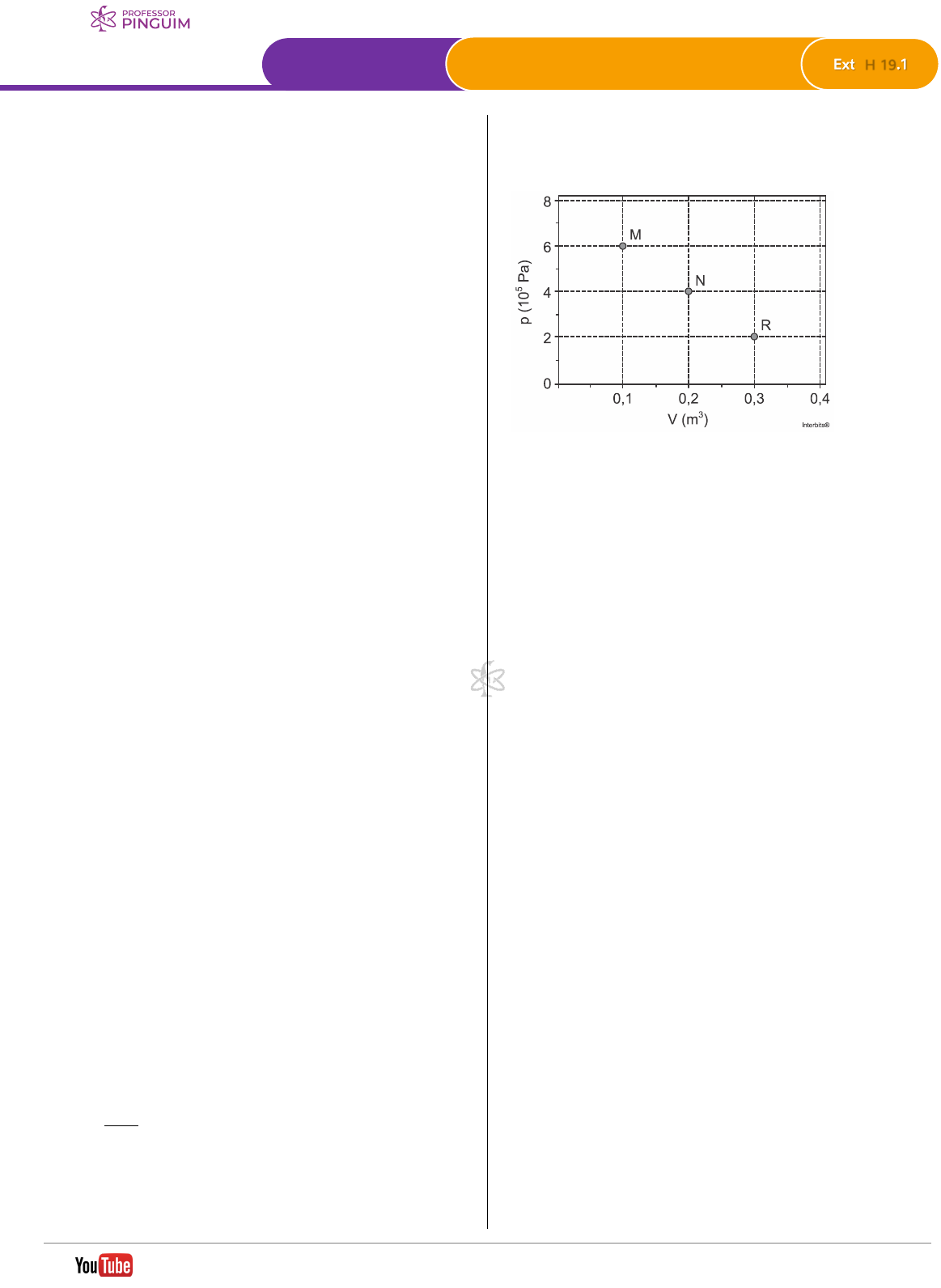 | 3 Extensivo de Física Ext H 19.1TERMOLOGIA Lista 1 Gases Ideais Resoluções em vídeo ► professorpinguim.com.br /profpinguim 1. Considere que a bola tenha um volume de 4 litros e que a pressão do ar, no seu interior, seja de 5 × 105 N/m2 , quando a temperatura for de 27°C. Constante universal dos gases: R = 8,31 J/(mol K) = 0,082 atm.L/(Mol K) Sabendo que o ar, nessas condições, comporta-se, aproximadamente, como gás ideal, a quantidade de ar dentro da bola, em mol, é de, aproximadamente, a) 0,8 b) 1,25 c) 8,8 d) 80 e) 160 2. (Uerj) Em um reator nuclear, a energia liberada na fissão de 1 g de urânio é utilizada para evaporar a quantidade de 43,6 10⋅ kg de água a 227ºC e sob 30 atm, necessária para movimentar uma turbina geradora de energia elétrica. Admita que o vapor d’água apresenta comportamento de gás ideal. O volume de vapor d’água, em litros, gerado a partir da fissão de 1 g de urânio, corresponde a: a) 51,32 10⋅ b) 62,67 10⋅ c) 73,24 10⋅ d) 87,42 10⋅ 3. (Pucrj) Um mol de gás ideal, à pressão de 16,6 atm, ocupa uma caixa cúbica cujo volume é de 0,001 m3. Qual a temperatura do gás e a força que o gás exerce sobre a tampa quadrada da caixa? (Considere 1,0 atm = 1,0.10 5 Pa, R = 8,3 J/mol K) a) 100 K e 8,3 . 103 N b) 100 K e 16,6 . 103 N c) 166 K e 8,3 . 103 N d) 200 K e 16,6 . 103 N e) 200 K e 8,3 . 103 N 4. (Uece) Considere um gás ideal que passa por dois estados, através de um processo isotérmico reversível. Sobre a pressão P e o volume V desse gás, ao longo desse processo, é correto afirmar-se que a) PV é crescente de um estado para outro. b) PV é constante. c) PV é decrescente de um estado para outro. d) PV é inversamente proporcional à temperatura do gás. 5. (ESPM-SP) Uma substância pura no estado gasoso, de massa igual a 336 g, ocupa um volume de 98,4 litros sob pressão de 3 atm. Se a massa molecular é M = 28 g, qual a temperatura, em graus Celsius, da substancia? R = 0,082 𝑎𝑎𝑎𝑎𝑎𝑎 · ℓ 𝑎𝑎𝑚𝑚𝑚𝑚 ·𝐾𝐾 6. (Ufrgs) A figura abaixo apresenta um diagrama Pressão × Volume. Nele, os pontos M, N e R representam três estados de uma mesma amostra de gás ideal. Assinale a alternativa que indica corretamente a relação entre as temperaturas absolutas MT , NT e RT dos respectivos estados M, N e R. a) R M NT T T .< > b) R M NT T T .> > c) R M NT T T .= > d) R M NT T T .< < e) R M NT T T .= < 7. (Odonto-Diamantina) Um recipiente indilatável e vedado hermeticamente contem um gás em seu interior. Se a temperatura é de 27°C, a pressão exercida pelo gás é de 1 atm. Considere o gás como ideal. A pressão do gás será de 2 atm, se a temperatura no interior do recipiente for, em °C, igual a: a) 54 b) 108 c) 300 d) 327 e) 600 8. (Fatec) Uma das atrações de um parque de diversões é a barraca de tiro ao alvo, onde espingardas de ar comprimido lançam rolhas contra alvos, que podem ser derrubados. Ao carregar uma dessas espingardas, um êmbolo comprime 120 mL de ar atmosférico sob pressão de 1 atm, reduzindo seu volume para 15 mL. A pressão do ar após a compressão será, em atm, Admita que o ar se comporte como um gás ideal e que o processo seja isotérmico. a) 0,2. b) 0,4. c) 4,0. d) 6,0. e) 8,0. https://professorpinguim.com.br https://youtube.com/profpinguim https://youtube.com/profpinguim https://professorpinguim.com.br https://youtube.com/profpinguim https://professorpinguim.com.br https://professorpinguim.com.br https://youtube.com/profpinguim https://professorpinguim.com.br https://youtube.com/profpinguim https://youtube.com/profpinguim | 3 Extensivo de Física Ext H 19.1TERMOLOGIA Lista 1 Gases Ideais Resoluções em vídeo ► professorpinguim.com.br /profpinguim 9. (Mack-SP) Um gás perfeito sofre um processo no qual sua pressão triplica e sua temperatura passa de 0°C para 136,5°C. Nessas condições, o seu volume é: a) Reduzido à metade b) Duplicado. c) Reduzido a um terço do inicial. d) Triplicado. e) Mantido constante. 10. (Unimep-SP) 15 litros de uma determinada massa gasosa encontram-se a uma pressão de 8 atm e à temperatura de 30°C. Ao sofrer uma expansão isotérmica, seu volume passa a 20 litros. Qual será a nova pressão? a) 10 atm b) 6 atm c) 8 atm d) 5 atm e) É impossível determinar. 11. (UECE) Uma dada massa de gás hélio sofreu uma transformação que a levou de um estado de equilíbrio inicial I, situado no plano pressão X volume, para um estado de equilíbrio final F, do mesmo plano, conforme a figura. Se a temperatura do estado inicial era 100 K, a temperatura do estado final é: a) 100 K b) 200 K c) 400 K d) 700 K 12. (Uerj) Um mergulhador precisa encher seu tanque de mergulho, cuja capacidade é de 2 31,42 10 m ,−× a uma pressão de 140 atm e sob temperatura constante. O volume de ar, em m3, necessário para essa operação, à pressão atmosférica de 1 atm, é aproximadamente igual a: a) 1 4 b) 1 2 c) 2 d) 4 13. (Uece) Seja um recipiente metálico fechado e contendo ar comprimido em seu interior. Considere desprezíveis as deformações no recipiente durante o experimento descrito a seguir: a temperatura do ar comprimido é aumentada de 24 °C para 40 °C. Sobre esse gás, é correto afirmar-se que a) sua pressão permanece constante, pois já se trata de ar comprimido. b) sua pressão aumenta. c) sua energia interna diminui, conforme prevê a lei dos gases ideais. d) sua energia interna permanece constante, pois o recipiente não muda de volume e não há trabalho realizado pelo sistema. 14. (Udesc) Um sistema fechado, contendo um gás ideal, sofre um processo termodinâmico isobárico, provocando mudança de temperatura de 200°C para 400°C. Assinale a alternativa que representa a razão aproximada entre o volume final e o inicial do gás ideal. a) 1,5 b) 0,5 c) 1,4 d) 2,0 e) 1,0 15. (Ufpe) Um gás ideal passa por uma transformação termodinâmica em que sua pressão dobra, seu número de moléculas triplica, e seu volume é mul