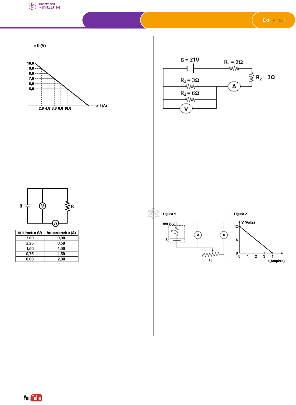 | 4 Extensivo de Física Ext F 15.1 ELETRODINÂMICA Lista 12 Gerador Elétrico. Circuitos Simples Resoluções em vídeo ► professorpinguim.com.br /profpinguim 1. (G1 - cftmg) Observe o gráfico característico de um gerador. Se uma lâmpada de resistência 3,5 Ω for ligada em série com esse gerador, a corrente elétrica na lâmpada, em amperes, será a) 2,5. b) 3,0. c) 7,5. d) 10. 2. (Ufg) Para investigar o desempenho de uma bateria B, foi montado o circuito a seguir, em que V e A representam, respectivamente, um voltímetro e um amperímetro ideais. A resistência R é variável e os fios de ligação têm resistências desprezíveis. Nessas condições podemos dizer que ( ) ( ) a força eletromotriz da bateria é igual a 3,00 V. ( ) ( ) a resistência interna da bateria é igual a 1,50 Ω . ( ) ( ) para a corrente de 1,00 A, a potência dissipada na resistência R é igual a 3,00 W. ( ) ( ) quando a diferença de potencial sobre R for igual a 2,25 V, a quantidade de carga que a atravessa em 10 s é igual a 22,5 C. 3. (PUC-PR) O circuito esquematizado a seguir é constituído pelos resistores R1, R2 ,R3 e R„ e pelo gerador de força eletromotriz ε e resistência interna desprezível. A corrente e a tensão indicadas pelo amperímetro A e voltímetro V ideais são, respectivamente: a) 3A e 6V b) 6A e 3V c) 2A e 5V d) 5A e 2V e) 5A e 3V 4. (Ufu) O circuito elétrico (fig. 1) é utilizado para a determinação da resistência interna r e da força eletromotriz ε do gerador. Um resistor variável R (também conhecido como reostato) pode assumir diferentes valores, fazendo com que a corrente elétrica no circuito também assuma valores diferentes para cada valor escolhido de R. Ao variar os valores de R, foram obtidas leituras no voltímetro V e no amperímetro A, ambos ideais, resultando no gráfico (fig. 2). Com base nessas informações, assinale a alternativa que corresponde aos valores corretos, respectivamente, da resistência interna e da força eletromotriz do gerador. a) 2Ω e 7 V. b) 1Ω e 4 V. c) 3Ω e 12 V. d) 4Ω e 8 V. https://professorpinguim.com.br https://youtube.com/profpinguim https://youtube.com/profpinguim https://professorpinguim.com.br https://youtube.com/profpinguim https://professorpinguim.com.br https://professorpinguim.com.br https://youtube.com/profpinguim https://professorpinguim.com.br https://youtube.com/profpinguim https://youtube.com/profpinguim | 4 Extensivo de Física Ext F 15.1 ELETRODINÂMICA Lista 12 Gerador Elétrico. Circuitos Simples Resoluções em vídeo ► professorpinguim.com.br /profpinguim 5. (Ufrj) Uma bateria comercial de 1,5V é utilizada no circuito esquematizado a seguir, no qual o amperímetro e o voltímetro são considerados ideais. Varia-se a resistência R, e as correspondentes indicações do amperímetro e do voltímetro são usadas para construir o seguinte gráfico de voltagem (V) versus intensidade de corrente (I). Usando as informações do gráfico, calcule: a) o valor da resistência interna da bateria; b) a indicação do amperímetro quando a resistência R tem o valor 1,7Ω. 6. No circuito abaixo observa-se que, quando a chave C está aberta, o voltímetro indica 4,5 V. Ligando-se a chave, o amperímetro indica 4,0 A e o voltímetro passa a indicar 4,2 V. A partir dessas medidas e considerando que o voltímetro e o amperímetro são equipamentos ideais, determine a resistência interna da bateria e a resistência externa R. 7. (Ufrgs) Considere o circuito a seguir. No circuito, por onde passa uma corrente elétrica de 4 A, três resistores estão conectados a uma fonte ideal de força eletromotriz de 20 V. Os valores da resistência total deste circuito e da resistência RX são, respectivamente, a) 0,8 e 2,6 .Ω Ω b) 0,8 e 4,0 .Ω Ω c) 5,0 e 5,0 .Ω Ω d) 5,0 e 10,0 .Ω Ω e) 10,0 e 4,0 .Ω Ω 8. (Unicamp-SP modificada) No circuito a seguir, A é um amperímetro e V é um voltímetro, ambos ideais. A bateria que alimenta os resistores é ideal. Reproduza o circuito no caderno de resposta e responda: a) Qual o sentido da corrente em A? (desenhe uma seta). b) Qual o valor da resistência equivalente ligadas aos terminais da bateria? c) Qual o valor da corrente no amperímetro A? d) Qual o valor da voltagem no voltímetro V? R https://professorpinguim.com.br https://youtube.com/profpinguim https://youtube.com/profpinguim https://professorpinguim.com.br https://youtube.com/profpinguim https://professorpinguim.com.br https://professorpinguim.com.br https://youtube.com/profpinguim https://professorpinguim.com.br https://youtube.com/profpinguim https://youtube.com/profpinguim https://professorpinguim.com.br https://youtube.com/profpinguim | 4 Extensivo de Física Ext F 15.1 ELETRODINÂMICA Lista 12 Gerador Elétrico. Circuitos Simples Resoluções em vídeo ► professorpinguim.com.br /profpinguim 9. (Uerj) No esquema abaixo, está representada a instalação de uma torneira elétrica. De acordo com as informações do fabricante, a resistência interna r da torneira corresponde a 200 .Ω A corrente que deve percorrer o circuito da torneira é de 127mA. Determine o valor da resistência R que deve ser ligada em série à torneira para que esta possa funcionar de acordo com a especificação do fabricante, quando ligada a uma tomada de 127V. Calcule, em watts, a potência dissipada por essa torneira. 10. (Puccamp) Um circuito e constituido por um gerador (E, r), e dois resistores R1 = 10 Ω e R2 = 15 Ω, conforme esquema. Sabendo que a intensidade i1 da corrente em R1 vale 0,60 A, as correntes no gerador e no resistor R2 têm intensidades, em amperes, respectivamente de a) 0,80 e 0,20 b) 1,0 e 0,40 c) 1,2 e 0,60 d) 1,6 e 1,0 e) 2,0 e 1,4 11. (Ufsm) No circuito da figura, a corrente no resistor R2 é de 2A. O valor da força eletromotriz da fonte (ε) é, em V, a) 6 b) 12 c) 24 d) 36 e) 48 12. (EFEI-MG) A leitura de um voltímetro, de resistência interna muito grande, na figura a, é de 2,0 volts. Quando ligado conforme