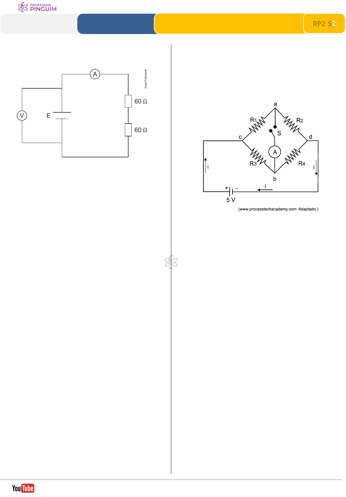 1 Extensivo de Física RP2 S2Revisão Parcial 2 ELETRODINÂMICA Circuitos Elétricos Resoluções em vídeo ► professorpinguim.com.br /profpinguim 1. (Uerj) O circuito abaixo representa uma instalação elétrica, sendo a corrente registrada no amperímetro A igual a 100 mA. A tensão elétrica, em volts, indicada no voltímetro V, é igual a: a) 8 b) 10 c) 12 d) 14 2. (Famerp) Um circuito semelhante ao da imagem pode ser encontrado em alguns termômetros digitais. Nele, estão ligados uma bateria de 5 V, um amperímetro, A, e 4 resistores, 1 2 3R , R , R e 4R , de resistências elétricas 5 ,10 , 25Ω Ω Ω e 50 ,Ω respectivamente. Quando a chave S é ligada, o circuito é chamado de ponte de Wheatstone. a) Com a chave S desligada, qual é a resistência equivalente, em ohms, do circuito? Qual é a intensidade da corrente total, i, que o atravessa, em ampères? b) Considere que esses resistores foram trocados por outros 4 resistores de valores desconhecidos e que a chave S foi ligada. Percebeu-se, então, que o amperímetro mediu uma corrente de valor nulo, ou seja, que não passava corrente entre os pontos a e b do circuito. Prove que, nesta nova condição, os valores dos novos resistores estão relacionados por 1 4 2 3R R R R .⋅ = ⋅ https://youtube.com/profpinguim https://professorpinguim.com.br https://youtube.com/profpinguim 2 Extensivo de Física RP2 S2Revisão Parcial 2 ELETRODINÂMICA Circuitos Elétricos Resoluções em vídeo ► professorpinguim.com.br /profpinguim 3. (Unifesp) Um circuito elétrico é composto por uma bateria, de força eletromotriz ε e resistência interna Ri, e por três resistores, R1, R2 e R3, como ilustrado na figura. A intensidade da corrente elétrica que se estabelece no resistor R1 é igual a 0,25 A. a) Considerando a resistência elétrica dos resistores R2 e R3 respectivamente iguais a 200 Ω e 50 ,Ω calcule a diferença de potencial, em volts, entre os terminais do resistor R3 e determine a intensidade da corrente elétrica, em amperes, que nele se estabelece. b) Sabendo que a força eletromotriz da bateria é 12,0 V e que a diferença de potencial entre os pontos A e B, indicados na figura, é de 11,9 V, calcule o valor da resistência interna da bateria, em ohms, e determine a potência dissipada na forma de calor, em watts, pela bateria. 4. (Eear) O circuito abaixo é constituído de uma fonte de alimentação ideal, 4 resistores ôhmicos e um amperímetro ideal. O circuito apresenta também um dispositivo composto de uma barra condutora, de resistência elétrica nula, que normalmente fica afastada. Mas se o dispositivo for acionado, a barra irá encostar nos pontos A, B e C ao mesmo tempo, colocando-os em contato. Nas condições iniciais, o amperímetro indica um determinado valor de intensidade de corrente elétrica. Assinale a alternativa que apresenta o valor da resistência elétrica R, em ohms, para que a indicação no amperímetro não se altere, quando o dispositivo for acionado. a) 25 b) 50 c) 100 d) 150 https://youtube.com/profpinguim https://professorpinguim.com.br https://youtube.com/profpinguim 3 Extensivo de Física RP2 S2Revisão Parcial 2 ELETRODINÂMICA Circuitos Elétricos Resoluções em vídeo ► professorpinguim.com.br /profpinguim 5. (Famerp) Quatro baterias ideais e idênticas são associadas em série e ligadas a um condutor de comprimento 2,0 m e área da secção transversal 7 21,2 10 m ,−× enrolado em forma de espiral, como mostra a figura. Nesse circuito, a diferença de potencial que se estabelece entre as extremidades do condutor é de 12 V e a intensidade da corrente elétrica que o atravessa é de 1,5 A. a) Determine a força eletromotriz de cada bateria, em volts, e a intensidade da corrente elétrica que a atravessa, em ampères. b) Calcule a resistência elétrica do condutor, em ohms, e a resistividade do material que o constitui, em m.Ω ⋅ 6. (Fgv) O esquema representa um circuito elétrico composto por uma bateria ideal de força eletromotriz ε e três pequenas lâmpadas incandescentes idênticas. Supondo que as resistências das lâmpadas sejam constantes, se o circuito for interrompido no ponto P, o brilho a) de 1L aumentará e o de 2L diminuirá. b) de 1L e 2L aumentarão. c) de 1L e 2L não se alterarão. d) de 1L diminuirá e o de 2L aumentará. e) de 1L diminuirá e o de 2L não se alterará. https://youtube.com/profpinguim https://professorpinguim.com.br https://youtube.com/profpinguim 4 Extensivo de Física RP2 S2Revisão Parcial 2 ELETRODINÂMICA Circuitos Elétricos Resoluções em vídeo ► professorpinguim.com.br /profpinguim 7. (Insper) No circuito ideal esquematizado na figura, o gerador fornece uma tensão contínua de 200 V. As resistências dos resistores ôhmicos são 1 3R R 20 ,= = Ω 2R 60= Ω e a capacitância do capacitor é 6C 2,0 10 F.−= ⋅ Nessas condições, a quantidade de carga acumulada no capacitor será, em C, igual a a) 32,4 10 .−⋅ b) 42,4 10 .−⋅ c) 31,2 10 .−⋅ d) 41,2 10 .−⋅ e) 32,0 10 .−⋅ 8. (Esc. Naval) Considere o circuito elétrico esquematizado na figura abaixo. Sabendo que os pontos F e C são mantidos em aberto, calcule a diferença de potencial entre os pontos G e C G C(V V )− e assinale a opção correta. a) – 14 V b) – 16 V c) – 20 V d) – 24 V e) – 26 V https://youtube.com/profpinguim https://professorpinguim.com.br https://youtube.com/profpinguim