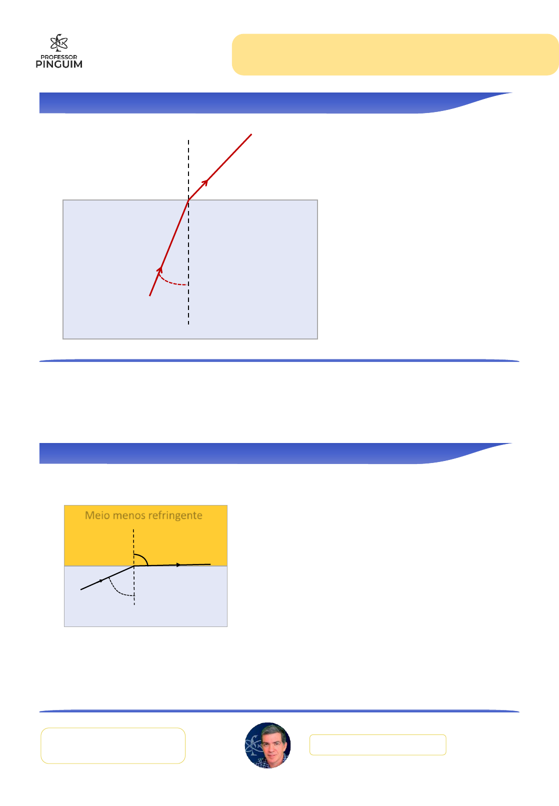 Óptica Ext I 21.3 – ângulo Limite. Reflexão Total 1professorpinguim.com.brComplete com o VÍDEO da Plataforma Reflexão Total N Meio mais refringente Meio menos refringente i1 Reflexão Total Cálculo do ângulo Limite 𝒓 = 𝟗𝟎 ° Meio mais refringente Meio menos refringente 𝒊 = 𝑳 1 2 Óptica Ext I 21.3 – ângulo Limite. Reflexão Total 2professorpinguim.com.brComplete com o VÍDEO da Plataforma Reflexão Total Luz vai no sentido do meio mais refringente para o meio menos refringente. Ângulo de incidência deve ser maior que o ângulo limite: i > L Condições para ocorrer Reflexão Total Se i < 50 30 Se i = 50 50 Se i > 50 ocorre 60 L 50Ângulo-Limite para o dioptro ar-água: Água Água Água Ar Ar Ar Reflexão Total 3 4 Óptica Ext I 21.3 – ângulo Limite. Reflexão Total 3professorpinguim.com.brComplete com o VÍDEO da Plataforma Fibra óptica Várias reflexões totais. O núcleo é mais refringente que a casca. Núcleo de vidro Casca de vidro Exercício ► Reflexão Total A figura a seguir mostra quatro raios de luz monocromática incidindo na superfície de separação entre o ar e o meio transparente X. Dados: nx = 2,0 e nar =1,0. a) Calcule o ângulo-limite, L, para esse dioptro. b) Represente as trajetórias dos raios logo após a incidência na superfície que separa o meio A do ar. 5 6 Óptica Ext I 21.3 – ângulo Limite. Reflexão Total 4professorpinguim.com.brComplete com o VÍDEO da Plataforma Exercício ► Reflexão Total A figura a seguir mostra um esquema simplificado da secção transversal de uma fibra óptica de vidro (índice de refração absoluto n = 2 ) imersa no ar. Um raio de luz monocromática incide num dos extremos da fibra com ângulo de incidência i = 45º. Prove que o raio de luz sofre reflexão total no ponto B e permanece no interior da fibra. Exercício ► Reflexão Total (Ufscar) O prisma da figura está colocado no ar e o material de que é feito tem um índice de refração igual a 2. Os ângulos A são iguais a 30°. Considere dois raios de luz incidentes perpendiculares à face maior. a) Calcule o ângulo com que os raios emergem do prisma. b) Qual deve ser o índice de refração do material do prisma para que haja reflexão total nas faces OA? 7 8