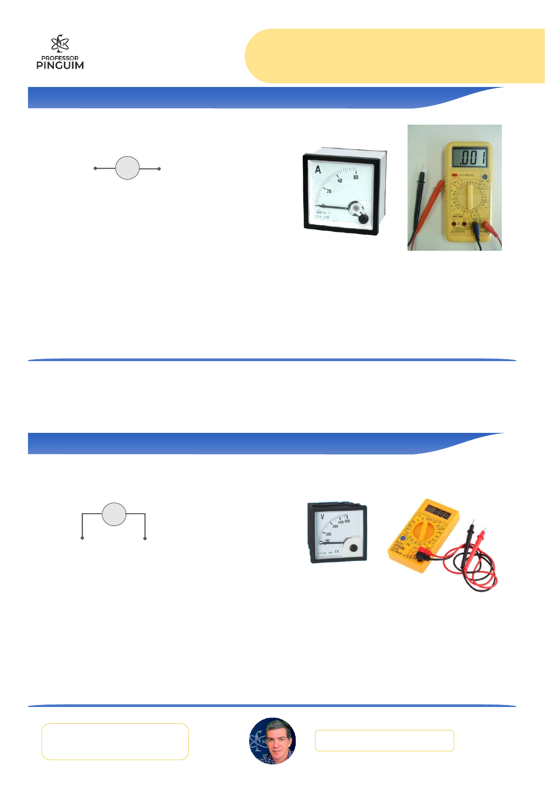 Eletrodinâmica I Ext E 14.6 – Instrumentos de Medida. Amperímetro. Voltímetro. Ponte de Wheatstone 1professorpinguim.com.brComplete com o VÍDEO da Plataforma Amperímetro A Aparelho que mede a corrente elétrica Voltímetro V Aparelho que mede a tensão elétrica (ddp) entre dois pontos 1 2 Eletrodinâmica I Ext E 14.6 – Instrumentos de Medida. Amperímetro. Voltímetro. Ponte de Wheatstone 2professorpinguim.com.brComplete com o VÍDEO da Plataforma Ponte de Wheatstone A B i 𝑹𝟏 𝑹𝟐 𝑹𝟑𝑹𝟒 C D A Se não passar corrente pelo amperímetro, a ponte está em equilíbrio. Bateria i Pode ser usado como Ohmímetro Exercício (Cesgranrio) Qual das opções a seguir mostra a ligação adequada de um amperímetro A e de um voltímetro V, ambos ideais, de modo a permitir uma correta medida da corrente e da queda de tensão no resistor? 3 4 Eletrodinâmica I Ext E 14.6 – Instrumentos de Medida. Amperímetro. Voltímetro. Ponte de Wheatstone 3professorpinguim.com.brComplete com o VÍDEO da Plataforma Exercício (Enem PPL) Um eletricista precisa medir a resistência elétrica de uma lâmpada. Ele dispõe de uma pilha, de uma lâmpada (L), de alguns fios e de dois aparelhos: um voltímetro (V), para medir a diferença de potencial entre dois pontos, e um amperímetro (A), para medir a corrente elétrica. O circuito elétrico montado pelo eletricista para medir essa resistência é Exercício 5 6 Eletrodinâmica I Ext E 14.6 – Instrumentos de Medida. Amperímetro. Voltímetro. Ponte de Wheatstone 4professorpinguim.com.brComplete com o VÍDEO da Plataforma Exercício 7