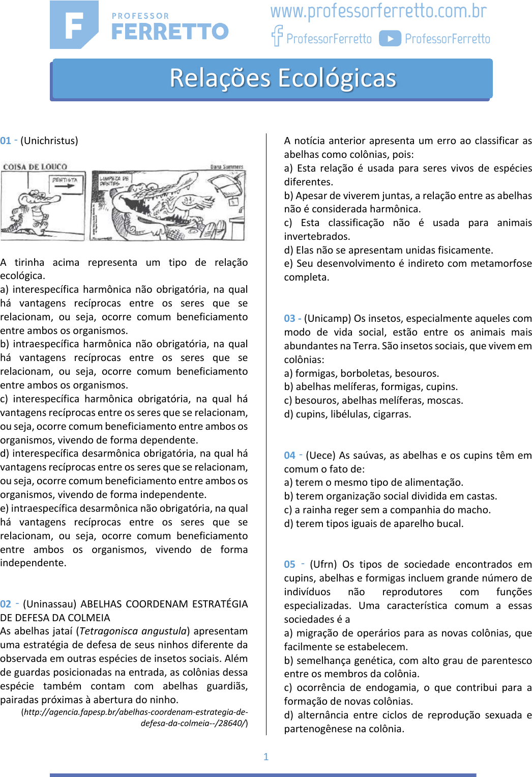 1 01 - (Unichristus) A tirinha acima representa um tipo de relação ecológica. a) interespecífica harmônica não obrigatória, na qual há vantagens recíprocas entre os seres que se relacionam, ou seja, ocorre comum beneficiamento entre ambos os organismos. b) intraespecífica harmônica não obrigatória, na qual há vantagens recíprocas entre os seres que se relacionam, ou seja, ocorre comum beneficiamento entre ambos os organismos. c) interespecífica harmônica obrigatória, na qual há vantagens recíprocas entre os seres que se relacionam, ou seja, ocorre comum beneficiamento entre ambos os organismos, vivendo de forma dependente. d) interespecífica desarmônica obrigatória, na qual há vantagens recíprocas entre os seres que se relacionam, ou seja, ocorre comum beneficiamento entre ambos os organismos, vivendo de forma independente. e) intraespecífica desarmônica não obrigatória, na qual há vantagens recíprocas entre os seres que se relacionam, ou seja, ocorre comum beneficiamento entre ambos os organismos, vivendo de forma independente. 02 - (Uninassau) ABELHAS COORDENAM ESTRATÉGIA DE DEFESA DA COLMEIA As abelhas jataí (Tetragonisca angustula) apresentam uma estratégia de defesa de seus ninhos diferente da observada em outras espécies de insetos sociais. Além de guardas posicionadas na entrada, as colônias dessa espécie também contam com abelhas guardiãs, pairadas próximas à abertura do ninho. (http://agencia.fapesp.br/abelhas-coordenam-estrategia-de- defesa-da-colmeia--/28640/) A notícia anterior apresenta um erro ao classificar as abelhas como colônias, pois: a) Esta relação é usada para seres vivos de espécies diferentes. b) Apesar de viverem juntas, a relação entre as abelhas não é considerada harmônica. c) Esta classificação não é usada para animais invertebrados. d) Elas não se apresentam unidas fisicamente. e) Seu desenvolvimento é indireto com metamorfose completa. 03 - (Unicamp) Os insetos, especialmente aqueles com modo de vida social, estão entre os animais mais abundantes na Terra. São insetos sociais, que vivem em colônias: a) formigas, borboletas, besouros. b) abelhas melíferas, formigas, cupins. c) besouros, abelhas melíferas, moscas. d) cupins, libélulas, cigarras. 04 - (Uece) As saúvas, as abelhas e os cupins têm em comum o fato de: a) terem o mesmo tipo de alimentação. b) terem organização social dividida em castas. c) a rainha reger sem a companhia do macho. d) terem tipos iguais de aparelho bucal. 05 - (Ufrn) Os tipos de sociedade encontrados em cupins, abelhas e formigas incluem grande número de indivíduos não reprodutores com funções especializadas. Uma característica comum a essas sociedades é a a) migração de operários para as novas colônias, que facilmente se estabelecem. b) semelhança genética, com alto grau de parentesco entre os membros da colônia. c) ocorrência de endogamia, o que contribui para a formação de novas colônias. d) alternância entre ciclos de reprodução sexuada e partenogênese na colônia. www.professorferretto.com.br ProfessorFerretto ProfessorFerretto Relações Ecológicas 2 06 - (Uece) As abelhas, Apis mellifera, são insetos sociais que apresentam três castas: a rainha, os zangões e as operárias. As abelhas que são diploides e se diferenciam das demais por consumirem um tipo especial de alimento, geleia, constituem a(s) casta(s) a que pertence(m) a) os zangões. b) a rainha. c) as operárias. d) as operárias e a rainha. 07 - (Enem) Uma colônia de formigas inicia-se com uma rainha jovem que, após ser fecundada pelo macho, voa e escolhe um lugar para cavar um buraco no chão. Ali dará origem a milhares de formigas, constituindo uma nova colônia. As fêmeas geradas poderão ser operárias, vivendo cerca de um ano, ou novas rainhas. Os machos provêm de óvulos não fertilizados e vivem aproximadamente uma semana. As operárias se dividem nos trabalhos do formigueiro. Há formigas forrageadoras que se encarregam da busca por alimentos, formigas operárias que retiram dejetos da colônia e são responsáveis pela manutenção ou que lidam com alimento e alimentam as larvas, e as formigas patrulheiras. Uma colônia de formigas pode durar anos e dificilmente uma formiga social consegui sobreviver sozinha. Uma característica que contribui diretamente para o sucesso da organização social dos formigueiros é a) A divisão de tarefas entre as formigas e a organização funcional da colônia. b) O fato de as formigas machos serem provenientes de óvulos não fertilizados. c) Alta taxa de mortalidade das formigas solitárias ou das que se afastam da colônia. d) A existência de patrulheiras, que protegem o formigueiro do ataque de herbívoros. e) O fato de as rainhas serem fecundadas antes do estabelecimento de um novo formigueiro. 08 - (Uel) O líquen é uma interação ecológica entre algas e fungos. Assinale a alternativa que apresenta apenas as relações corretas presentes neste tipo de associação. a) O fungo sintetiza nutrientes para a alga, enquanto a alga realiza a fotossíntese e retira água do fungo. b) O fungo retém água do substrato para a alga, enquanto a alga, por realizar a fotossíntese, fornece alimento para o fungo. c) O fungo retira água da alga, enquanto a alga realiza a fotossíntese e fornece o substrato para o fungo. d) A alga sintetiza nutrientes para o fungo, enquanto o fungo realiza fotossíntese e retira água da alga. e) A alga retém nutrientes do substrato para o fungo, enquanto o fungo, por realizar fotossíntese, fornece alimento para a alga. 09 - (Uece) Os liquens são seres amplamente distribuídos nas mais diversas regiões do globo. São reconhecidos como organismos pioneiros da sucessão ecológica, por sua capacidade de tolerar condições ambientais extremamente adversas e podem ser encontrados em superfícies de rochas, sobre folhas e troncos de árvores, no solo, ou mesmo sobrevivendo sobre outros liquens. Com 