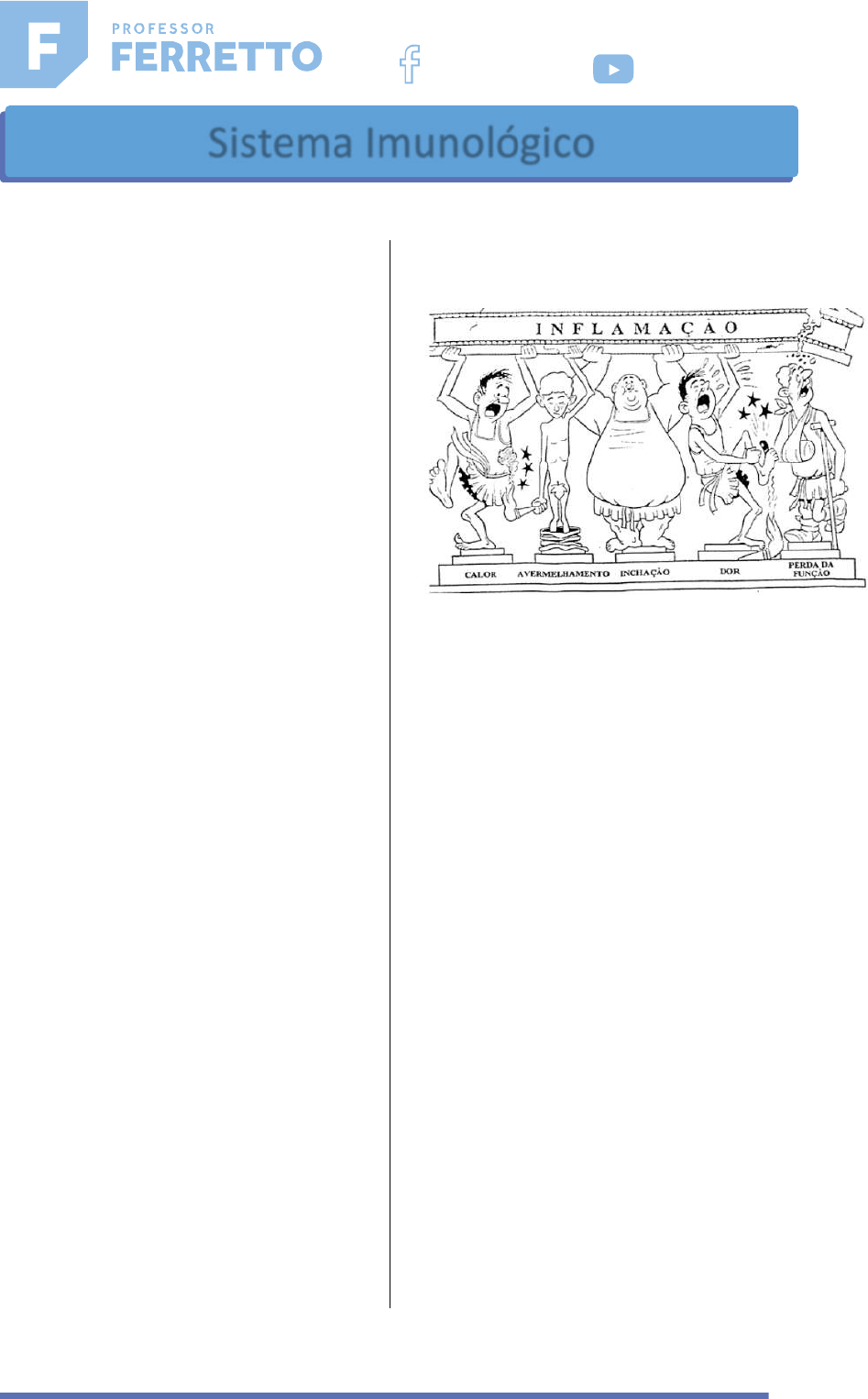 1 01 – (Fmj) Em um programa de auditório, Jorge, um participante que já assegurou a quantia de 500 mil reais, foi desafiado pelo apresentar a dobrar seu prêmio. Deveria, para isso, responder corretamente à seguinte pergunta: “Qual dos fenômenos citados que não pode ser considerado uma defesa do organismo contra a invasão de germes patogênicos?” Apesar de ter vastos conhecimentos gerais, biologia não é o forte de Jorge, e ele resolveu pedir ajuda a você. Ajude-o a ganhar um milhão de reais, assinalando a alternativa que corresponde corretamente à pergunta feita pelo apresentador: a) espirro. b) produção de ácido no estômago. c) produção de muco nas vias respiratórias. d) produção de hemácias na medula óssea. e) febre. 02 – (Ueg) O termo inflamação pode ser definido como a) o processo de instalação, multiplicação e dano tecidual pela ação de um determinado patógeno. b) a resposta do organismo contra diversos tipos de agentes lesivos, na tentativa de combatê-los e regenerar o tecido. c) a produção de anticorpos específicos contra microrganismos invasores no organismo hospedeiro. d) o estabelecimento de células tumorais em determinados tecidos, que originam o câncer. e) a reação da memória imunitária a uma exposição antigênica subsequente. 03 – (Unp) O processo inflamatório é um mecanismo que se desenvolve como resposta a uma agressão mecânica aos tecidos pela ação de um agente externo, como bactérias, por exemplo. Seu principal propósito é conter a infecção em uma zona determinada, impedindo que os microrganismos se dispersem pelo corpo. No processo inflamatório, quatro características que são marcantes. Assinale abaixo a alternativa que contempla essas quatro principais características da inflamação. a) Dor, presença de pus, vermelhidão e inchaço. b) Vasoconstrição, presença de pus, inchaço e dor. c) Vasodilatação, resfriamento localizado, inchaço e dor. d) Dor, calor localizado, vermelhidão e inchaço. 04 – (Uninassau) A charge a seguir mostra de forma cômica os efeitos do processo inflamatório: http://susipatologando.blogspot.com.br/2010/09/sinais-de- inflamacao.html Qual das alternativas a seguir explica de forma correta um desses processos? a) O aumento do metabolismo no local da lesão é o responsável pela sensação de calor percebida pelos corpúsculos de Ruffini. b) A liberação de histamina pelos plasmócitos promove a vasodilatação e o influxo de sangue para a área lesada, explicando assim a vermelhidão local. c) O edema é causado pelo aumento da permeabilidade dos vasos sanguíneos desencadeado pela liberação de heparina por plaquetas circulantes. d) A dor é percebida por porções dilatadas das fibras nervosas, chamadas de corpúsculos de Krause, localizados na derme. e) A perda de função local é decorrente da destruição de células lesadas pela ação fagocitária dos neutrófilos e humoral dos linfócitos. 05 – (Ufmg) Uma pancada na cabeça leva frequentemente à formação de um “galo” que pode ser explicado por a) extravasamento de plasma. b) formação de tecido cicatricial. c) formação de um calo ósseo. d) proliferação de células do tecido epitelial. www.professorferretto.com.br ProfessorFerretto ProfessorFerretto Sistema Imunológico ee 2 06 – (Uece) Uma pesquisa realizada pela Faculdade de Medicina de Ribeirão Preto (FMRP) da USP constatou que crianças que sofrem dores de cabeça com frequência apresentam mais problemas de comportamento, como retraimento, reação emocional e agressividade, quando comparadas a um grupo de crianças sem essas queixas. De acordo com a pesquisa, estas crianças também apresentam reação de desconforto em relação à intensidade de som, luz e movimento, que podem aparecer nos primeiros meses de vida, sendo um importante potencial indicador de dor de cabeça em fases posteriores do desenvolvimento. Disponível em: http://www.diariodopara.com.br/N-87478- DOR+DE+CABECA+PODE+AFETAR+COMPORTAMENTO+DA+CRIAN CA.html. A dor de cabeça, queixa frequente nos dias atuais, ocorre quando a) crianças em fase de desenvolvimento apresentam dificuldade de respiração, seguida de diminuição da pressão arterial. b) há o depósito de gordura nas artérias, como resultado de uma alimentação inadequada. c) um desequilíbrio metabólico produz substâncias tóxicas que se depositam na corrente sanguínea e provocam o aumento da pressão arterial. d) os vasos sanguíneos cerebrais ficam dilatados e pressionam os nervos. 07 – (Unifesp) Veja a tirinha seguinte, a respeito do processo febril. Calvin – Bill Watterson, adaptado. A temperatura de nosso corpo é considerada normal entre 36,0 e 37,3 ºC. Durante a febre, essa temperatura pode se elevar, chegando até mesmo a ultrapassar os 40°C. Sobre esse processo, é correto afirmar que: a) a elevação da temperatura corpórea se dá como resposta a um processo infeccioso e é produzida pela energia liberada na migração intensa de leucócitos e macrófagos para a área da infecção. b) a elevação da temperatura corpórea se dá por aumento da atividade das mitocôndrias e, caso essa elevação ultrapasse os 40°C, processos bioquímicos vitais serão comprometidos irreversivelmente. c) é um importante mecanismo de defesa, pois a elevação da temperatura aumenta a taxa de divisão celular e são produzidas mais células de defesa para combater a infecção. d) imediatamente antes de a temperatura se elevar, o corpo se resfria até alguns graus abaixo de 36,0 °C, o que causa calafrios. A morte do agente infeccioso se dá pelo choque térmico. e) nem sempre a febre representa aumento de temperatura. Isso ocorre nas infecções por vírus (gripes e febre amarela, por exemplo), mas não ocorre nas infecções por microorganismos (malária, por exemplo). 08 – (Fmj) Nosso corpo constitui um ambiente ideal para a proliferação de organismos invasivos, como vírus e bactérias. Duran