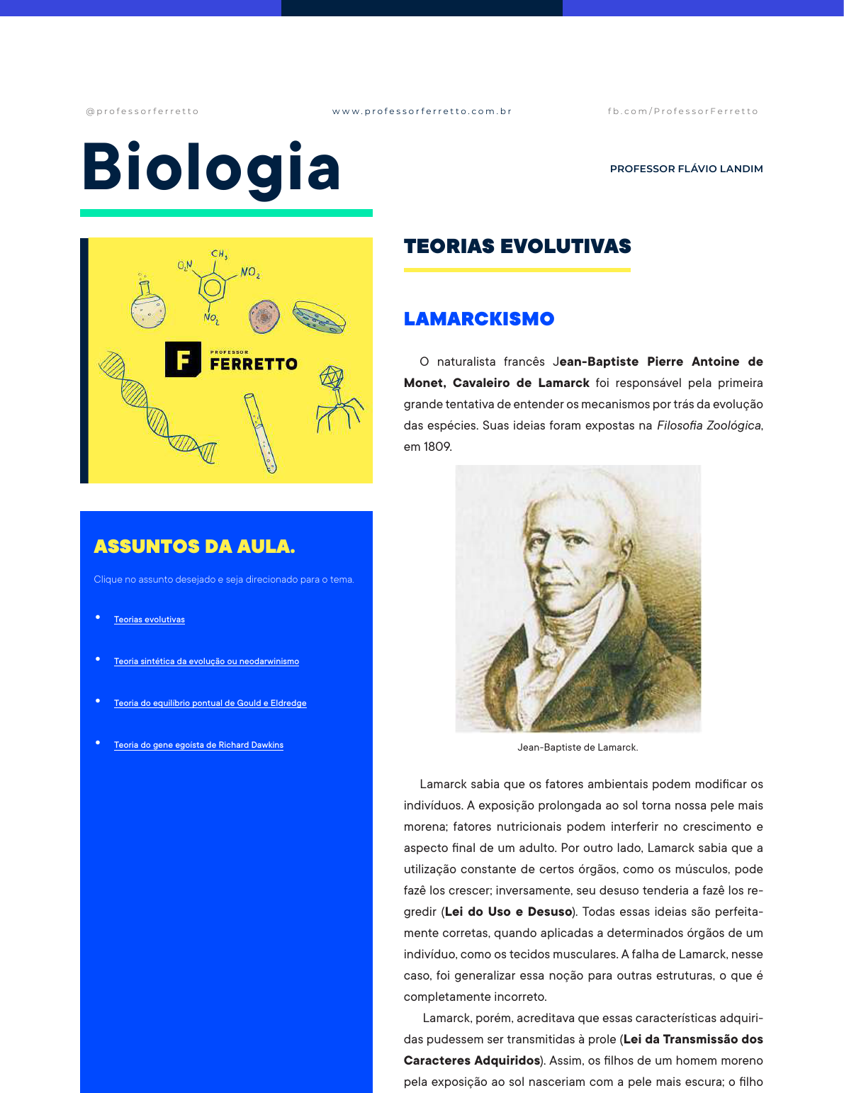 Biologia @p r o f e s s o r f e r r e t t o w w w . p r o f e s s o r f e r r e t t o . c om . b r f b . c om / P r o f e s s o r F e r r e t t o PROFESSOR FLÁVIO LANDIM ASSUNTOS DA AULA. • Teorias evolutivas • Teoria sintética da evolução ou neodarwinismo • Teoria do equilíbrio pontual de Gould e Eldredge • Teoria do gene egoísta de Richard Dawkins TEORIAS EVOLUTIVAS O naturalista francês Jean-Baptiste Pierre Antoine de Monet, Cavaleiro de Lamarck foi responsável pela primeira grande tentativa de entender os mecanismos por trás da evolução das espécies. Suas ideias foram expostas na Filosofia Zoológica, em 1809. LAMARCKISMO Lamarck sabia que os fatores ambientais podem modificar os indivíduos. A exposição prolongada ao sol torna nossa pele mais morena; fatores nutricionais podem interferir no crescimento e aspecto final de um adulto. Por outro lado, Lamarck sabia que a utilização constante de certos órgãos, como os músculos, pode fazê los crescer; inversamente, seu desuso tenderia a fazê los re- gredir (Lei do Uso e Desuso). Todas essas ideias são perfeita- mente corretas, quando aplicadas a determinados órgãos de um indivíduo, como os tecidos musculares. A falha de Lamarck, nesse caso, foi generalizar essa noção para outras estruturas, o que é completamente incorreto. Lamarck, porém, acreditava que essas características adquiri- das pudessem ser transmitidas à prole (Lei da Transmissão dos Caracteres Adquiridos). Assim, os filhos de um homem moreno pela exposição ao sol nasceriam com a pele mais escura; o filho Jean-Baptiste de Lamarck. Clique no assunto desejado e seja direcionado para o tema. 2 BIOLOGIA w w w.professor ferretto.com.br Apesar de ter oferecido uma explicação inadequada para a evolução das espécies, Lamarck foi essencial às ideias evolucionistas por dois motivos: - ofereceu a primeira explicação plausível para a evolução; - foi o primeiro a perceber que o meio ambiente e a adaptação a ele são o que impulsiona a transformação das espécies. de um homem com músculos desenvolvidos adquiriria, por sua vez, melhor estrutura muscular. Nesse ponto, Lamarck es- tava totalmente errado. O meio ambiente, de fato, provoca mudanças de fenótipo nos organismos; porém foi comprovado experimentalmente, no começo do século, que as mudanças adquiridas não passam à prole. Lamarck chegou até mesmo a admitir que a necessidade de uma característica acabaria determinando seu aparecimento, sendo que sua inuti- lidade a faria desaparecer. A necessidade que certos peixes tinham de respirar ar atmosférico no período da seca teria feito aparecer pulmões; esses teriam permanecido nos descendentes, que ficavam mais tempo no meio terrestre. As brânquias teriam finalmente desaparecido, já que no ar não eram utilizadas. Por raciocínios semelhantes a esse, Lamarck explicava a origem das novas espécies. O lamarckismo parece extremamente "lógico" ao leigo; afirmações como "o uso de alimentos cozidos a amolecidos enfra- quece cada vez mais certos dentes, que tenderão a desaparecer com o decorrer do tempo", ou então, "os insetos se acos- tu-mam gradativamente ao DDT a adquirem resistência contra ele", são muitas vezes consideradas corretas por terem uma aparência de "lógica", sendo no entanto francamente lamarckistas. Foi demonstrado experimentalmente por August Weissmann que características adquiridas não são transmissíveis. Esse pesquisador cortou, por várias gerações, os rabos dos camundongos que usava como reprodutores. Os descendentes, apesar dis-so, continuavam apresentando caudas. Lamarck também resgatou a ideia de Aristóteles da Scala Naturae. Segundo esse princípio, a natureza apresenta uma hi- erarquia, um impulso inerente aos seres vivos de sempre se aperfeiçoar, a partir dos microorganismos, até atingir o ápice com a humanidade (mais ou menos como se "o sonho de uma bactéria fosse virar um humano”...). Aristóteles, entretanto, acredita- va no fixismo, e que as formas mais simples surgiam por geração espontânea, enquanto Lamarck acreditava que a evolução era a responsável por produzir esse efeito. Hoje se sabe que essa ideia não faz o menor sentido, uma vez que a evolução dos seres vivos não é um processo proposital, intencional. Ou seja, que não há direção para a evolução. Não há um impulso em microorganismos que os faça desejar ser mais complexos. Uma bactéria não tem intenção de um dia virar um humano... Princípios lamarckistas: - Lei do Uso e do Desuso - Herança dos Caracteres Adquiridos - Tendência inevitável ao aumento de complexidade Observação: Apesar de as ideias lamarckistas estarem, a princípio, incorretas, hoje se sabe que em algumas situações, a herança dos caracteres adquiridos pode ocorrer, o que se dá através de fenômenos de epigenética. Epigenética é um termo usado na biologia para se referir a características genéticas que são estáveis ao longo de diversas divisões celulares mas que não envolvem mudanças na sequência de bases nitrogenadas no material genético do organismo (ou seja, não são mutações), mas sim ativação ou inativação de genes. Assim, uma característica epigenética pode ser determinada por fatores ambientais, os quais levam a ativação ou ina- tivação de um gene, podendo ter efeito hereditário, uma vez que o gene em questão pode ser transmitidos às gerações seguintes já ativado ou inativado. Por exemplo, foi descoberto há alguns anos que descendentes de sobreviventes de campos de concentração da 2ª Guer- ra Mundial já nasciam previamente estressados. De alguma maneira, as condições estressantes às quais os prisioneiros eram submetidos ativavam gene relacionados ao estresse, ou quais eram transmitidos já ativados aos descendentes dos mesmos 3 w w w.professor ferretto.com.br PROFESSOR L ANDIM Tome nota: que, mesmo não passando por situ- ações tão extremas, já nasciam previa- mente estr