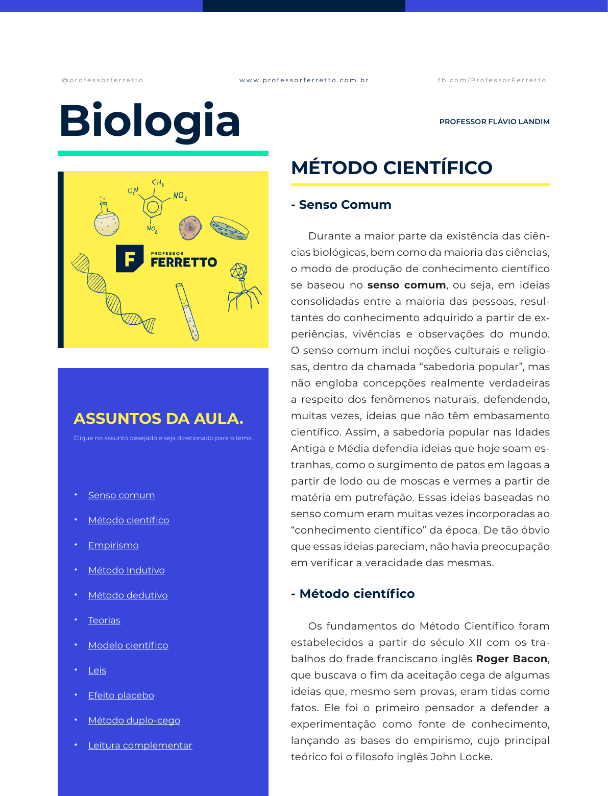 Biologia @ p r o f e s s o r f e r r e t t o w w w . p r o f e s s o r f e r r e t t o . c o m . b r f b . c o m / P r o f e s s o r F e r r e t t o PROFESSOR FLÁVIO LANDIM MÉTODO CIENTÍFICO - Senso Comum Durante a maior parte da existência das ciên- cias biológicas, bem como da maioria das ciências, o modo de produção de conhecimento científico se baseou no senso comum, ou seja, em ideias consolidadas entre a maioria das pessoas, resul- tantes do conhecimento adquirido a partir de ex- periências, vivências e observações do mundo. O senso comum inclui noções culturais e religio- sas, dentro da chamada “sabedoria popular”, mas não engloba concepções realmente verdadeiras a respeito dos fenômenos naturais, defendendo, muitas vezes, ideias que não têm embasamento científico. Assim, a sabedoria popular nas Idades Antiga e Média defendia ideias que hoje soam es- tranhas, como o surgimento de patos em lagoas a partir de lodo ou de moscas e vermes a partir de matéria em putrefação. Essas ideias baseadas no senso comum eram muitas vezes incorporadas ao “conhecimento científico” da época. De tão óbvio que essas ideias pareciam, não havia preocupação em verificar a veracidade das mesmas. - Método científico Os fundamentos do Método Científico foram estabelecidos a partir do século XII com os tra- balhos do frade franciscano inglês Roger Bacon, que buscava o fim da aceitação cega de algumas ideias que, mesmo sem provas, eram tidas como fatos. Ele foi o primeiro pensador a defender a experimentação como fonte de conhecimento, lançando as bases do empirismo, cujo principal teórico foi o filosofo inglês John Locke. ASSUNTOS DA AULA. • Senso comum • Método científico • Empirismo • Método Indutivo • Método dedutivo • Teorias • Modelo científico • Leis • Efeito placebo • Método duplo-cego • Leitura complementar Clique no assunto desejado e seja direcionado para o tema. Tome nota: 2 biologia w w w.professor ferretto.com.br Empirismo O empirismo pode ser descrito como uma doutrina filosófica que acredita que as experiências humanas, incluindo as observações feitas pelo homem, são as únicas responsáveis pela formação das ideias e pelo conhecimento científico. A limitação mais séria do empirismo é que a interpretação e as conclusões advindas de uma experiência ou observação individual podem ser errôneas e influenciadas por fatores pessoais, de modo que uma mesma experiência pode resultar em conclusões diferentes por partes de indivíduos diferentes. Segundo as noções empíricas, não haveria um conhecimento universal, uma vez que o conhecimento científico seria resultante da interpretação de fenômenos naturais com base em observações e experiências pessoais. O termo “leis empíricas” é muito utilizado em ciências exatas para descrever expressões matemáticas que sintetizam uma série de resultados observados em diver- sos ensaios, sem que seja necessário dispor de uma explicação de porquê ou como os processos descritos se sustentam. No século XVII, Francis Bacon deu um caráter mais funcional às ideias do Método Científico, afirmando que apenas a investigação científica poderia garantir o desenvolvimento do homem e o domínio do mesmo sobre a natureza, pregando uma nova abordagem na investigação científi- ca que pregava o raciocínio indutivo. 3 w w w.professor ferretto.com.br professor l andim Método indutivo O método indutivo é aquele que parte de observações particulares até chegar a conclusões generalizadas, permitindo que se extraia uma verdade geral a partir de um grupo particular. Por exemplo, se o homem X é mortal, o homem Y é mortal e o homem Z é mortal, pode-se concluir que todos os homens são mortais. A limitação do método indutivo é bastante óbvia: quantas repetições de uma observação se deve ter para se concluir que se pode extrair daí uma regra universal? Sempre há a possibilidade de uma exceção que tornaria a regra nula. Por esse motivo, o uso desse método é bastante questionável em algumas áreas das Ciências Naturais, mas muito válido dentro de Ciências Matemáticas. Método dedutivo O método dedutivo é aquele que parte de observações gerais até chegar a uma conclusão particular. Por exemplo, se todos os homens são mortais, o homem X é mortal. Ainda no século XVII, René Descartes, com sua obra Discurso sobre o Método, defende que o conhecimento científico deve ser apoiado na razão e no rigor matemático, dentro de uma doutrina filosófica conhecida como racionalismo e descreve que qualquer explicação para um certo fenômeno só poderia ser aceita com comprovação experimental. É dele a conhecida ex- pressão “Penso, logo existo”, que coloca a razão como medida de todo o conhecimento. Descartes propôs a elaboração do conhecimento científico baseado na explicação matemática e racional dos fenômenos e sua mecanização. Segundo ele, para se compreender um todo, bastaria compreender suas partes, ideia que configura a dedução cartesiana. Só não se exige comprovação para um fato ou fenômeno, que se trata de uma verdade confirmada por simples observação, quando este é do tipo “o céu é azul” ou “uma vela apaga quando soprada” ou ainda “Biologia é a matéria mais divertida” (tá bom, eu admito, há algu- mas controvérsias para este último “fato”...). Para que a explicação dada a um fenômeno seja admitida como verdade científica ela precisa ser elaborada e confirmada dentro dos parâmetros do método científico. 4 BIOLOGIA w w w.professor ferretto.com.br O método científico utilizado atualmente é construído a partir dos trabalhos de vários pensadores é o método hipotético-dedutivo. Eis como trabalhar com ele: 1. Todo conhecimento científico começa com a observação de um fenômeno. A partir daí, determinado questionamento é feito. “Por que tal fenômeno ocorr