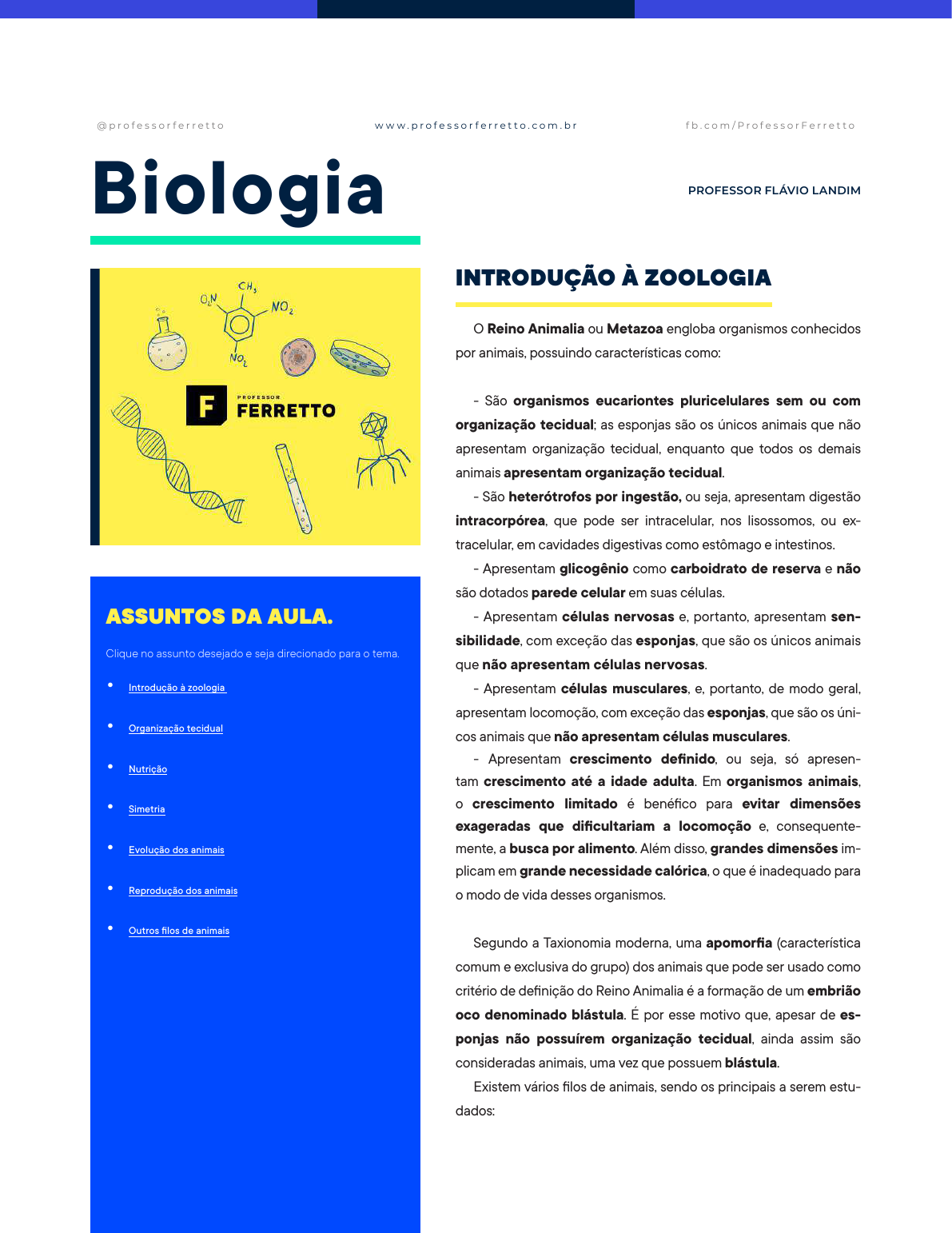 Biologia @p r o f e s s o r f e r r e t t o w w w . p r o f e s s o r f e r r e t t o . c om . b r f b . c om / P r o f e s s o r F e r r e t t o PROFESSOR FLÁVIO LANDIM ASSUNTOS DA AULA. • Introdução à zoologia • Organização tecidual • Nutrição • Simetria • Evolução dos animais • Reprodução dos animais • Outros filos de animais INTRODUÇÃO À ZOOLOGIA O Reino Animalia ou Metazoa engloba organismos conhecidos por animais, possuindo características como: - São organismos eucariontes pluricelulares sem ou com organização tecidual; as esponjas são os únicos animais que não apresentam organização tecidual, enquanto que todos os demais animais apresentam organização tecidual. - São heterótrofos por ingestão, ou seja, apresentam digestão intracorpórea, que pode ser intracelular, nos lisossomos, ou ex- tracelular, em cavidades digestivas como estômago e intestinos. - Apresentam glicogênio como carboidrato de reserva e não são dotados parede celular em suas células. - Apresentam células nervosas e, portanto, apresentam sen- sibilidade, com exceção das esponjas, que são os únicos animais que não apresentam células nervosas. - Apresentam células musculares, e, portanto, de modo geral, apresentam locomoção, com exceção das esponjas, que são os úni- cos animais que não apresentam células musculares. - Apresentam crescimento definido, ou seja, só apresen- tam crescimento até a idade adulta. Em organismos animais, o crescimento limitado é benéfico para evitar dimensões exageradas que dificultariam a locomoção e, consequente- mente, a busca por alimento. Além disso, grandes dimensões im- plicam em grande necessidade calórica, o que é inadequado para o modo de vida desses organismos. Segundo a Taxionomia moderna, uma apomorfia (característica comum e exclusiva do grupo) dos animais que pode ser usado como critério de definição do Reino Animalia é a formação de um embrião oco denominado blástula. É por esse motivo que, apesar de es- ponjas não possuírem organização tecidual, ainda assim são consideradas animais, uma vez que possuem blástula. Existem vários filos de animais, sendo os principais a serem estu- dados: Clique no assunto desejado e seja direcionado para o tema. 2 BIOLOGIA w w w.professor ferretto.com.br Observação: O termo “vermes” é um termo sem valor taxionômico que se refere a animais invertebrados (sem coluna vertebral) que apresentam corpo alongado, indepen- dentemente de causarem ou não doenças, correspondendo a platelmintos, nematelmintos e anelídeos. A classificação dos animais em filos envolve vários critérios, sendo alguns deles analisados a seguir: Alguns animais triblásticos, ou seja, que apresentam mesoderme, podem apresentar uma estrutura denominada celoma. O celoma é uma cavidade no embrião delimitada por mesoderme e contendo um líquido celomático com função de distribuição de gases e nutrientes pelo corpo do embrião e de agir como esqueleto hidrostático. Dentre os Triblásticos, podemos classificar os animais quanto à presença ou não de celoma em: - Acelomados, que não possuem celoma e, consequen- temente, possuem uma mesoderme maciça, corresponden- do aos platelmintos. Por não terem celoma, também não possuem líquido celomático e não possuem esqueleto hidrostático, de modo que o corpo não possui sustentação significativa e, por isso, possuem o corpo achatado (platel- mintos = vermes achatados). Quanto à organização tecidual, podemos dividir os ani- mais em 2 sub-reinos: Dentre os Eumetazoa, podemos classificar os animais em: - Sub-Reino Parazoa (parazoários), que corresponde aos animais sem organização tecidual, incluindo somente os poríferos; - Sub-Reino Eumetazoa (eumetazoários), que corresponde aos animais com organização tecidual, incluindo todos os demais animais. - Diblásticos (diploblásticos), que correspondem aos eu- metazoários que possuem somente 2 folhetos germinativos (teci- dos embrionários), ectoderme e endoderme, incluindo somente os cnidários; - Triblásticos (triploblásticos), que correspondem aos eu- metazoários que possuem 3 folhetos germinativos (tecidos embri- onários), ectoderme, mesoderme e endoderme, incluindo todos os demais animais eumetazoários. (1) Filo Porifera (poríferos), correspondendo às esponjas; (2) Filo Cnidaria (cnidários), correspondendo a águas-vivas, corais e anêmonas-do-mar; (3) Filo Platyhelminthes (platelmintos), correspondendo aos vermes de corpo achatado, como planárias, tênias e esquistossomos; (4) Filo Nematoda (nematelmintos), correspondendo aos vermes de corpo cilíndrico, como lombriga, amarelão e filária; (5) Filo Molusca (moluscos), correspondendo aos animais com concha, como caracóis e ostras, sendo que alguns per- deram as conchas no decorrer da evolução, como os polvos; (6) Filo Annelida (anelídeos), correspondendo aos vermes de corpo anelado, como minhocas e sanguessugas; (7) Filo Arthropoda (artrópodes), correspondendo aos animais de exoesqueleto e patas articuladas quitinosos, como insetos, aracnídeos e crustáceos; (8) Filo Echinodermata (equinodermos), correspondendo a animais marinhos com endoesqueleto calcário, como es- trelas-do-mar e ouriços-do-mar; (9) Filo Chordata, correspondendo aos animais que apresentam notocorda pelo menos na fase embrionária de vida, como os vertebrados. CELOMA ORGANIZAÇÃO TECIDUAL Acelomado. 3 w w w.professor ferretto.com.br PROFESSOR L ANDIM Tome nota: - Pseudocelomados, que possuem pseudoceloma (= falso celoma) delimitado por mesoderme e endoderme, correspondendo aos nematel- mintos. Por terem pseudoceloma, que tem características semelhantes às do celoma, possuem líquido pseudocelomático e possuem esqueleto hi- drostático, de modo que o corpo possui sustentação significativa e, por isso, possuem o corpo cilíndrico (nematelmintos = vermes cilíndricos). - Celomados, que possuem celoma verdadeiro delimitado ape