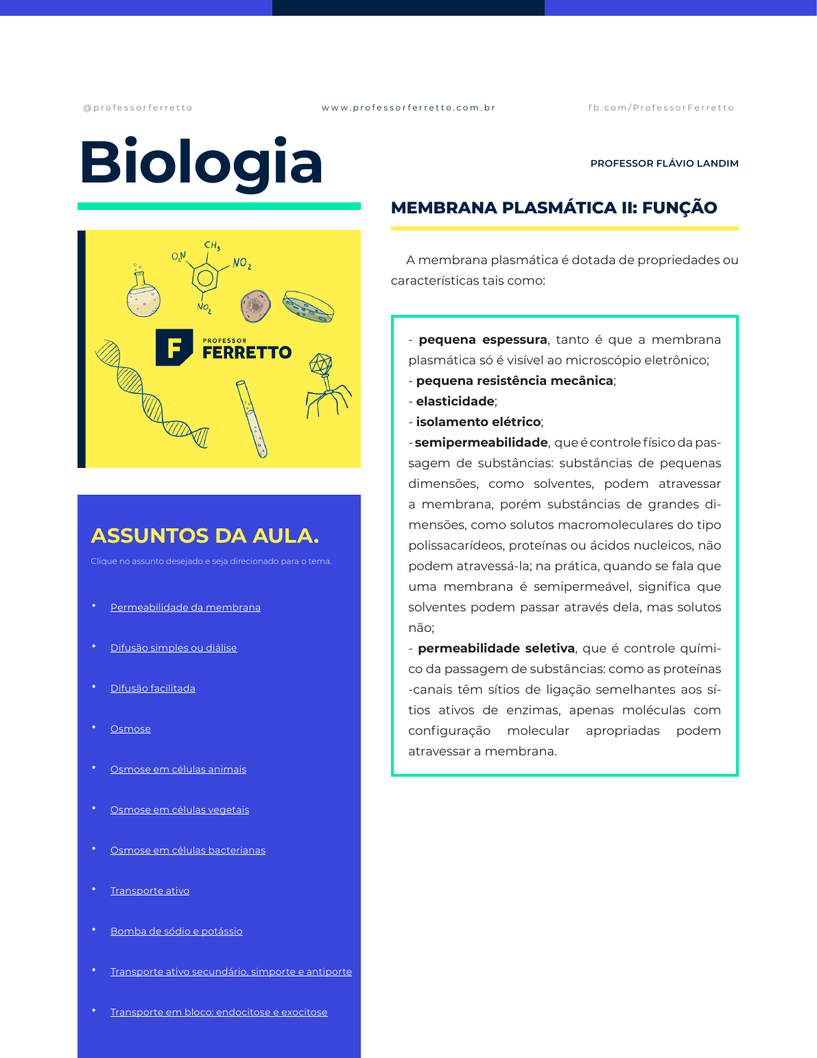 Biologia @ p r o f e s s o r f e r r e t t o w w w . p r o f e s s o r f e r r e t t o . c o m . b r f b . c o m / P r o f e s s o r F e r r e t t o PROFESSOR FLÁVIO LANDIM ASSUNTOS DA AULA. • Permeabilidade da membrana • Difusão simples ou diálise • Difusão facilitada • Osmose • Osmose em células animais • Osmose em células vegetais • Osmose em células bacterianas • Transporte ativo • Bomba de sódio e potássio • Transporte ativo secundário, simporte e antiporte • Transporte em bloco: endocitose e exocitose MEMBRANA PLASMÁTICA II: FUNÇÃO A membrana plasmática é dotada de propriedades ou características tais como: - pequena espessura, tanto é que a membrana plasmática só é visível ao microscópio eletrônico; - pequena resistência mecânica; - elasticidade; - isolamento elétrico; - semipermeabilidade, que é controle físico da pas- sagem de substâncias: substâncias de pequenas dimensões, como solventes, podem atravessar a membrana, porém substâncias de grandes di- mensões, como solutos macromoleculares do tipo polissacarídeos, proteínas ou ácidos nucleicos, não podem atravessá-la; na prática, quando se fala que uma membrana é semipermeável, significa que solventes podem passar através dela, mas solutos não; - permeabilidade seletiva, que é controle quími- co da passagem de substâncias: como as proteínas -canais têm sítios de ligação semelhantes aos sí- tios ativos de enzimas, apenas moléculas com configuração molecular apropriadas podem atravessar a membrana. Clique no assunto desejado e seja direcionado para o tema. Tome nota: 2 BIOLOGIA w w w.professor ferretto.com.br PERMEABILIDADE DA MEMBRANA Resumidamente: - Passam pela bicamada: substâncias apolares como lipídios, O2 e CO2, e substâncias polares não carregadas pequenas, como a água. - Passam pelas proteínas-canais e permeases: substâncias polares pequenas, carregadas eletrica- mente ou não, como aminoácidos, monossacarídeos e íons, além da própria água. Existem inclusive canais próprios para a passagem de água, sendo denominados aquaporinas. O hormônio antidi- urético (ADH) aumenta a reabsorção de água nos rins exatamente por agir sobre estas proteínas. Quanto aos aspectos energéticos do transporte, este pode ser por transporte passivo, isto é, sem gasto de energia pela célula (difusão, difusão facilitada e osmose), ou transporte ativo, com gasto de energia pela célula. A permeabilidade é o processo pelo qual as diversas substâncias podem atravessar a membrana plasmáti- ca. Em relação a este processo, é importante lidar com dois aspectos: a presença ou não de especificidade no processo e os processos energéticos relacionados a este transporte. O transporte através da membrana pode acontecer pela parte lipídica ou pela parte proteica. A parte lipídica permite a passagem de substâncias lipossolúveis, de variáveis dimensões, sendo que ela não exerce controle adequado em relação à entrada de tais substâncias. A entrada de substâncias lipos- solúveis é, pois, inespecífica. Lipídios e moléculas relacionadas com o éter, álcool, soluções anestésicas, etc. penetram sem maiores controles no interior da célula. Daí, por exemplo, a razão do rápido efeito do éter, álcool e demais substâncias citadas: como elas atravessam a membrana com facilidade, penetram de forma mais fácil na célula e seu efeito acontece com facilidade. Algumas moléculas hidrossolúveis também podem atravessar a parte lipídica da membrana. Entretanto, estas moléculas correspondem apenas a moléculas de dimensões muito reduzidas, como a água, por exemplo. Gases como O2 e CO2, por serem apolares e de dimensões reduzidas, também atravessam com facilidade a bicamada. O transporte através da parte proteica permite a passagem de substâncias hidrossolúveis e acontece de maneira bem mais elaborada, através de proteínas-canais ou poros e por permeases ou carreadores. Estas são moléculas de proteína integral com a forma de canais, permitindo a passagem de substâncias hidrossolúveis incapazes de atravessar a parte lipídica da membrana. Estes canais são específicos. Íons, como o cálcio e o magnésio, exercem considerável influência sobre a permeabilidade da mem- brana plasmática. Isto acontece porque eles se ligam aos canais proteicos, podendo aumentar ou diminuir sua afinidade com a molécula a ser transportada e, consequentemente, aumentando ou diminuindo a permeabilidade da membrana. Tome nota: 3 w w w.professor ferretto.com.br PROFESSOR L ANDIM DIFUSÃO SIMPLES OU DIÁLISE - Processos passivos acontecem a favor de um gradiente de concentração (do meio mais concentra- do para o meio menos concentrado) sendo processos espontâneos e exergônicos (exotérmicos, isto é, com liberação de energia; daí o motivo pelo qual a célula não gasta energia, esta é fornecida pelo próprio processo). Quanto menor o tamanho das partículas, quanto maior a temperatura do sistema e quanto maior a diferença de concentração entre os meios, maior a velocidade dos transportes passivos. - Processos ativos acontecem contra um gradiente de concentração (do meio menos concentrado para o mais concentrado), sendo processos não espontâneos e endergônicos (endotérmicos, isto é, com consumo de energia; daí o motivo pelo qual a célula gasta energia na forma de moléculas de ATP consumidas). Todas as moléculas são dotadas de energia e de um movimento ao acaso que é proporcionado por esta energia. Em soluções coloidais, que é a forma na qual encontramos a matéria viva, por exemplo, este movimento ao acaso é chamado movimento browniano. Devido a esse movimento, ocorre um fenômeno conhecido como difusão. A difusão é a passagem de moléculas de solu- to através de uma membrana permeável a elas, da região de maior concentração de soluto para a região de menor concentração de soluto, até as concentrações se igualare