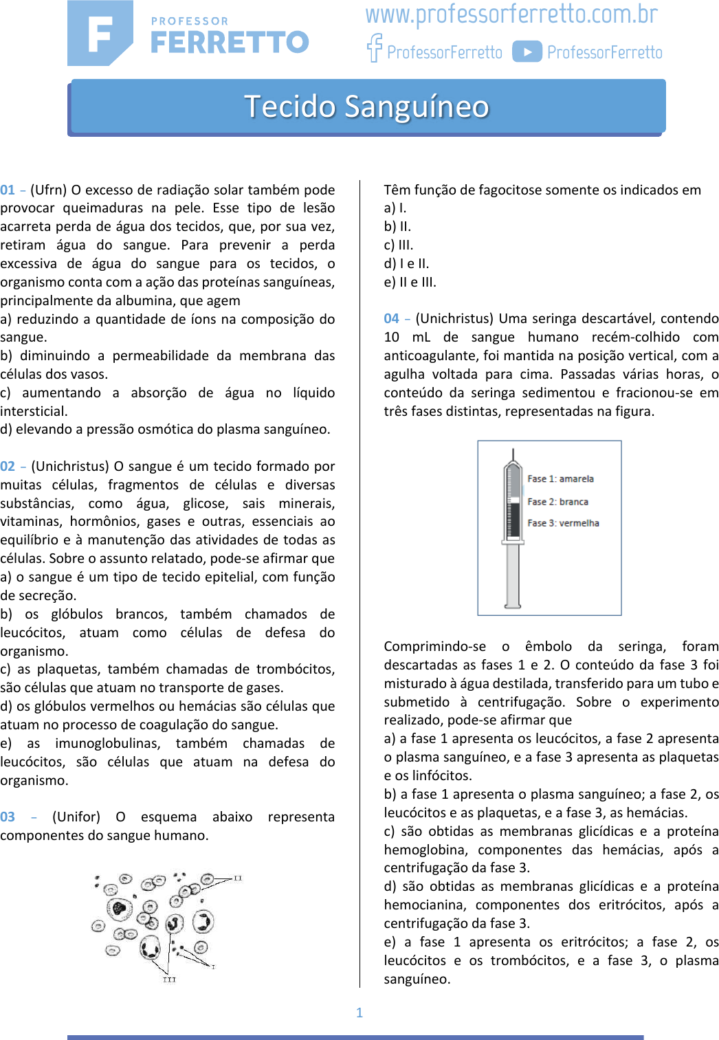 1 01 – (Ufrn) O excesso de radiação solar também pode provocar queimaduras na pele. Esse tipo de lesão acarreta perda de água dos tecidos, que, por sua vez, retiram água do sangue. Para prevenir a perda excessiva de água do sangue para os tecidos, o organismo conta com a ação das proteínas sanguíneas, principalmente da albumina, que agem a) reduzindo a quantidade de íons na composição do sangue. b) diminuindo a permeabilidade da membrana das células dos vasos. c) aumentando a absorção de água no líquido intersticial. d) elevando a pressão osmótica do plasma sanguíneo. 02 – (Unichristus) O sangue é um tecido formado por muitas células, fragmentos de células e diversas substâncias, como água, glicose, sais minerais, vitaminas, hormônios, gases e outras, essenciais ao equilíbrio e à manutenção das atividades de todas as células. Sobre o assunto relatado, pode-se afirmar que a) o sangue é um tipo de tecido epitelial, com função de secreção. b) os glóbulos brancos, também chamados de leucócitos, atuam como células de defesa do organismo. c) as plaquetas, também chamadas de trombócitos, são células que atuam no transporte de gases. d) os glóbulos vermelhos ou hemácias são células que atuam no processo de coagulação do sangue. e) as imunoglobulinas, também chamadas de leucócitos, são células que atuam na defesa do organismo. 03 – (Unifor) O esquema abaixo representa componentes do sangue humano. Têm função de fagocitose somente os indicados em a) I. b) II. c) III. d) I e II. e) II e III. 04 – (Unichristus) Uma seringa descartável, contendo 10 mL de sangue humano recém-colhido com anticoagulante, foi mantida na posição vertical, com a agulha voltada para cima. Passadas várias horas, o conteúdo da seringa sedimentou e fracionou-se em três fases distintas, representadas na figura. Comprimindo-se o êmbolo da seringa, foram descartadas as fases 1 e 2. O conteúdo da fase 3 foi misturado à água destilada, transferido para um tubo e submetido à centrifugação. Sobre o experimento realizado, pode-se afirmar que a) a fase 1 apresenta os leucócitos, a fase 2 apresenta o plasma sanguíneo, e a fase 3 apresenta as plaquetas e os linfócitos. b) a fase 1 apresenta o plasma sanguíneo; a fase 2, os leucócitos e as plaquetas, e a fase 3, as hemácias. c) são obtidas as membranas glicídicas e a proteína hemoglobina, componentes das hemácias, após a centrifugação da fase 3. d) são obtidas as membranas glicídicas e a proteína hemocianina, componentes dos eritrócitos, após a centrifugação da fase 3. e) a fase 1 apresenta os eritrócitos; a fase 2, os leucócitos e os trombócitos, e a fase 3, o plasma sanguíneo. www.professorferretto.com.br ProfessorFerretto ProfessorFerretto Tecido Sanguíneo 2 05 – (Enem) A produção de soro antiofídico é feita por meio da extração da peçonha de serpentes que, após tratamento, é introduzida em um cavalo. Em seguida são feitas sangrias para avaliar a concentração de anticorpos produzidos pelo cavalo. Quando essa concentração atinge o valor desejado, é realizada a sangria final para obtenção do soro. As hemácias são devolvidas ao animal, por meio de uma técnica denominada plasmaferese, a fim de reduzir os efeitos colaterais provocados pela sangria. Disponível em: http://www.infobibos.com. Acesso em: 28 abr. 2010 (adaptado). A plasmaferese é importante, pois, se o animal ficar com uma baixa quantidade de hemácias, poderá apresentar a) febre alta e constante. b) redução de imunidade. c) aumento da pressão arterial. d) quadro de leucemia profunda. e) problemas no transporte de oxigênio. 06 – (Unesp) Há vinte anos, casos incomuns de anemia começaram a chamar a atenção dos pesquisadores. Ao invés de adultos jovens, como habitualmente, eram os idosos que apresentavam uma expressiva redução na taxa de hemoglobina. Mais intrigante: a anemia dos idosos não cedia ao tratamento convencional. Analise as hipóteses apresentadas pelos cientistas para tentar explicar esses casos incomuns. I. A origem do problema estava relacionada à degeneração do baço, que nesses idosos deixou de produzir glóbulos vermelhos. II. A origem do problema estava na produção de glóbulos vermelhos a partir de células-tronco da medula óssea. III. A origem do problema estava na produção de glóbulos vermelhos pela medula espinhal. Considerando hipóteses plausíveis, isto é, aquelas possíveis de serem aceitas pela comunidade científica, estão corretas: a) I, apenas. b) II, apenas. c) III, apenas. d) I e II, apenas. e) I, II e III. 07 – (Enem) A eritropoetina (EPO) é um hormônio endógeno secretado pelos rins que influencia a maturação dos eritrócitos. Suas formas recombinantes, sintetizadas em laboratório, têm sido usadas por alguns atletas em esportes de resistência na busca por melhores resultados. No entanto, a administração da EPO recombinante no esporte foi proibida pelo Comitê Olímpico Internacional e seu uso considerado doping. MARTELLI, A. Eritropoetina: síntese e liberação fisiológica e o uso de sua forma recombinante no esporte. Perspectivas Online: biológicas & saúde, v. 10, n. 3, 2013 (adaptado). Uma influência que esse doping poderá exercer na melhoria da capacidade física desses atletas está relacionada ao transporte de a) lipídios, para aumento do gasto calórico. b) ATP, para aumento da síntese hormonal. c) oxigênio, para aumento da produção de ATP. d) proteínas, para aumento da massa muscular. e) vitamina C, para aumento da integridade dos vasos sanguíneos. 08 – (Fuvest) Jogadores de futebol que vivem em altitudes próximas à do nível do mar sofrem adaptações quando jogam em cidades de grande altitude. Algumas adaptações são imediatas, outras só ocorrem após uma permanência de pelo menos três semanas. Qual alternativa inclui as reações imediatas e as que podem ocorrer a longo prazo? a) Imediatas: aumentam a fr